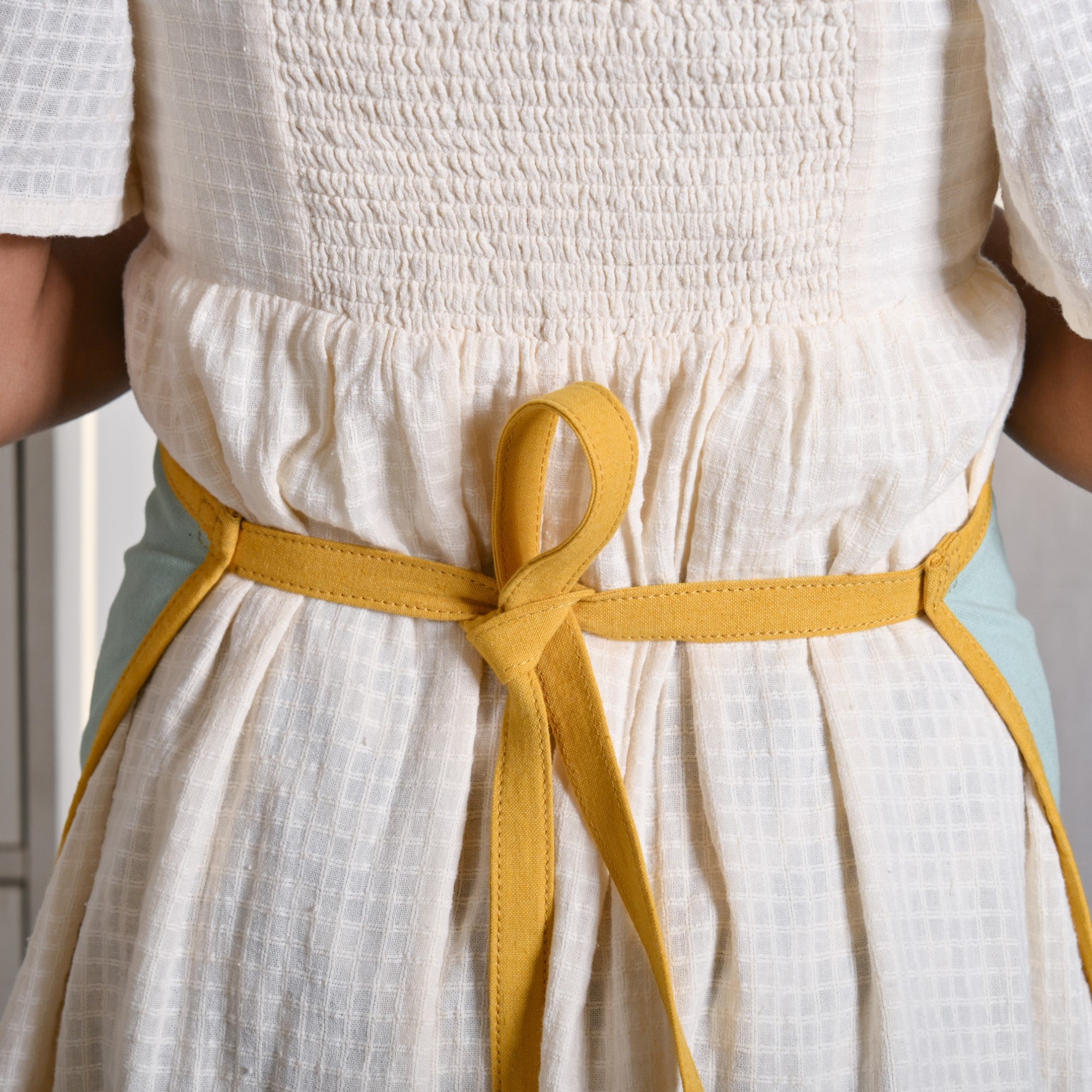 Apron with quilted front pocket in yellow