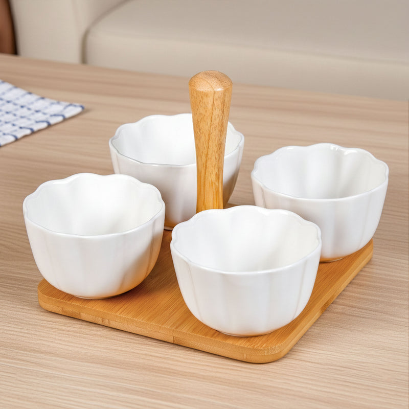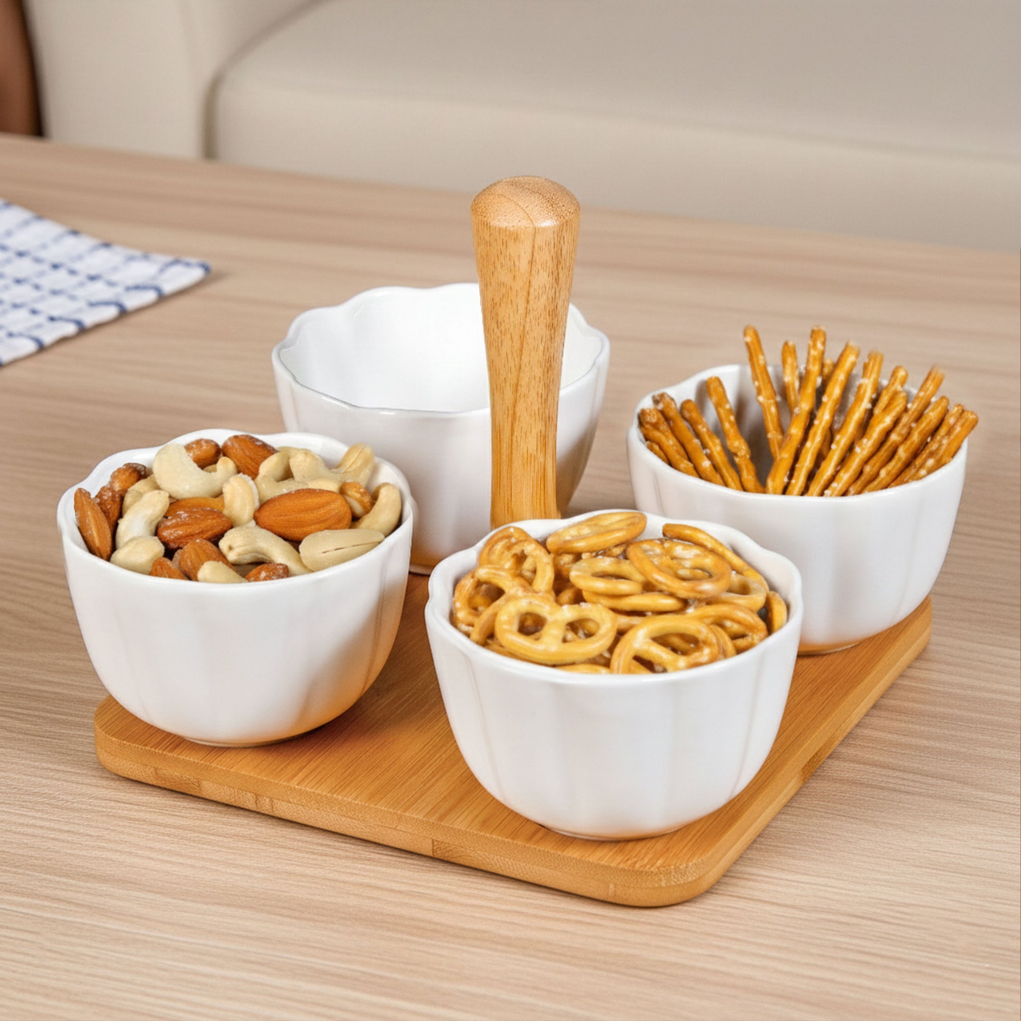 Design: This chic bamboo wood platter features four scalloped white ceramic bowls arranged around a central wooden handle. The bowls sit securely on the smooth, rectangular wooden base, creating a stylish, floral-inspired layout.