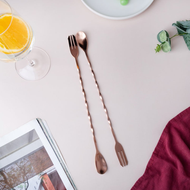 Bar spoon or cocktail with a long twisted handle to stir cocktails and other beverages with ease. The spoons carry long slender stems to help in the complete mixing of condiments and other components into the drink. The spoon features a lustrous rose gold colour to brighten up the table with a stylish element. The multipurpose long stemmed spoon has a fork on the other end which makes it easier to pick up fruits and solid add-ons in a beverage.