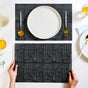 Design: Featuring a basket weave-inspired design, this set of black table mats combines modern geometric patterns with a sophisticated black tone, bringing a touch of elegance to your dining setup. Crafted from durable PVC, these placemats are built to withstand everyday use, making them both functional and stylish. The textured surface prevents slipping, ensuring that your plates and cutlery stay securely in place. With a contemporary design, these mats offer versatility, allowing you to switch up your style with ease while saving space and simplifying storage.