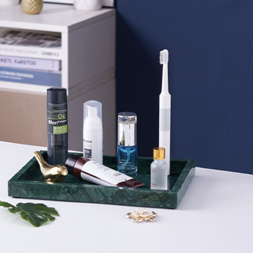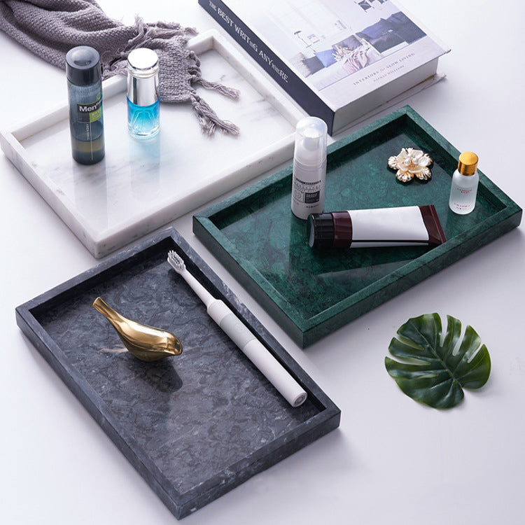 The solid marble tray has a rustic yet contemporary feel to it. The slightly raised edge makes it more sturdy. Use it in to keep toiletries and small hand towels for a chic look.