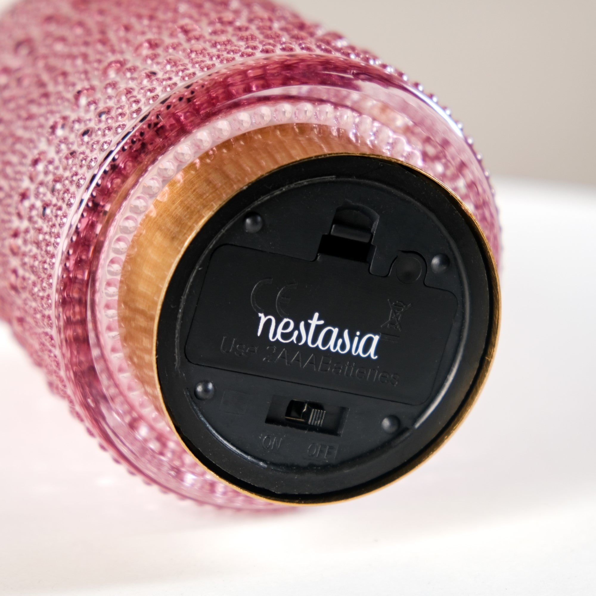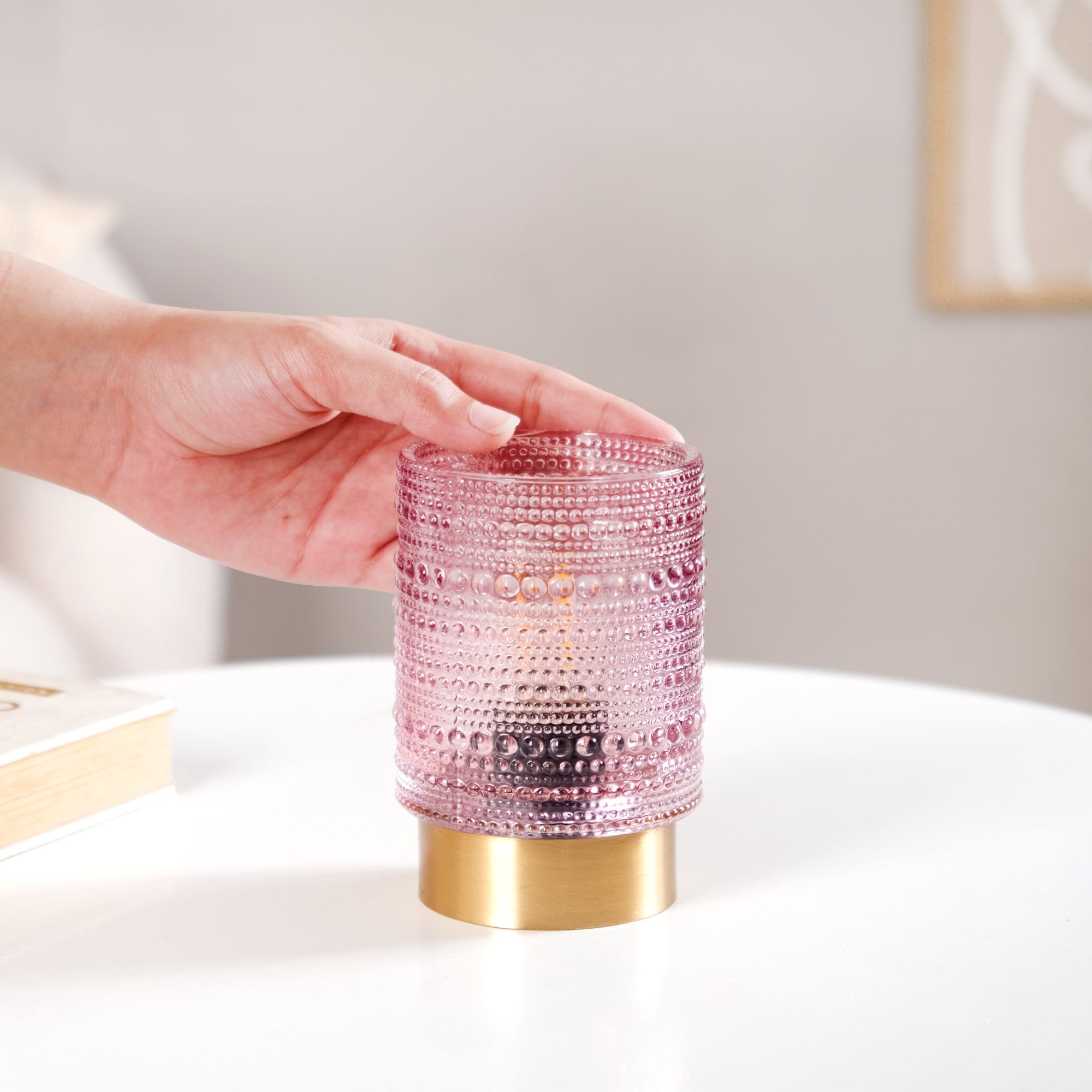 Design: The battery lamp features a striking purple-tinted soda-lime glass with textured bubble patterns, giving it a unique aesthetic that complements modern interiors. The bubble design enhances the light refraction, creating a beautiful effect when the lamp is lit. Its compact size makes it versatile, ideal for bedside tables, desks, or living room accents.