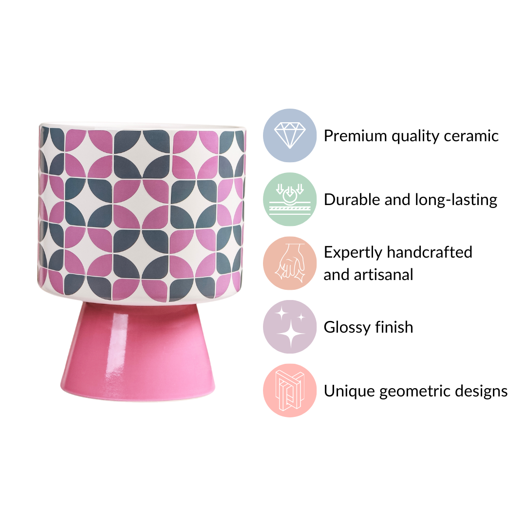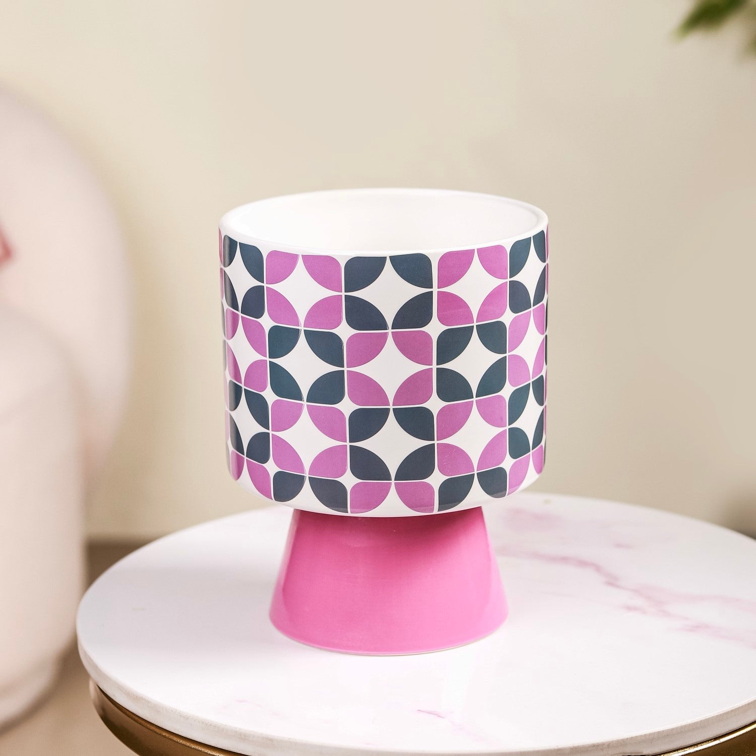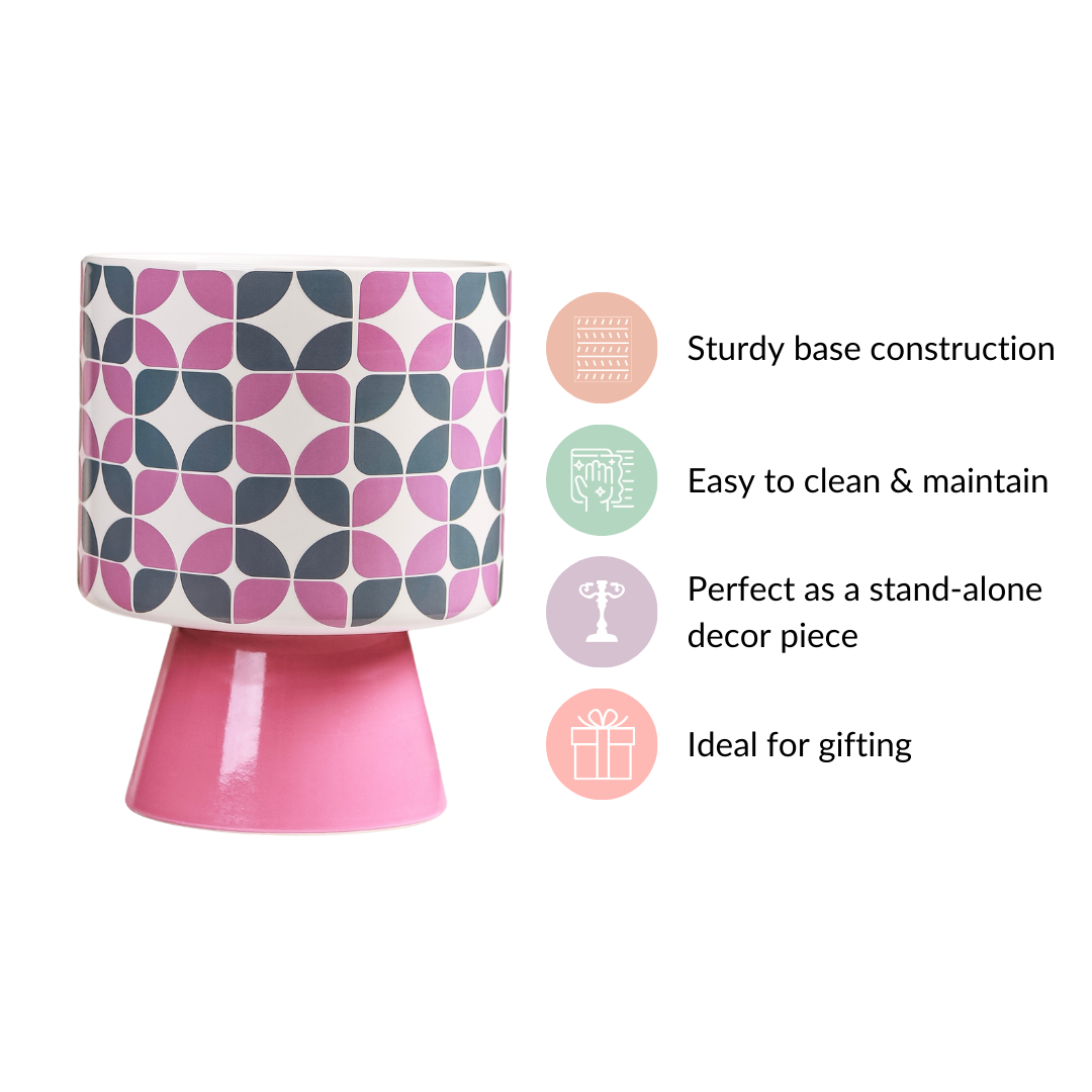Your home decor needs an exceptional flower vase, which combines a modern abstract design with a touch of whimsical charm. The ceramic pot features an intriguing abstract shape that adds a contemporary flair to any space. Its beautiful pink base brings a sense of elegance and sophistication to your surroundings, while the top is adorned with playful multi-coloured circles, painted with vibrant, harmonious colours to create a symphony of visual delight. The multicolour bauhaus circle and square patterned exquisite flower pot is a statement piece that bridges the gap between art and functionality. Boasting a glossy finish, the durable ceramic material makes it a long-lasting addition to any home setting.