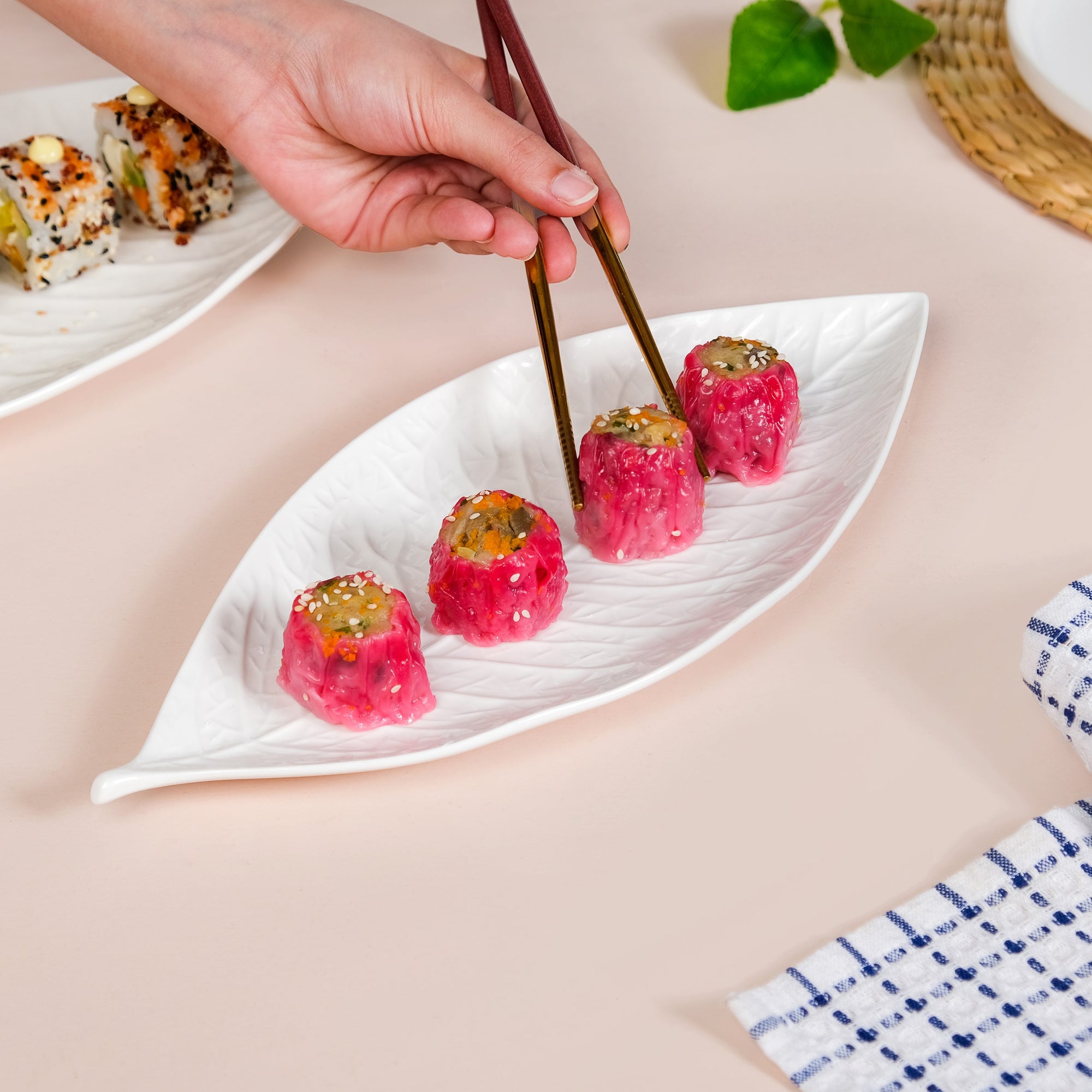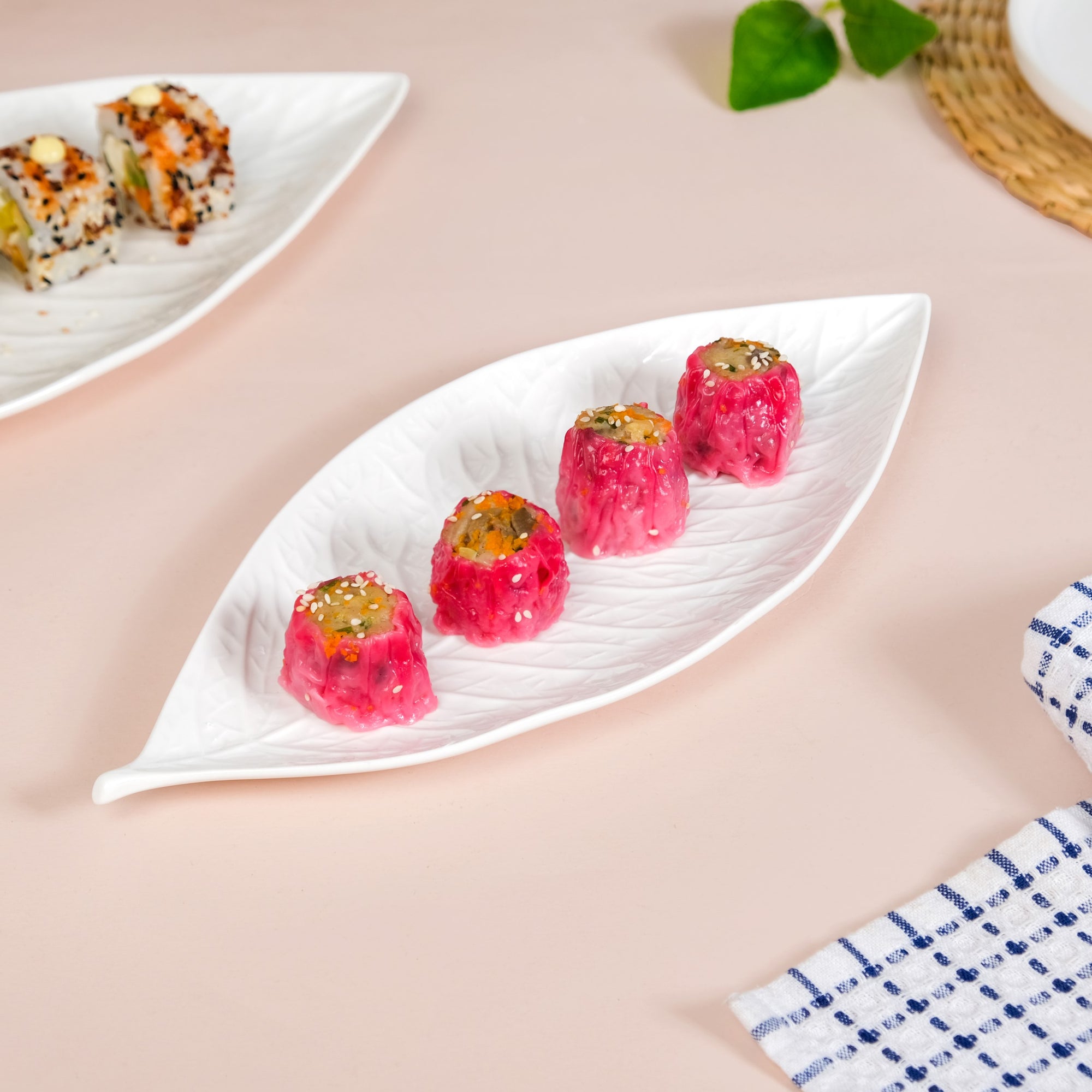 Design: Inspired by the bay leaf's graceful shape, this serving platter boasts intricately textured leaf vein designs, adding a touch of natural beauty to your table. Its unique form enhances the presentation of appetisers, entrees, or desserts.