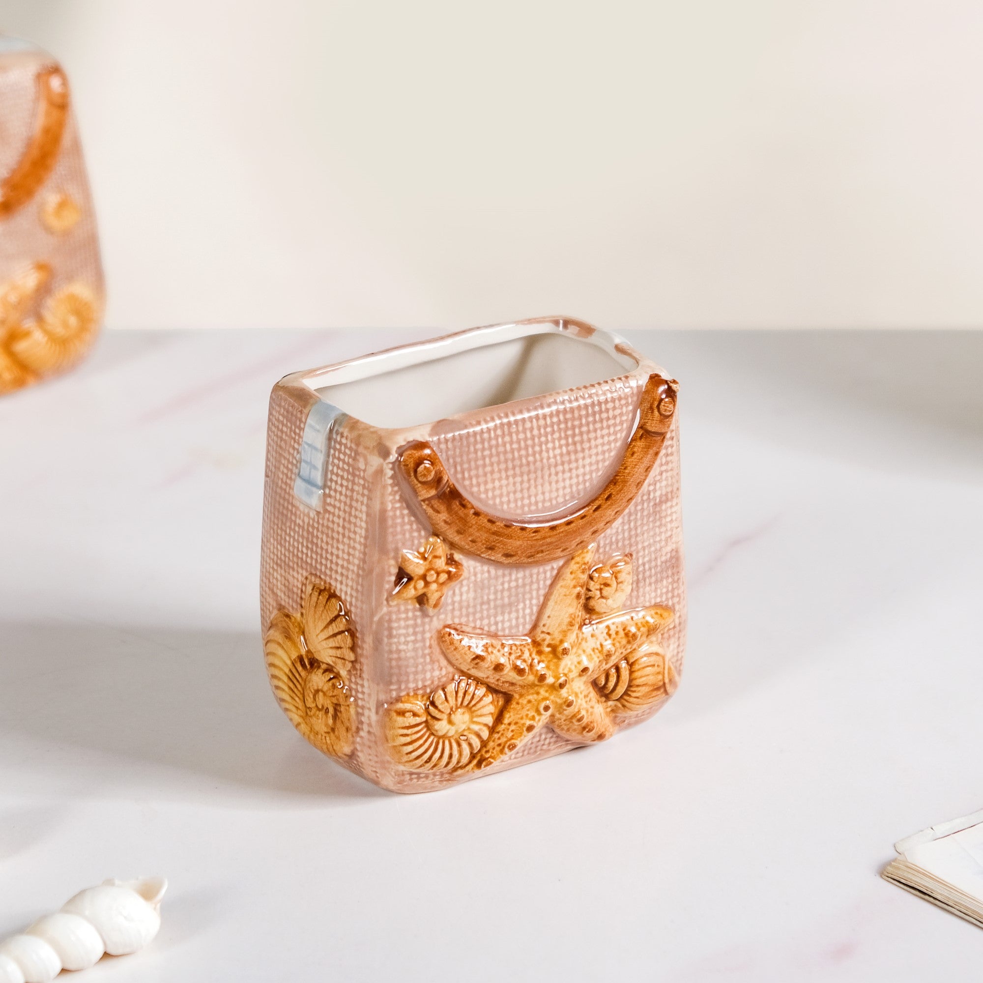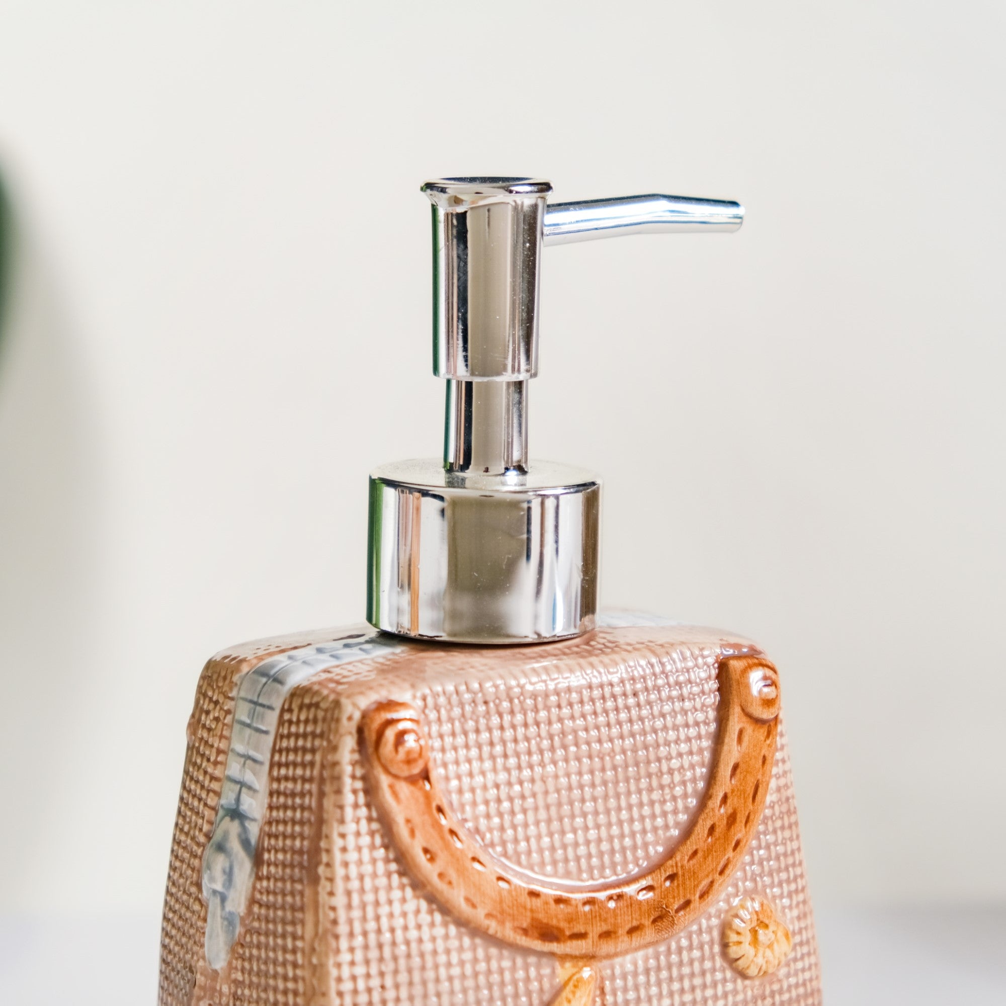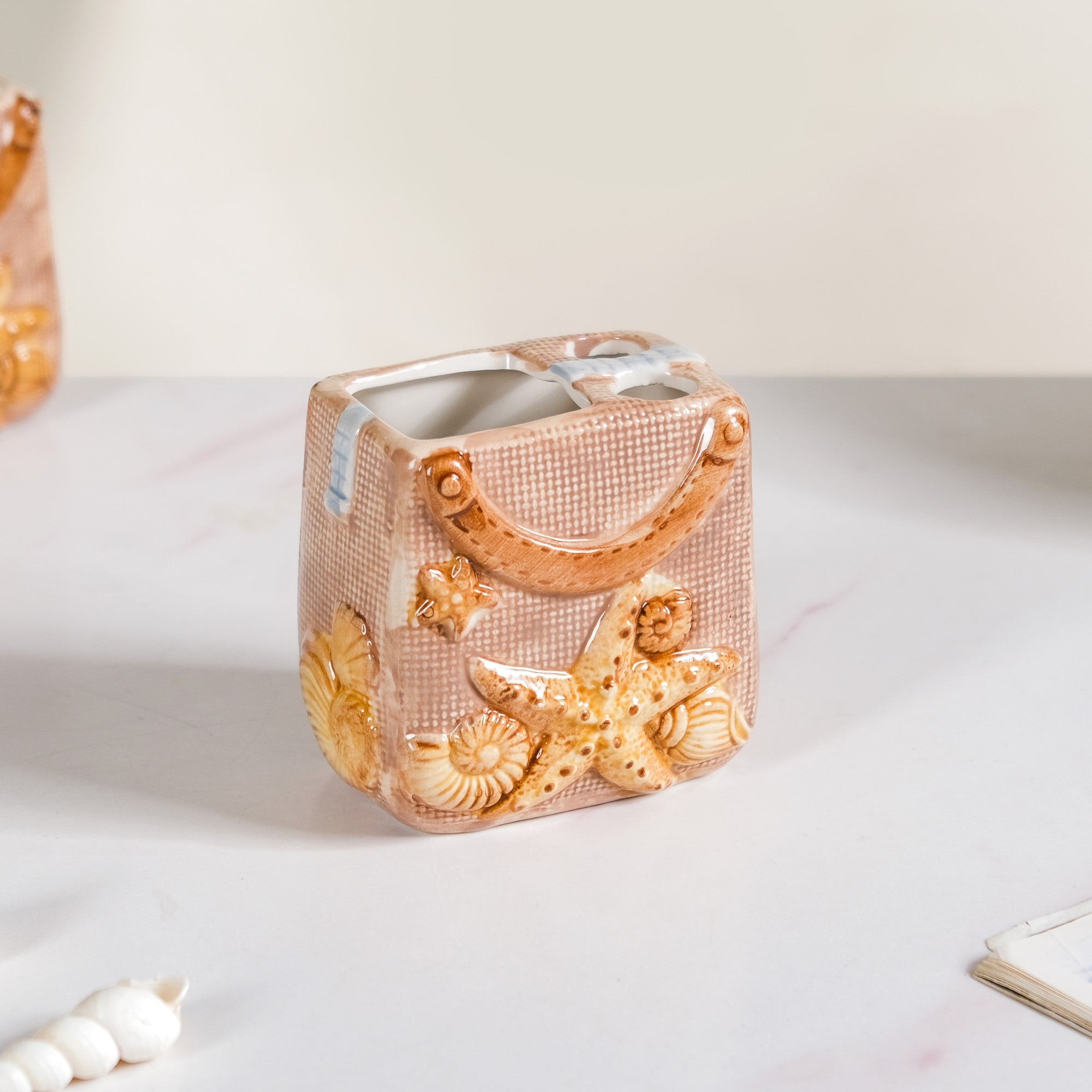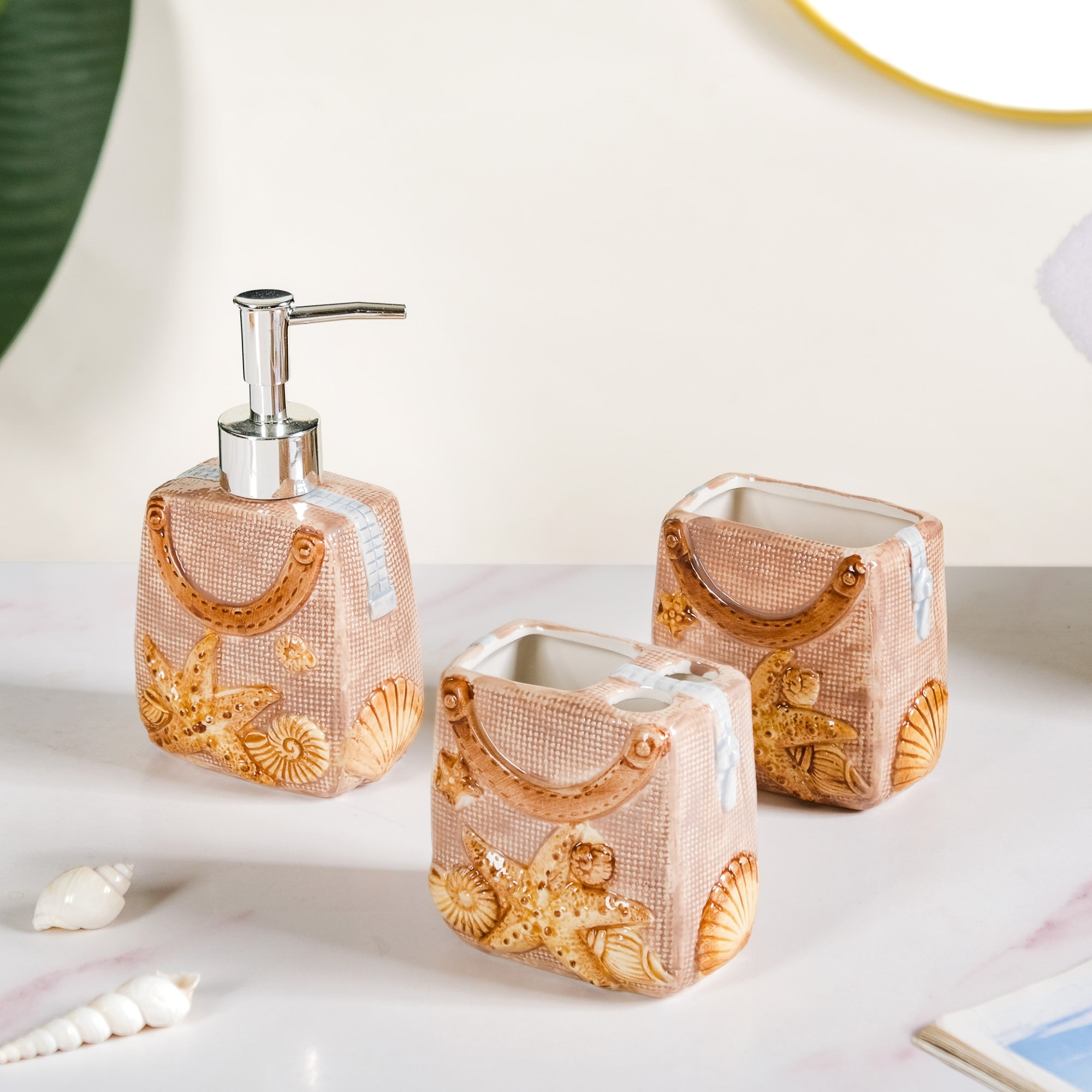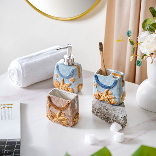 The ceramic bath set with a seashell design includes a carefully curated selection of bathroom accessories crafted from durable ceramic material. This set consists of a dispenser designed to hold and dispense liquid soap, lotion, or other bath products, a tumbler for rinsing your mouth, holding toothbrushes, or other bathroom essentials, and a toothbrush holder.