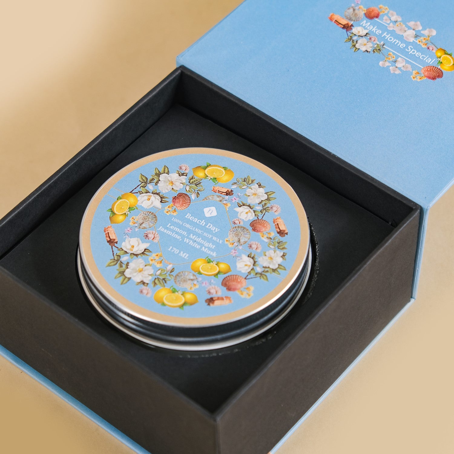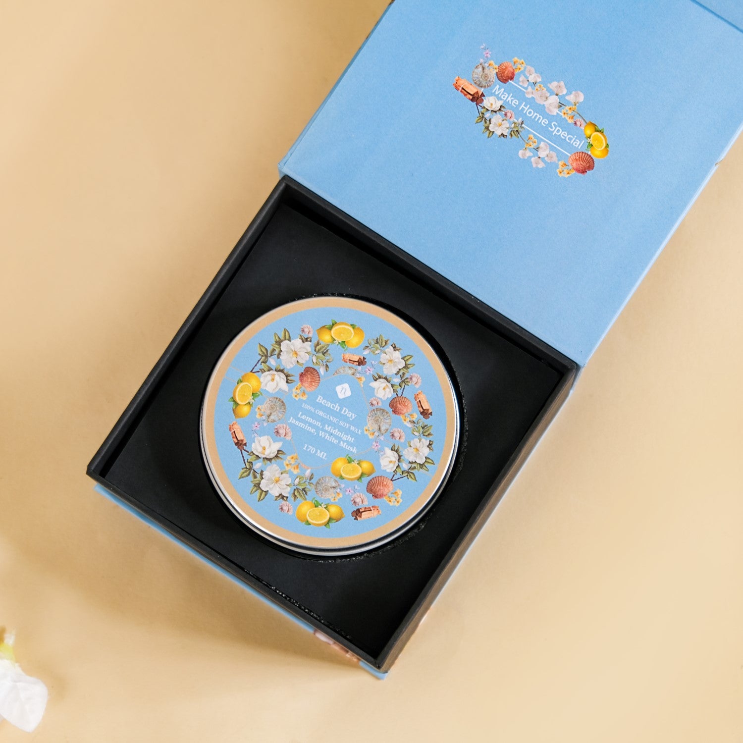 Step into a world of sensory bliss with our scented candle jar – a fragrant jewel that captures the allure of lemon, midnight jasmine, and white musk. Expertly hand-poured, our candle is made from 100% organic soy wax, generously filling the 170ml jar for a lasting aromatic journey. With two lead-free wicks, it delivers a pristine burn, free from harmful emissions. A protective metal lid accompanies the candle, preventing dust accumulation and safeguarding the delicate fragrance. Place this scented candle in any part of your house, it will spread a captivating fragrance, creating a profound sense of tranquility and refreshment in the air.