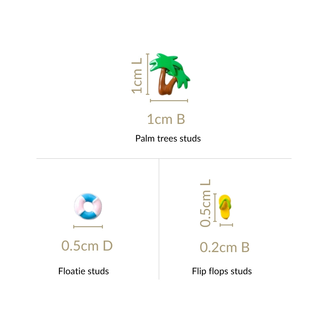 Sunshine, sand, and a splash of colour, this set of three stud earrings is perfect for your next summer getaway. Inspired by carefree tropical escapes, each piece captures a little slice of paradise with a palm tree, a playful floatie, and a charming flip-flop design. Crafted in vibrant hues, these studs bring a cheerful pop of colour, making them a fun yet stylish addition to any look. Whether you're daydreaming of the beach or actually there, these earrings keep the summer spirit alive all year round.
