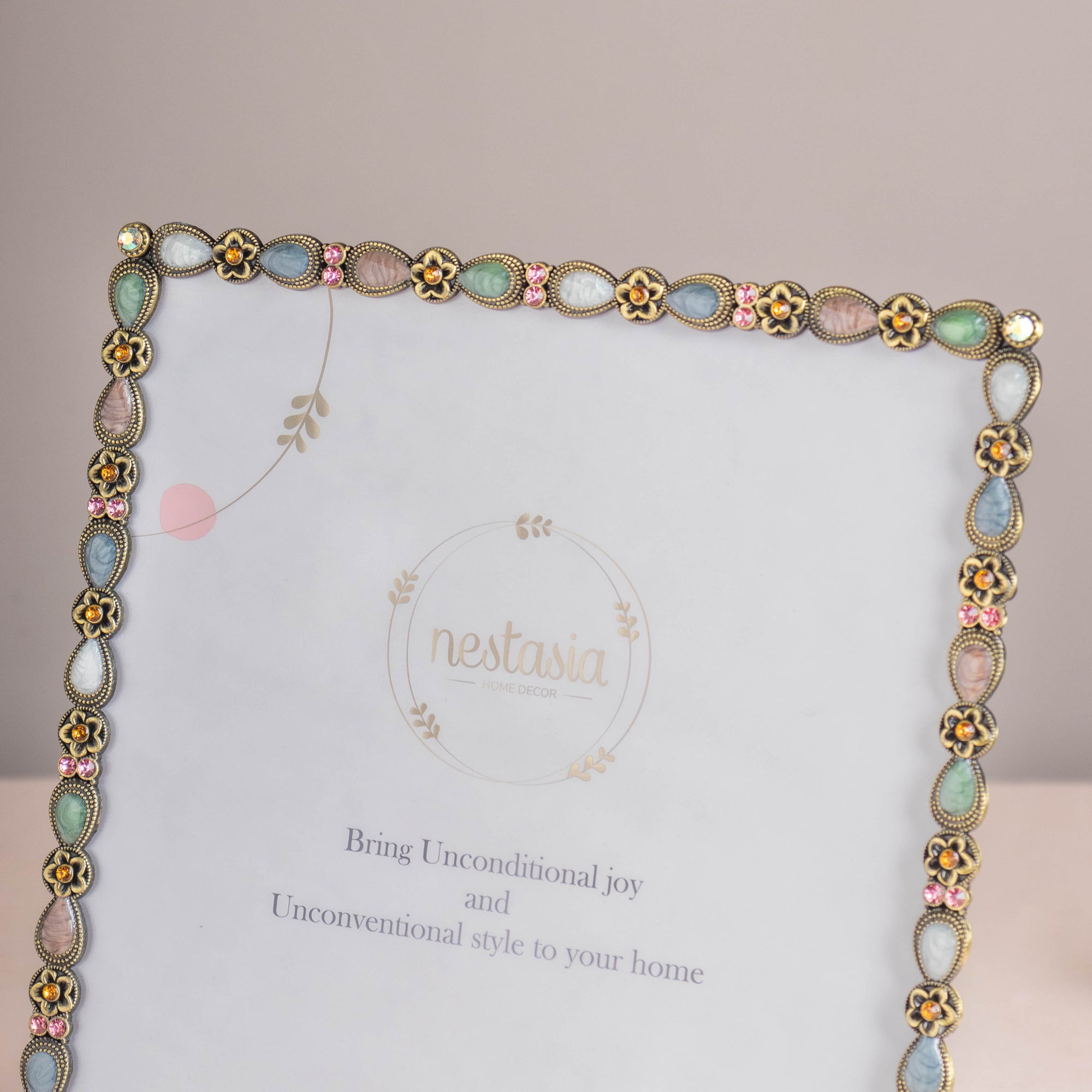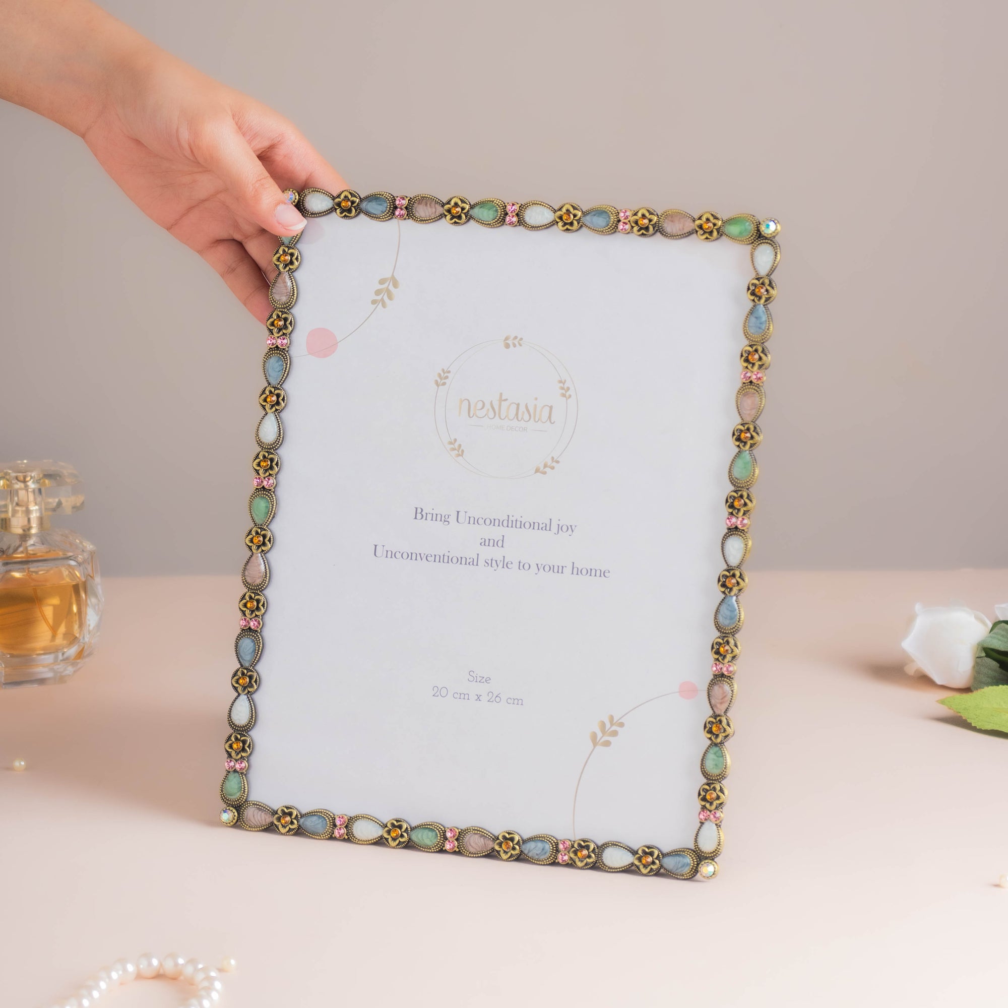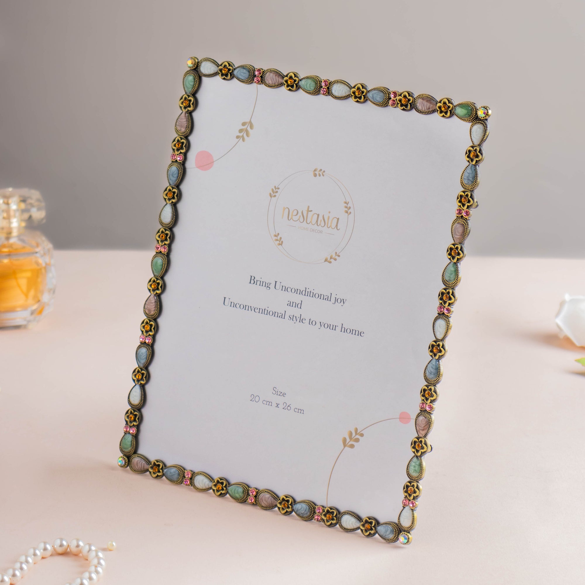 Beautiful photographs deserve frames just as beautiful. The beaded photo frame is sure to be a conversation starter. The frame can be set on a dresser or side table. A picture of the special ones or of a memorable moment can be placed inside the frame. The multicolored beads add a touch of vintage elegance and has a classic appeal. The uncommon photo frame is the perfect gift for any occasion. Nestip: Add a faux monstera leaf with no backdrop except the glass of the frame for an extremely modern piece. Size: 22cm L x 1.5cm B x 27cm H Color: Lilac, green, blue, white and gold Material: Metal Products included: 1 photo frame Style: BZT65PF62