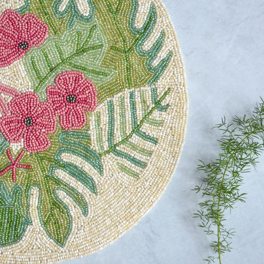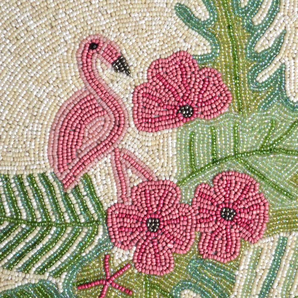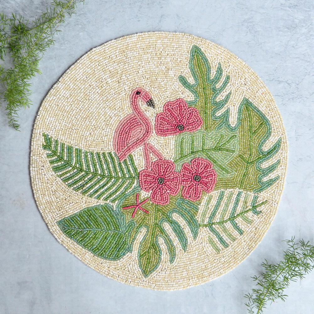 The beads Flamingo Mat is the latest addition to the beaded mats collection. The flamingo motif adds a tropical cheer to any table top surface, be it a coffee table, dining table, side table or even consoles and side boards.