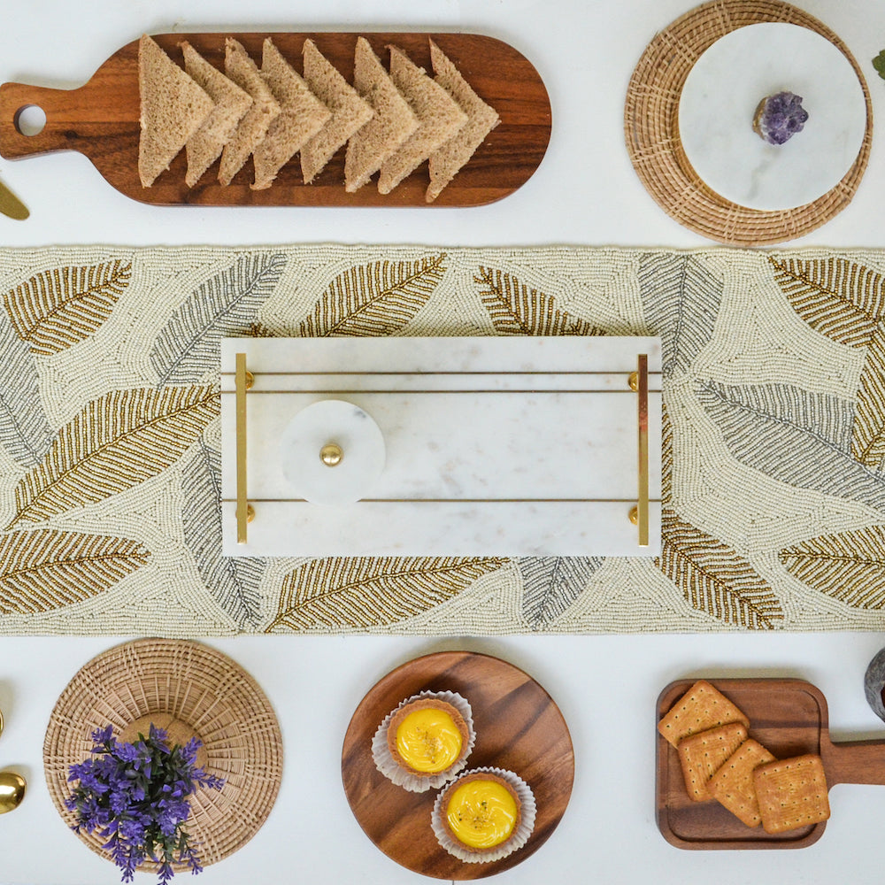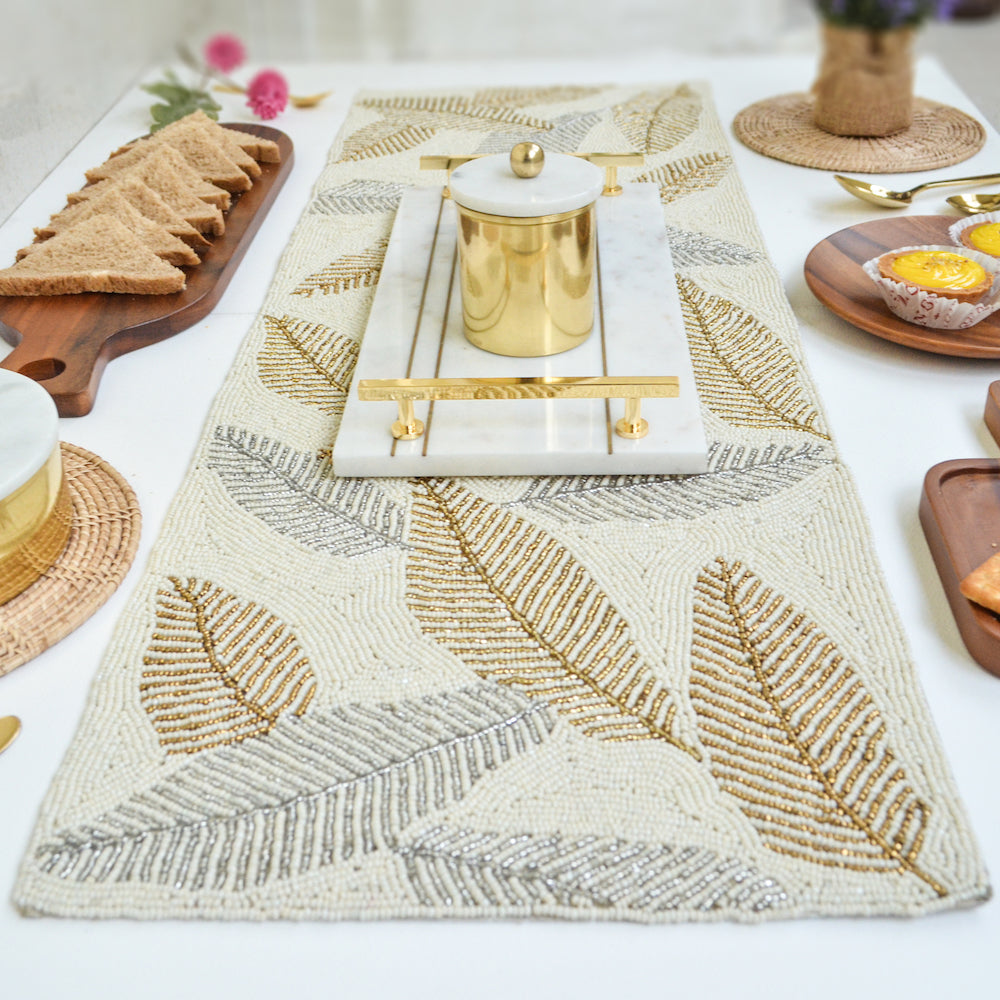 Beads White and Gold Leaf Runner is the latest addition to the Beads Collection. Add a touch of luxe to the dining or living space with this handmade beaded runner.