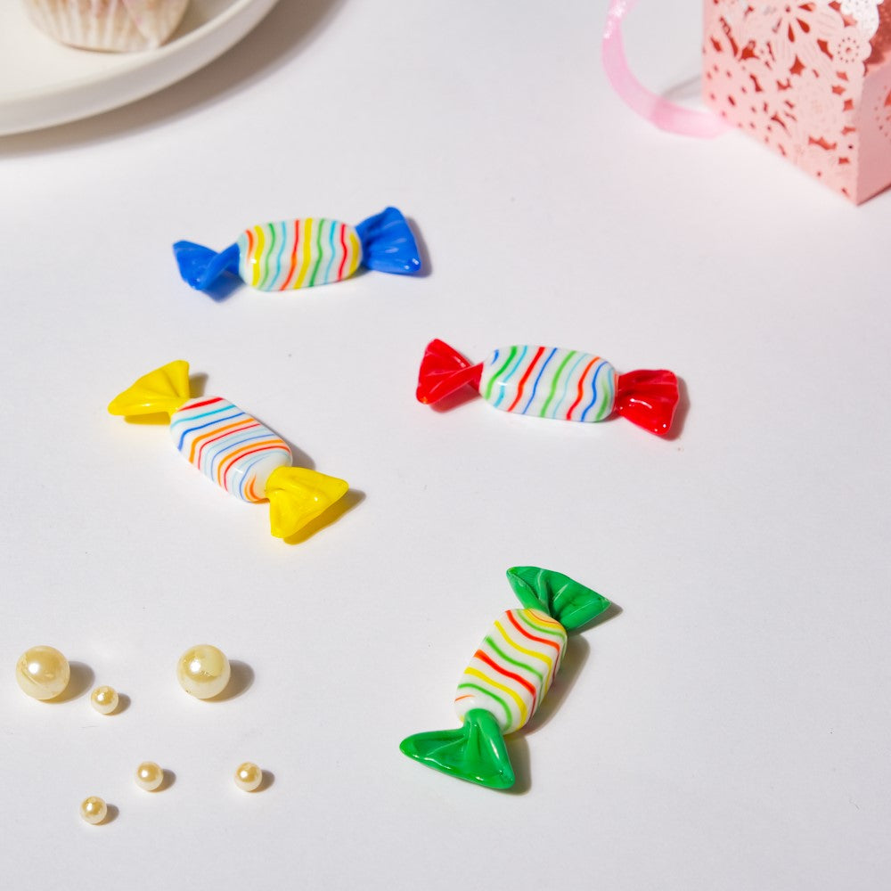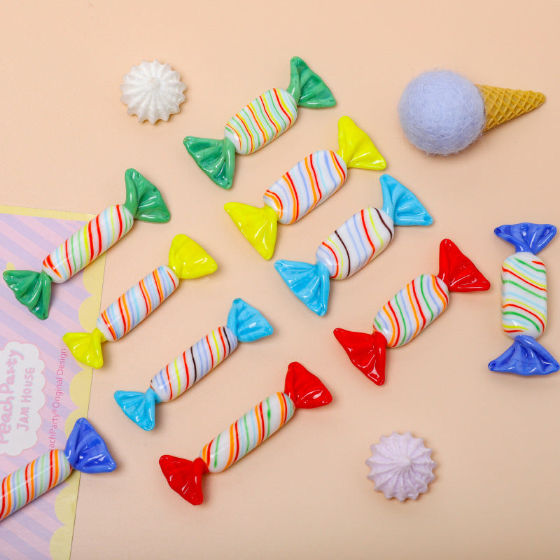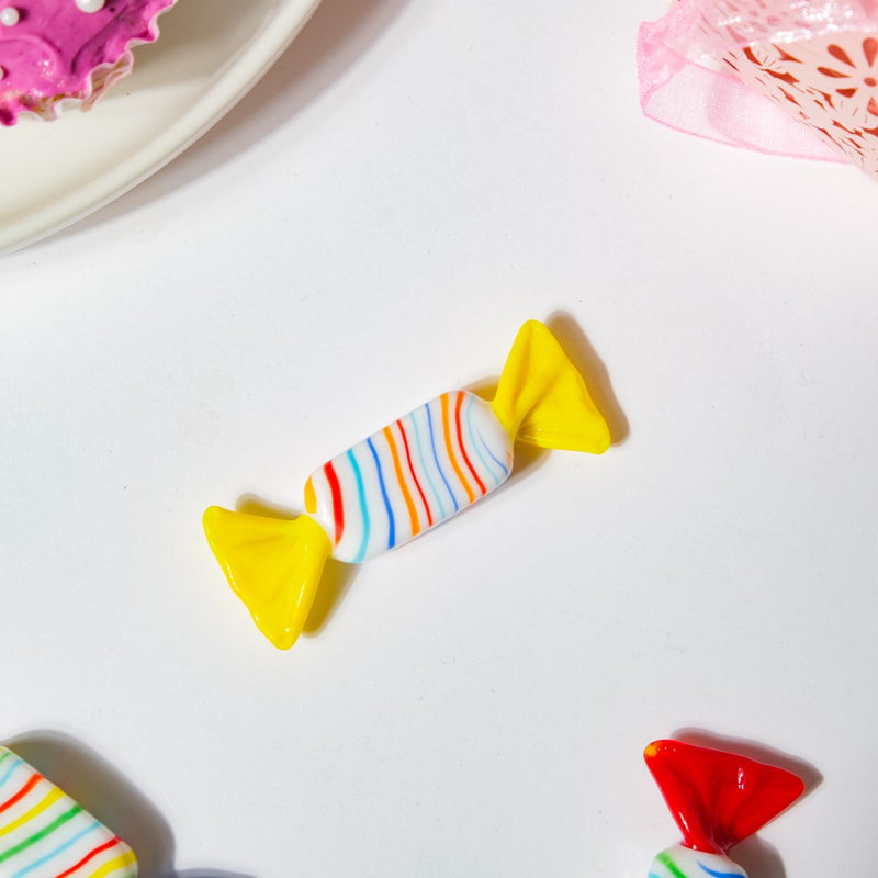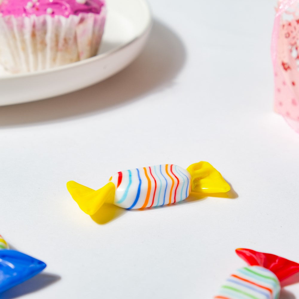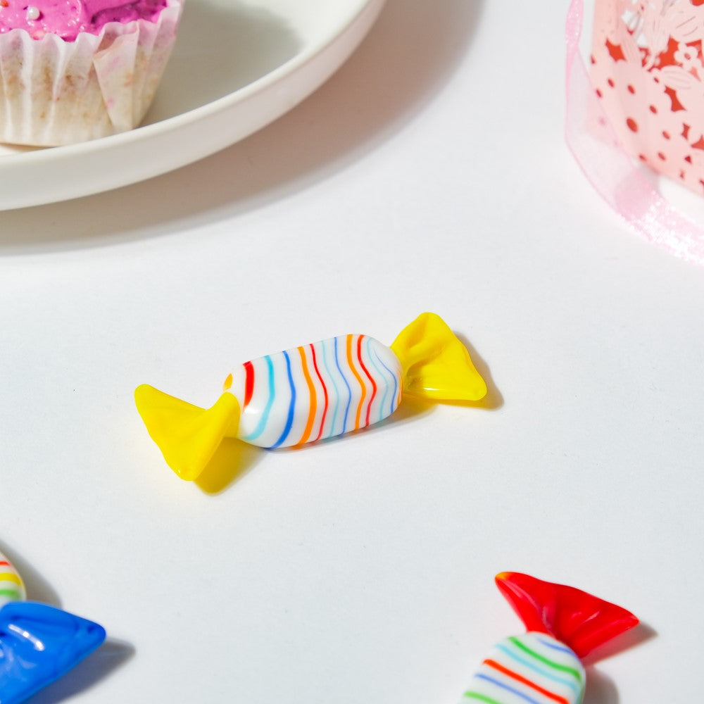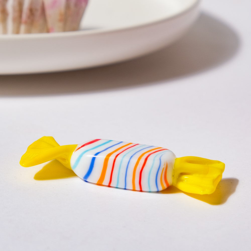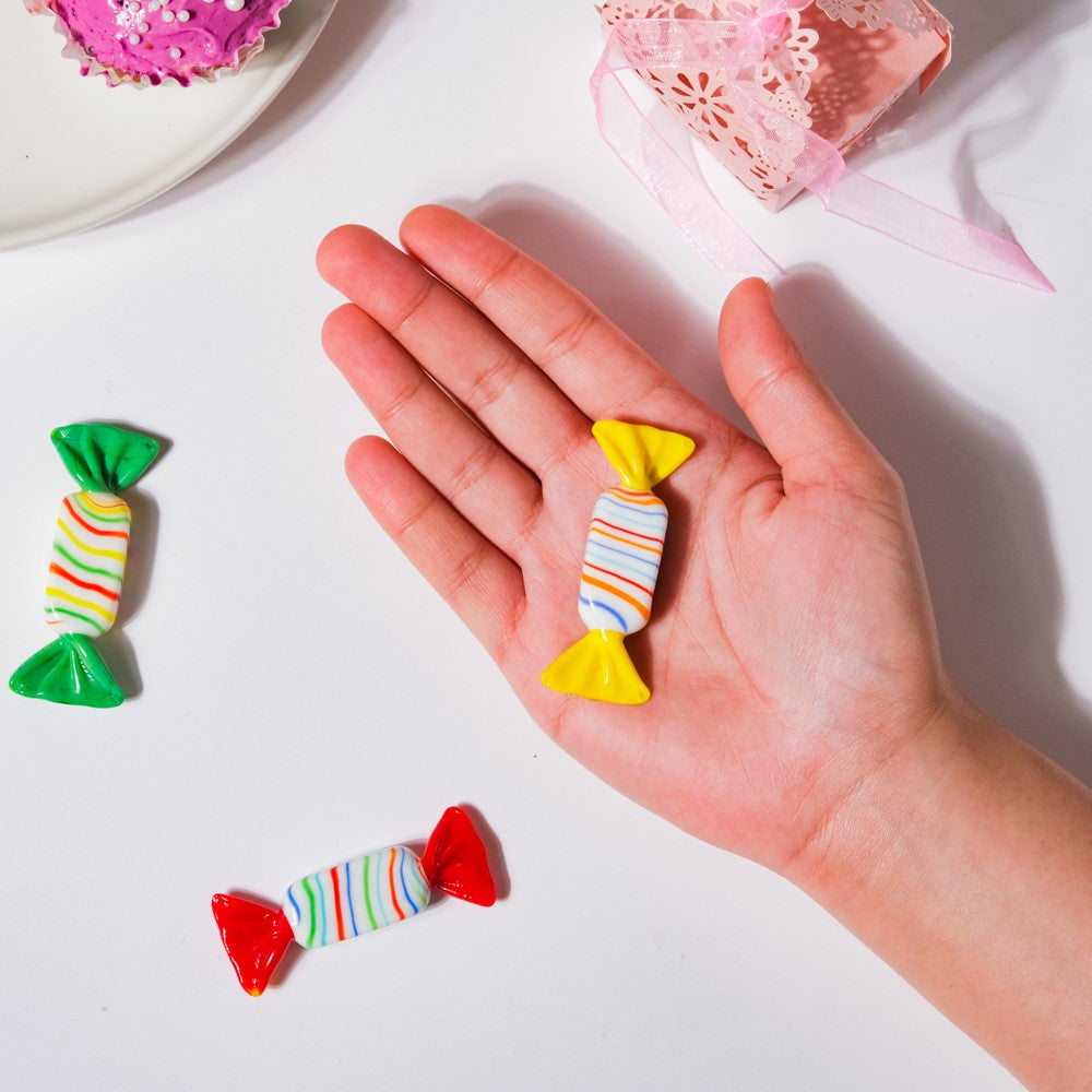The glass candy showpiece is not real candy. It is made of glass that is carefully shaped and colored to look like candy. It is a decorative piece that is not meant to be eaten.