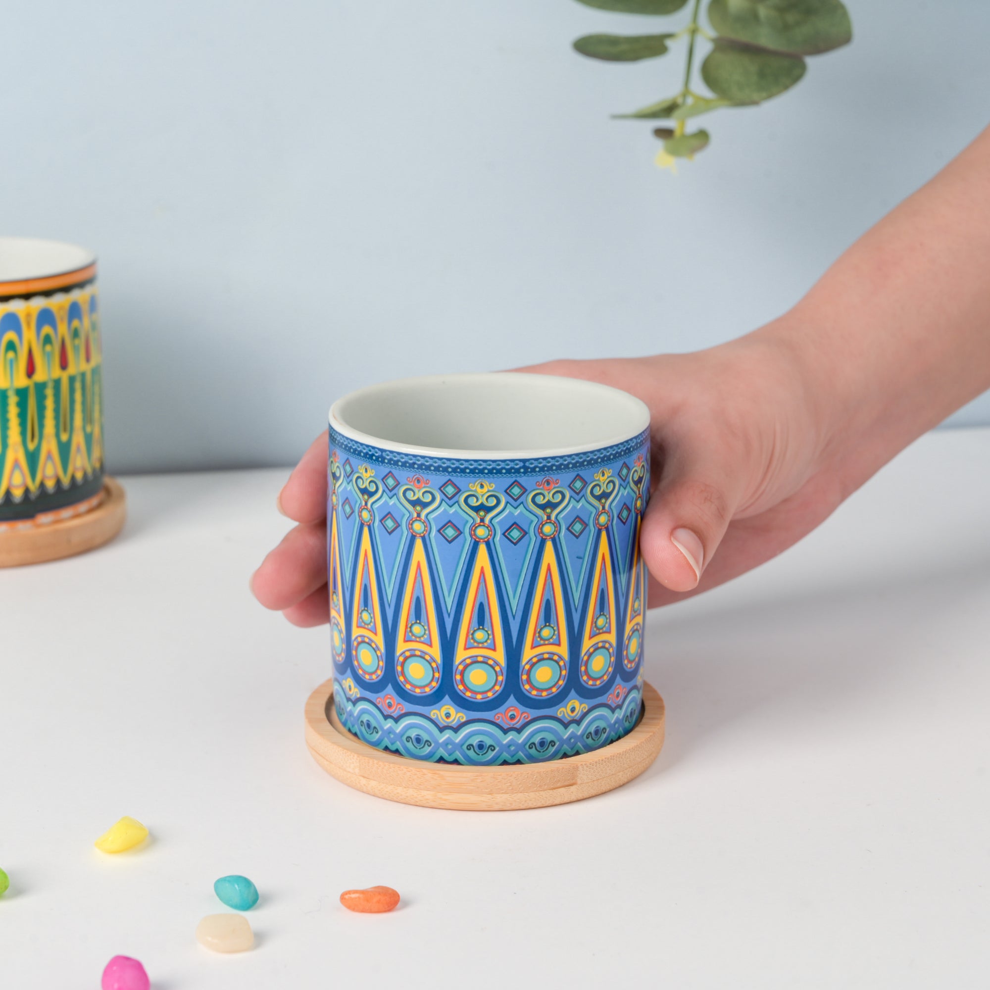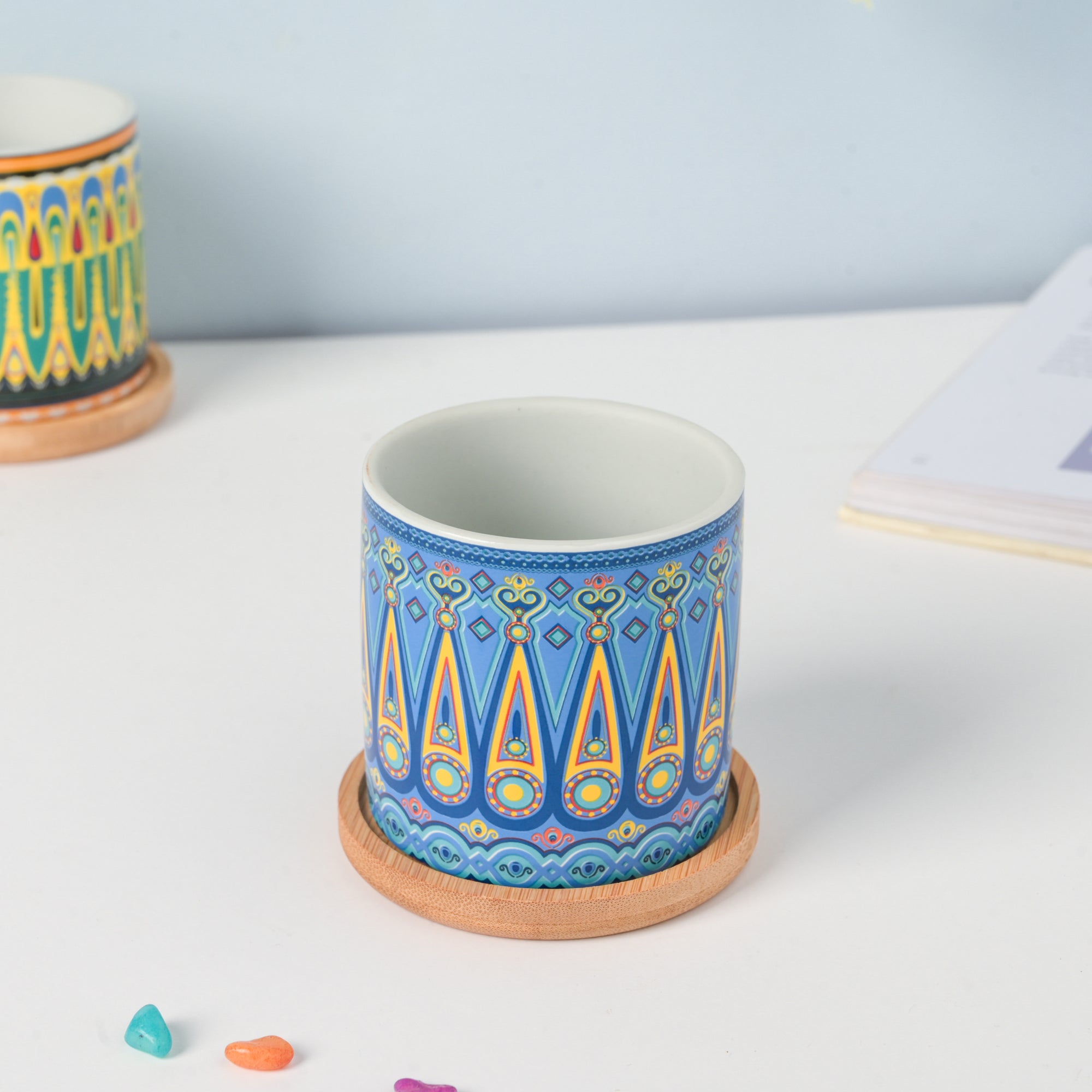 The fresh and vibrant patterns on the planter make it a fresh addition to the home. The vibrant traditional patterns have been painted with precision and care to give the planter the perfect finish. Blue and yellow motifs adorn the surface of the planter for a unique addition to the interior.