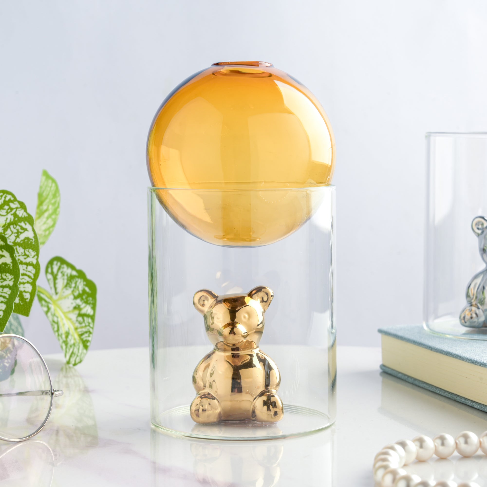 The popular planter that you've been waiting for has just arrived! A planter, as well as a decor object, sounds too good to be true. Then you must look at what a little teddy bear has brought you. A cylindrical glass jar, where the teddy bear resides, and its roof can be the new residence for your baby saplings. The trendy rounded glass lid can be filled with water as per the requirement for the sapling. Keep it on the mantelpiece for every guest to view your new novelty addition.