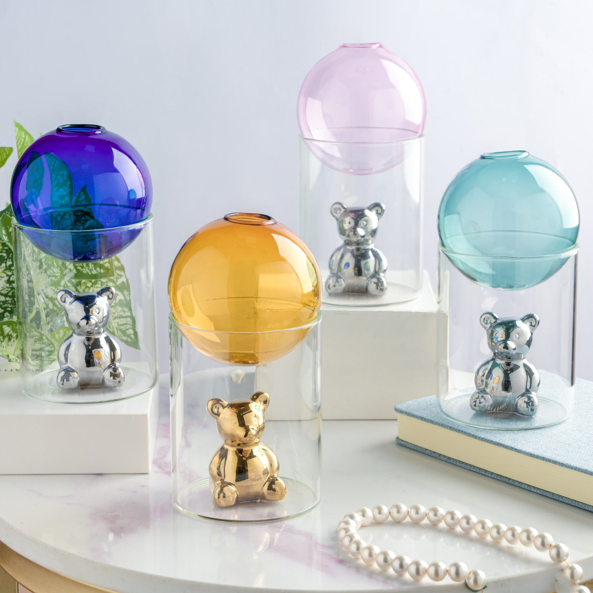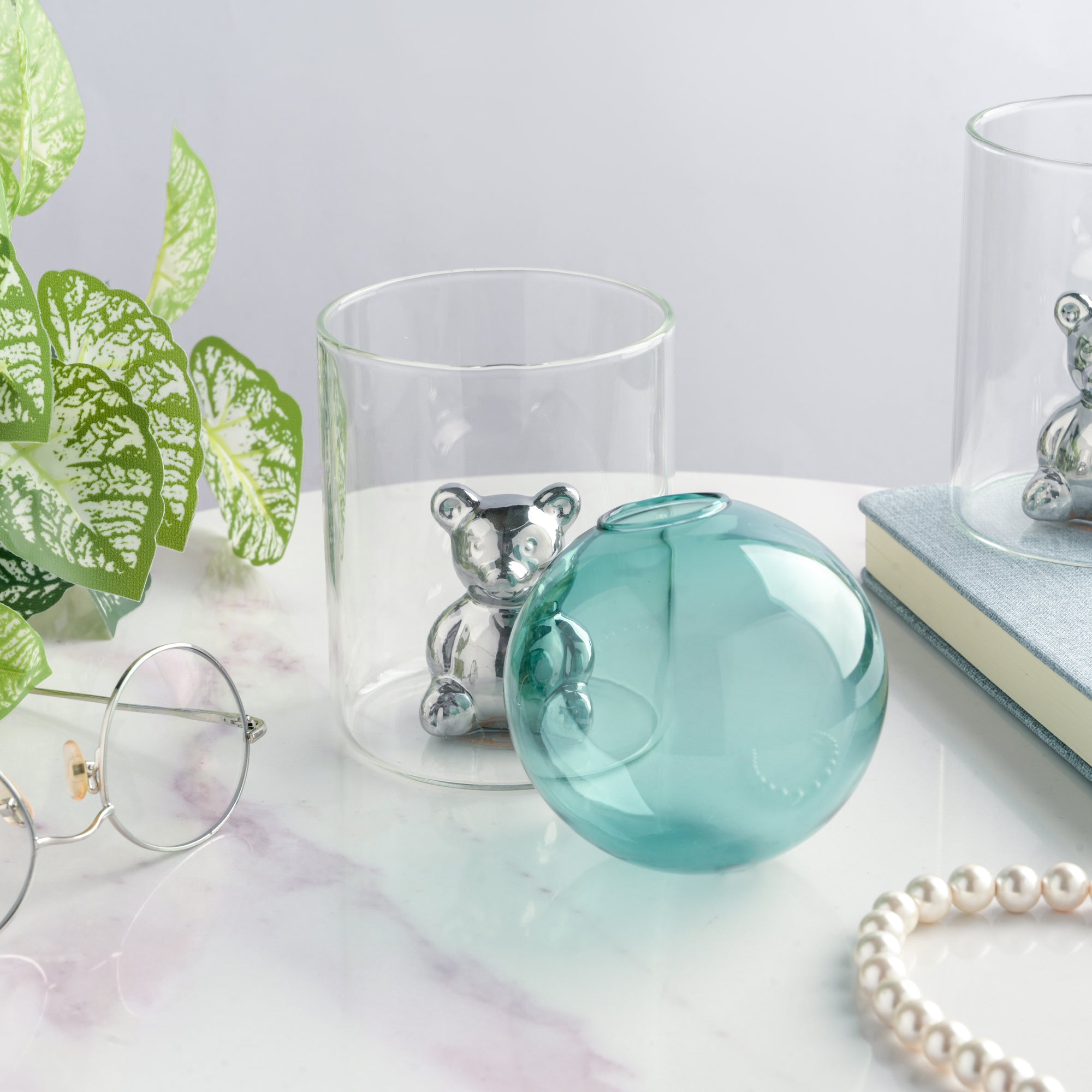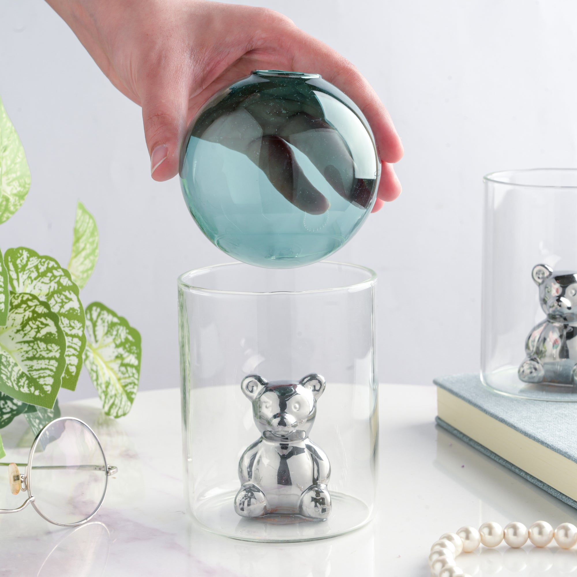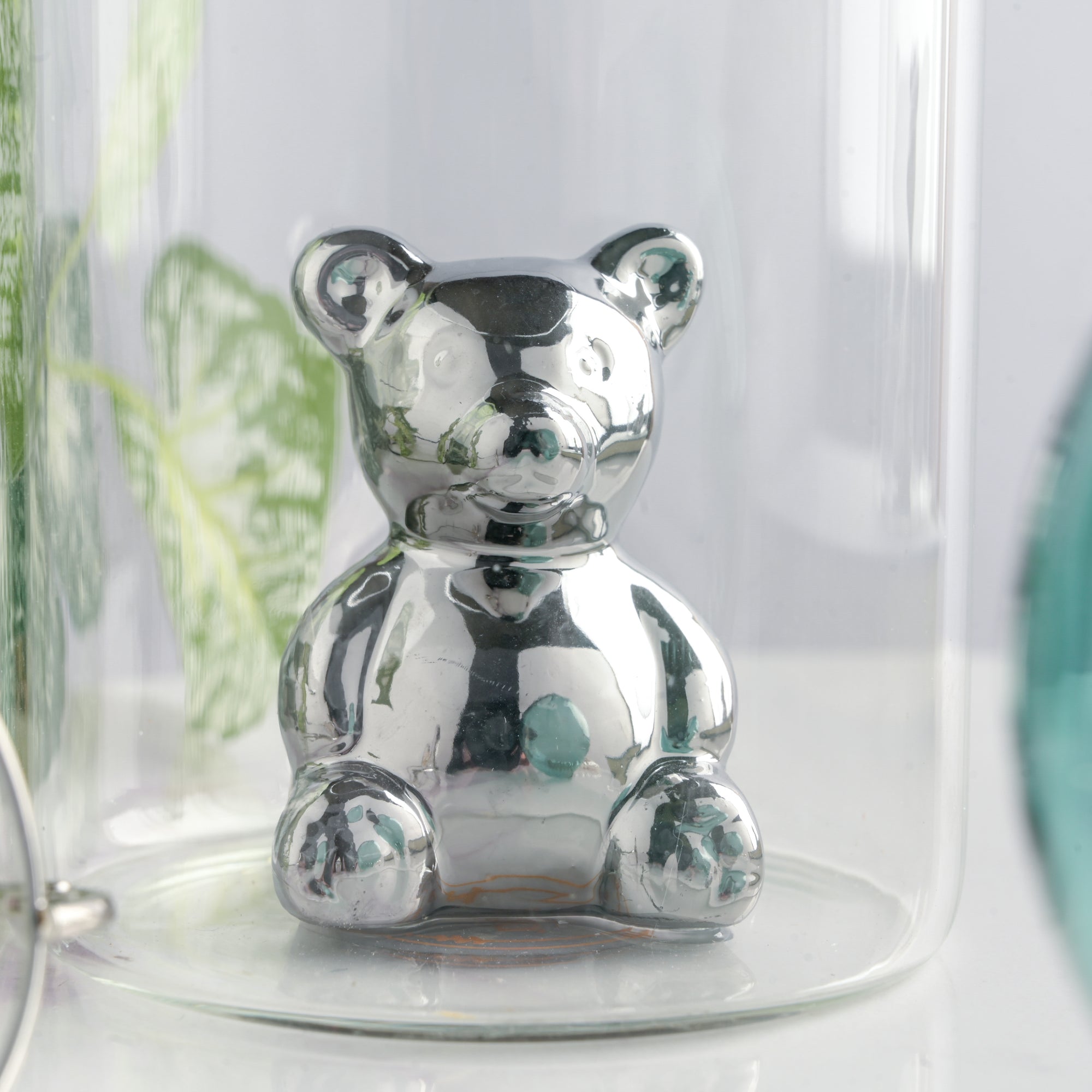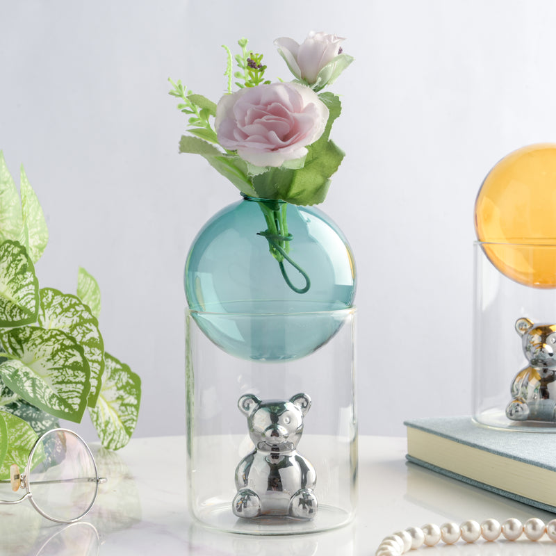 The green-colored glass ball is perfectly balanced by sitting on the brim of the cylindrical jar-shaped planter. The glass planter is the home of a very adorable little teddy bear, and also for your baby saplings or faux flowers. Surely, it's one of the trendiest planters you can find online with outstanding craftsmanship blended with charm and chicness. The silver teddy bear is said to be protecting your precious greens by residing in the cylindrical part of the glass planter. The circular ball can be filled with water as per requirement before planting a sapling in it.