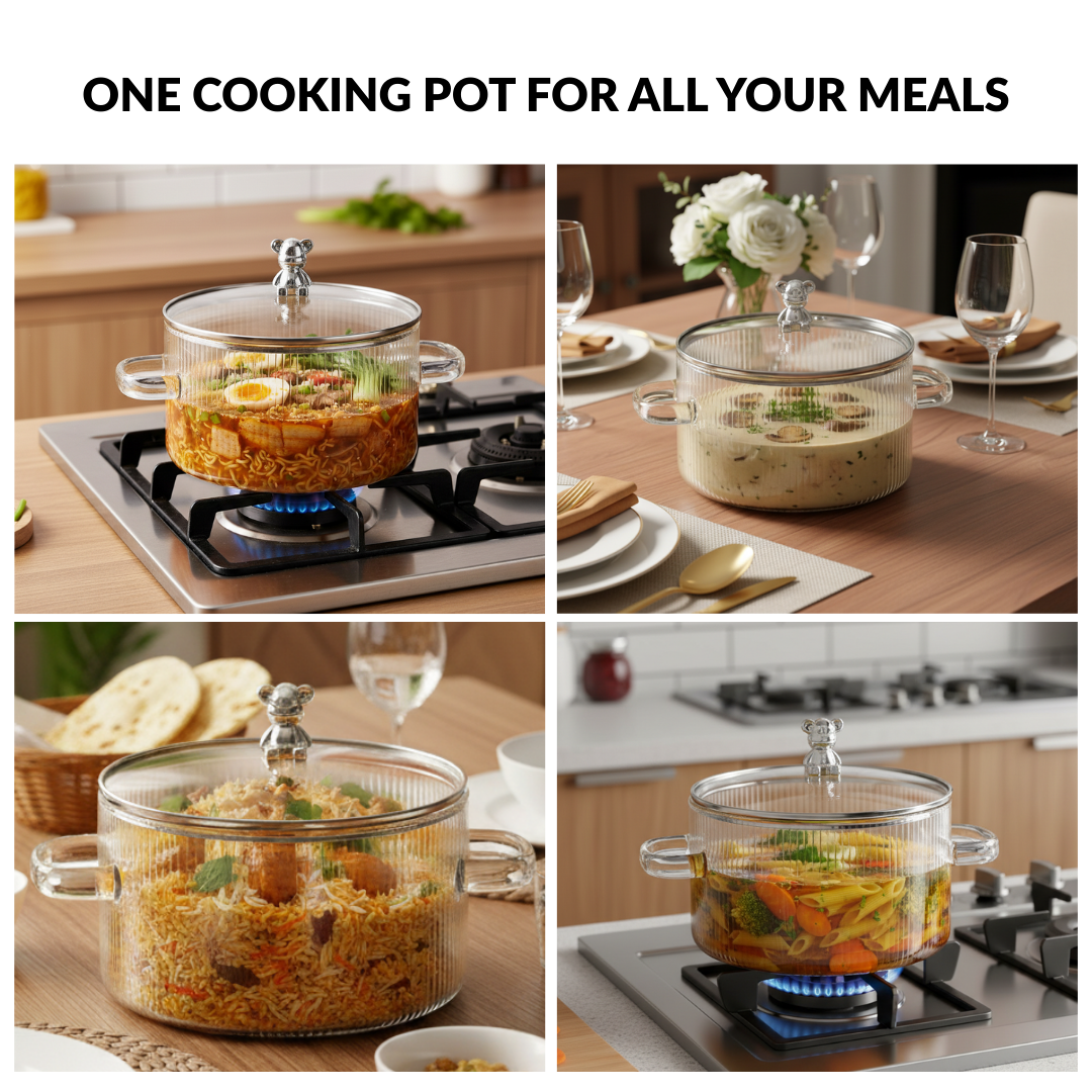 Design: This 1600ml cooking pot is crafted from durable, high-borosilicate glass and features a sophisticated fluted design. Its defining feature is the clear glass lid with a sleek stainless steel rim and a delightful, cute teddy bear knob in a silver-toned finish. It adds a playful yet elegant detail to the overall glass structure.