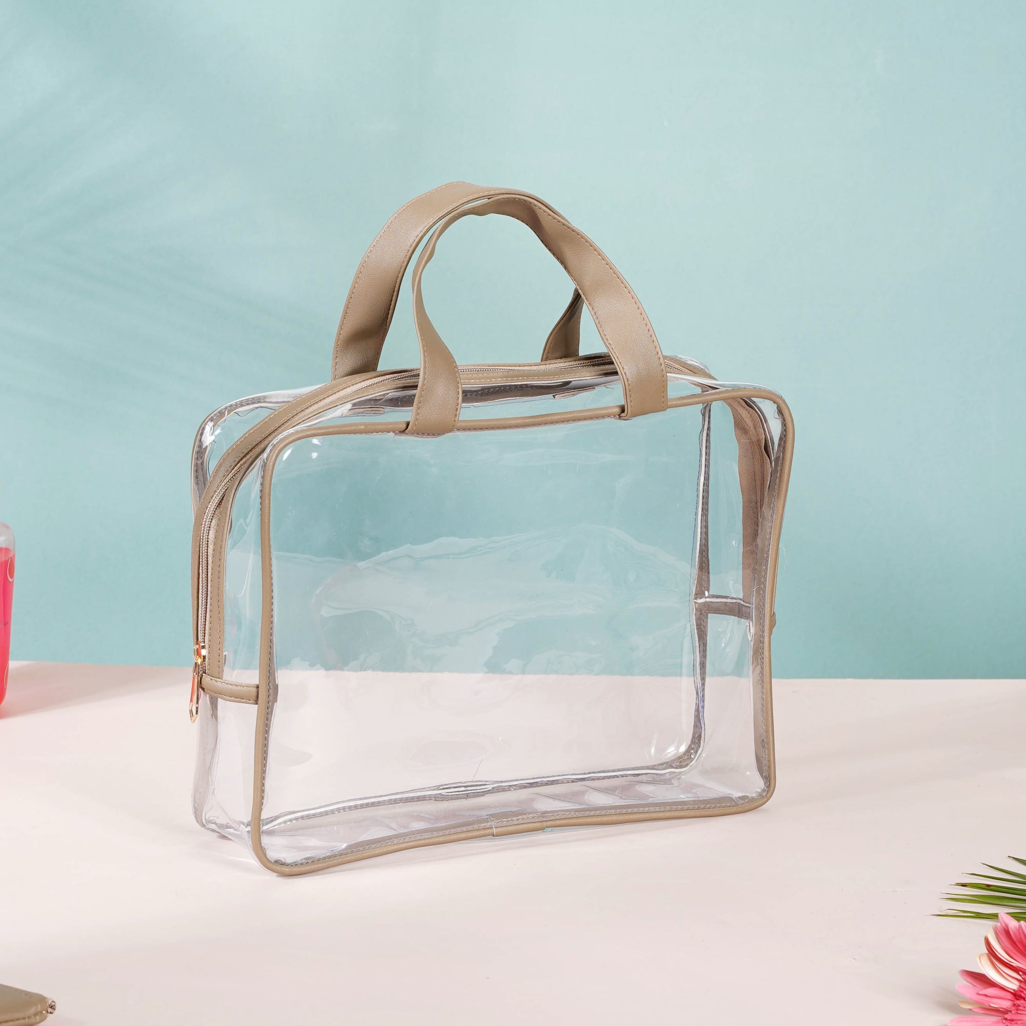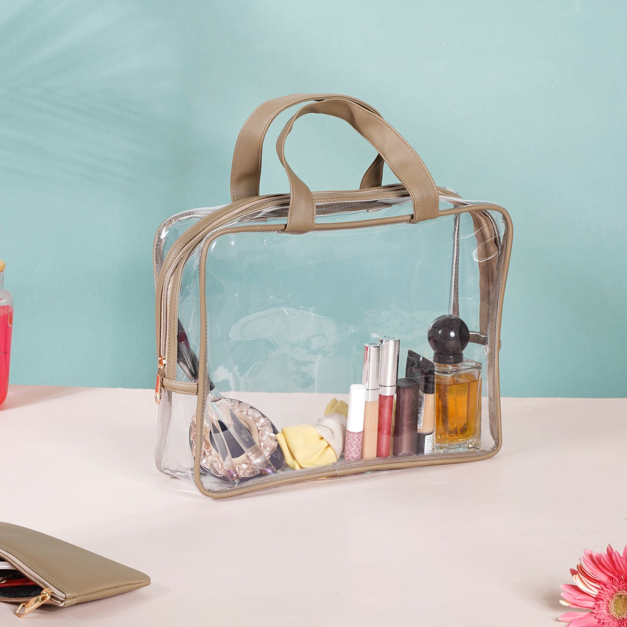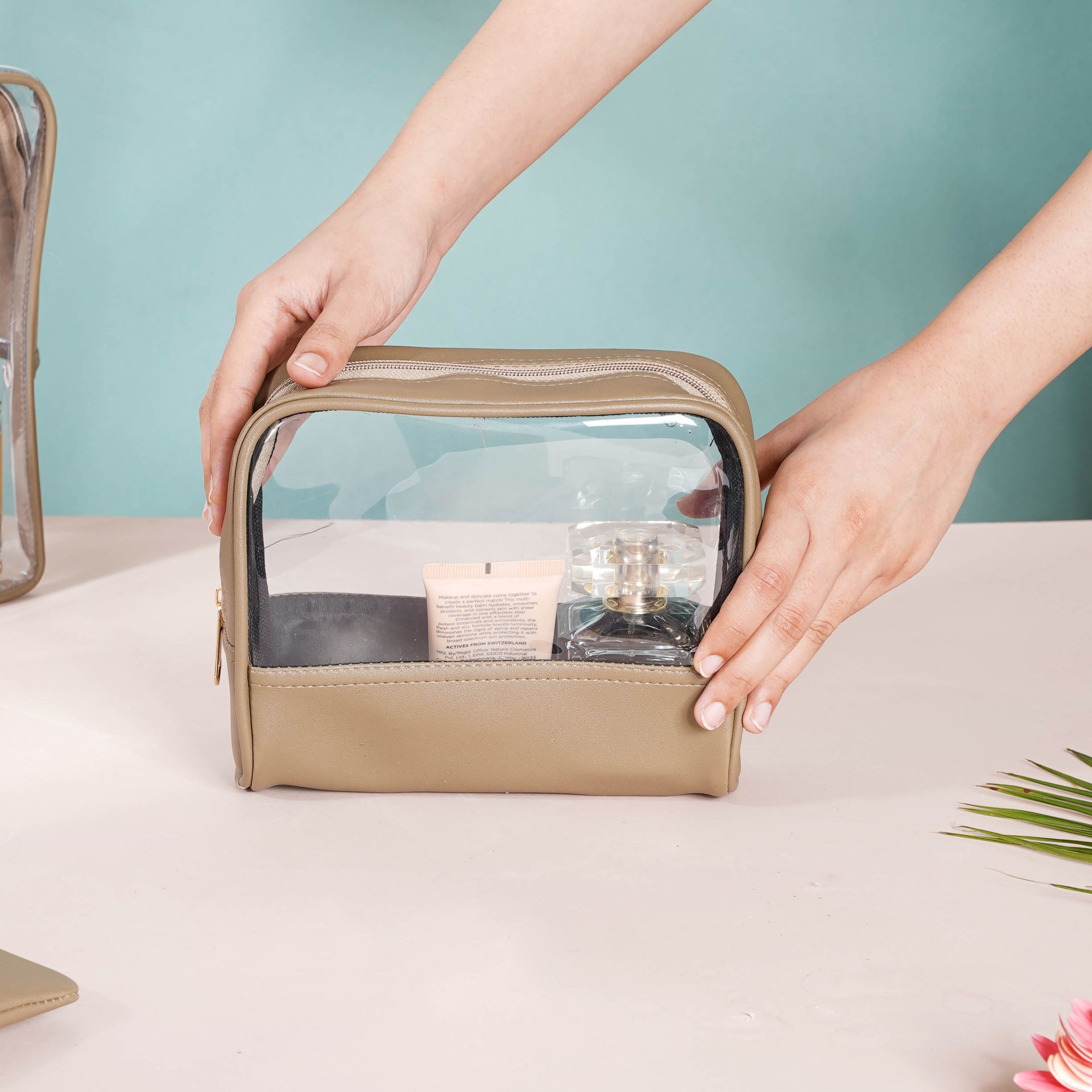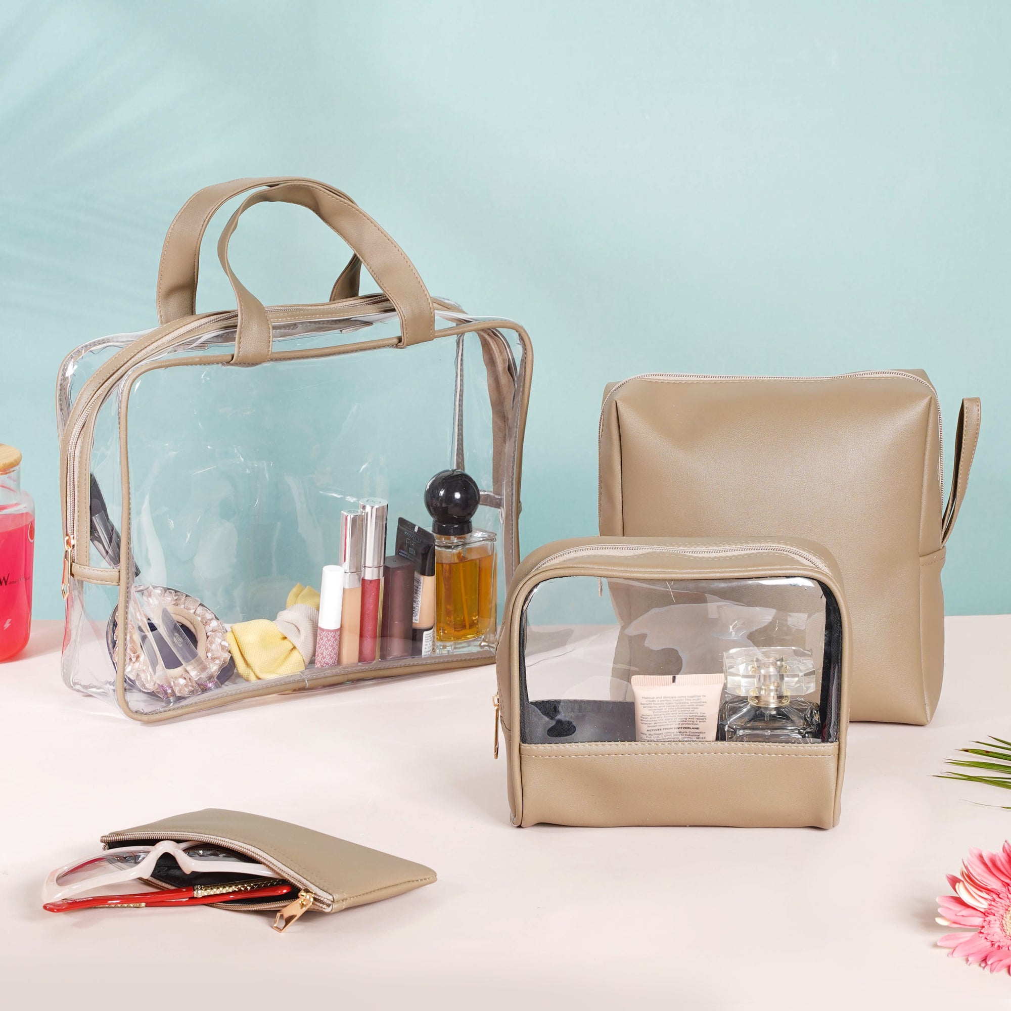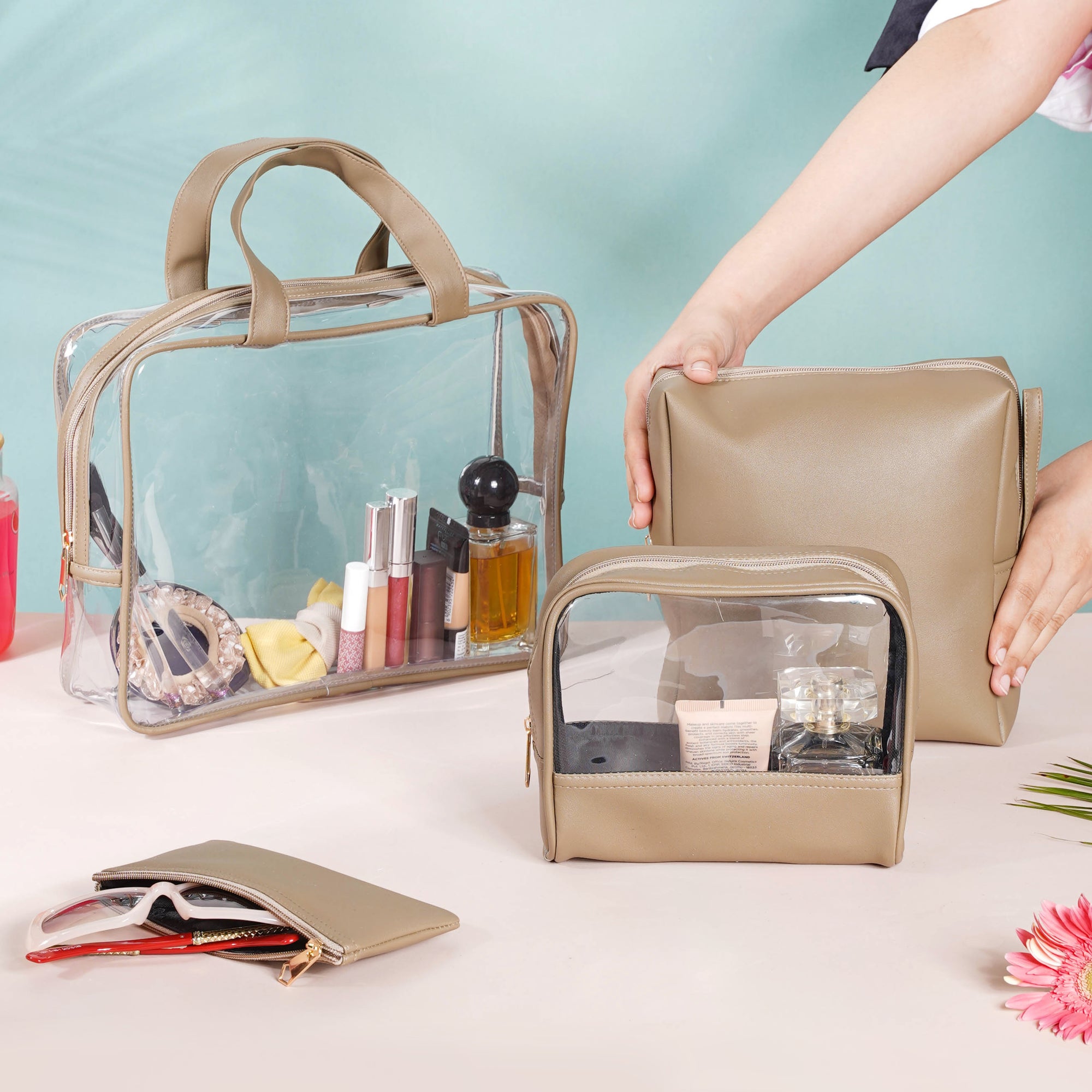 The four-piece travel kit has been expertly made, with special attention paid to exquisite stitching and easy-to-use zipper enclosures. The neutral beige and transparent travel toiletry bag set is a great present for any occasion and can also be used as a cosmetics organizer bag. The multifunctional makeup pouch in a soft-hued design is a one-stop solution for decluttering any area in the house by giving convenient storage alternatives for one's cosmetics, jewelry, toiletries, medicines, and more. The travel kit bag set of four is large enough to keep pens, pencils, painting tools, and other school supplies and may also be used as a stationery pouch. The biggest bag is intended to allow the other three pouches to be simply put into it, allowing you to travel with all of your things without any difficulty. The small-sized solid-colored pouch may be used to hold sunglasses.