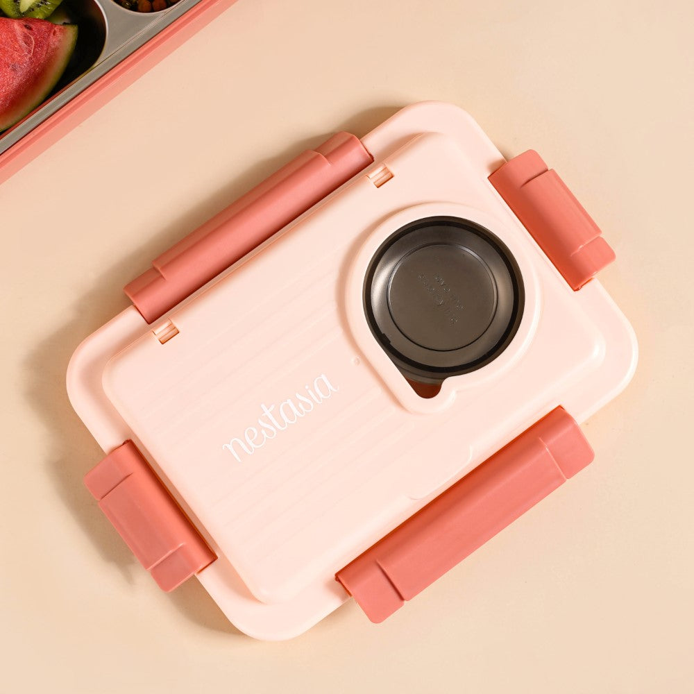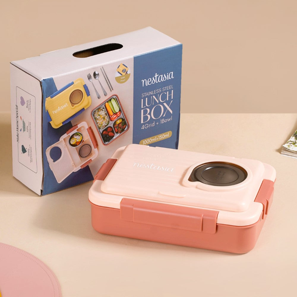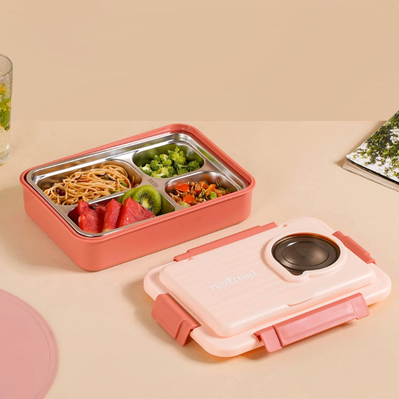 The premium features of the 4-grid lunch box are meant for a great lunchtime experience. The use of 304-grade stainless steel and food-safe, BPA-free materials ensures the tiffin box's exceptional quality. We put your health and safety before everything else. Your food will stay warm and delicious thanks to this lunch box's superior warm water insulation technology. You can organise your food using the four different compartments, and the clip locks on all four sides guarantee its protection. The lunch box's detachable silicone gasket also makes cleanup effortless. It becomes easier to travel light with this tiffin box due to its sturdy yet lightweight design. Savour every time and make lunchtime special with this stunning bento box.
