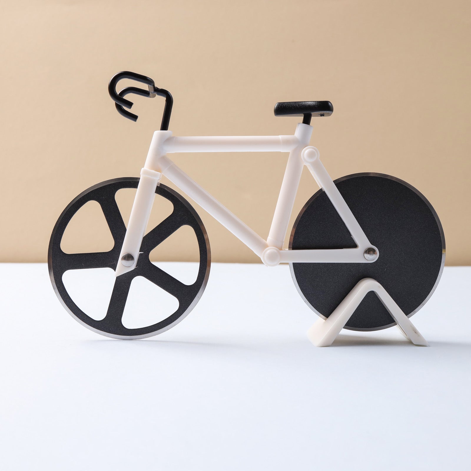 The pizza slicer or pizza cutter is shaped like a bicycle, with a pvc frame and rest to keep it in place. Handling can be done at ease due to the bike frame in the kitchen tool which is well thought out and a blend of kitchen utility with funky design. The kitchen accessory is a must-have addition to pizza nights or games night at home.
