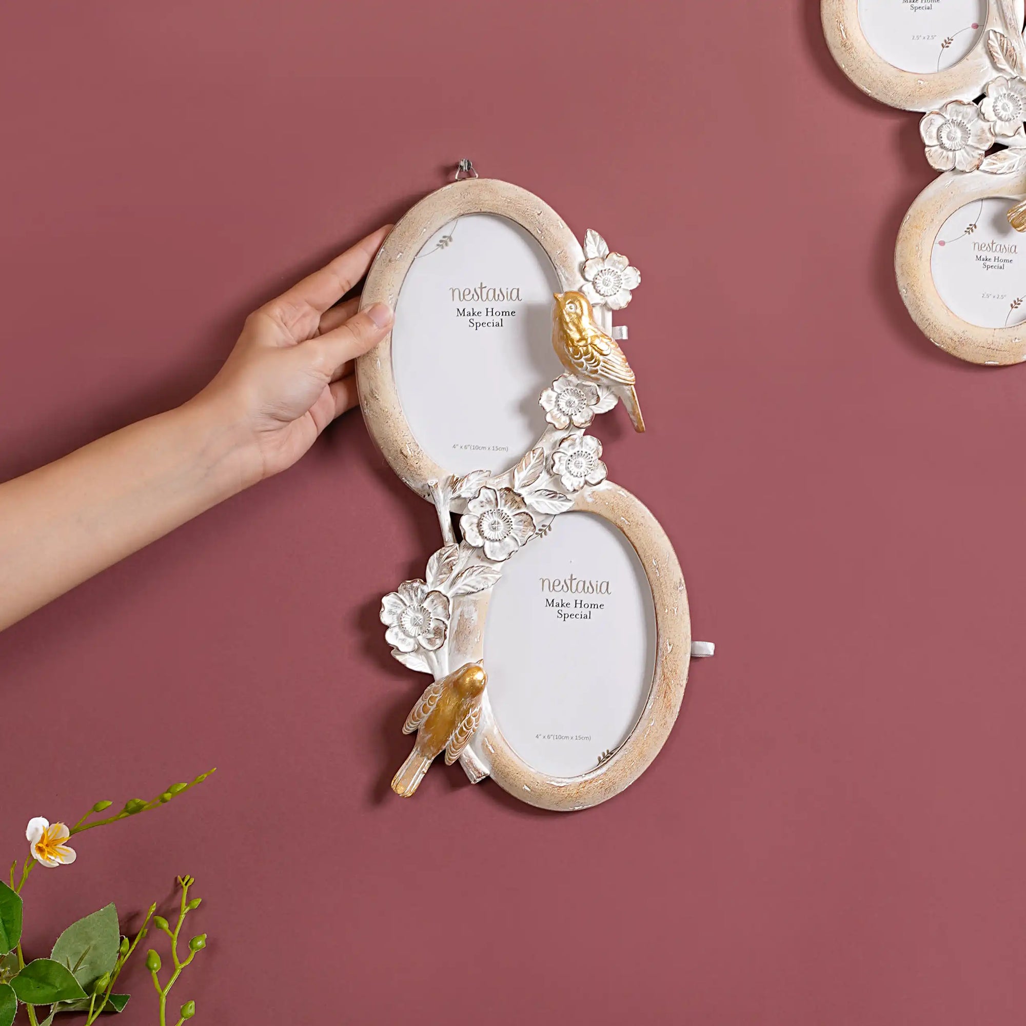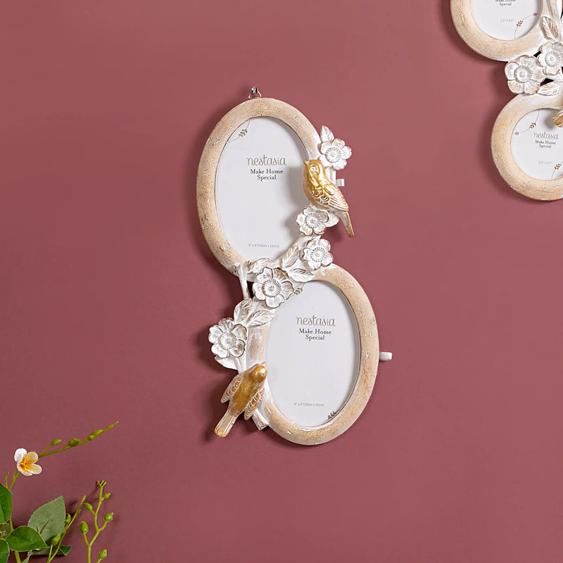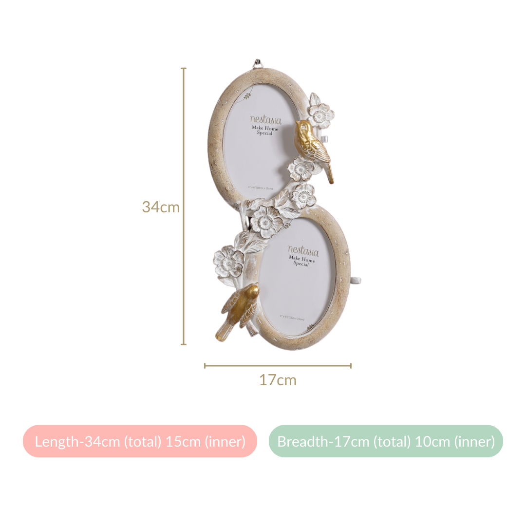 Discover the stunning 2-slot photo frame that enriches any wall decor and room decor. This wall decor picture frame boasts oval slots with borders adorned with delicate birds and flowers, infusing a whimsical touch that complements its colour scheme exquisitely. Meticulously crafted with attention to detail, the picture frame provides a captivating showcase for two of your most treasured photographs, emphasizing their sentimental value. This photo frame's design ensures effortless integration into any home decor. Whether as a heartfelt gift or a captivating home addition, our photo frame encapsulates beauty & elegance.