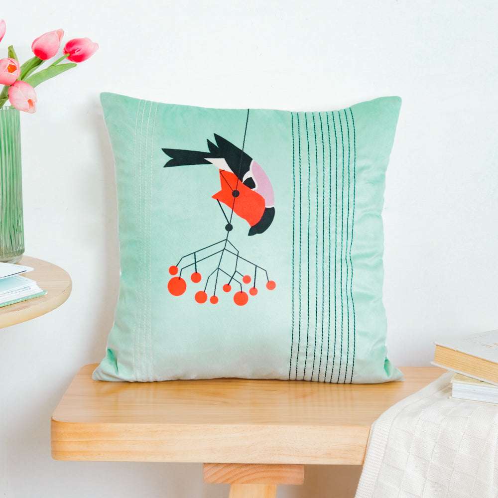 The cozy cushion case in a soothing shade of blue is adorned with a digital print of a bird sitting on a branch. The abstract design will uplift the space of a modern house. From bedroom to living space, the cushion can be placed in any setting. Nestip: Combine the cushion with a bright orange throw for a contrasting appeal.Size: 40cm L x 40cm BColour: White, blue, pink, red, and blackMaterial: VelvetProducts included: 1 cushion coverStyle: DC01NSM21
