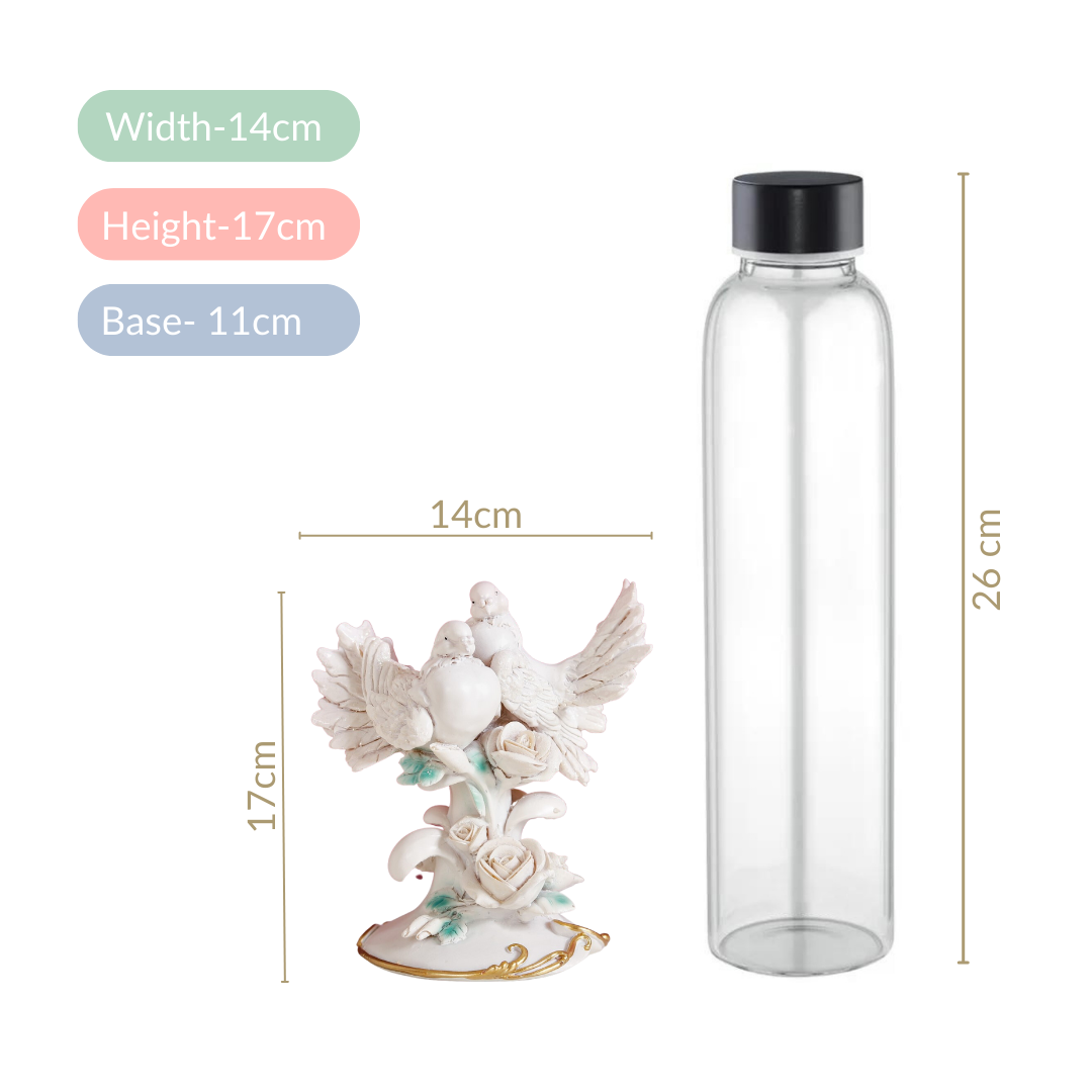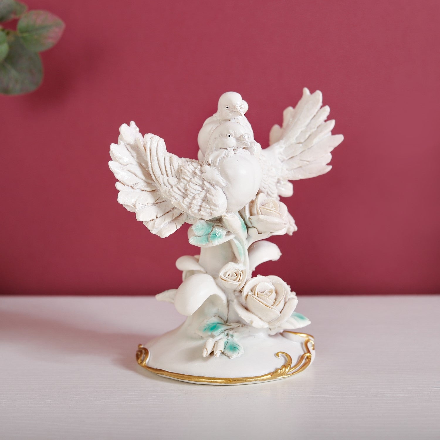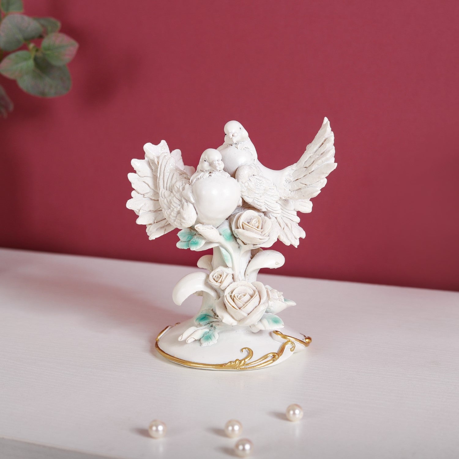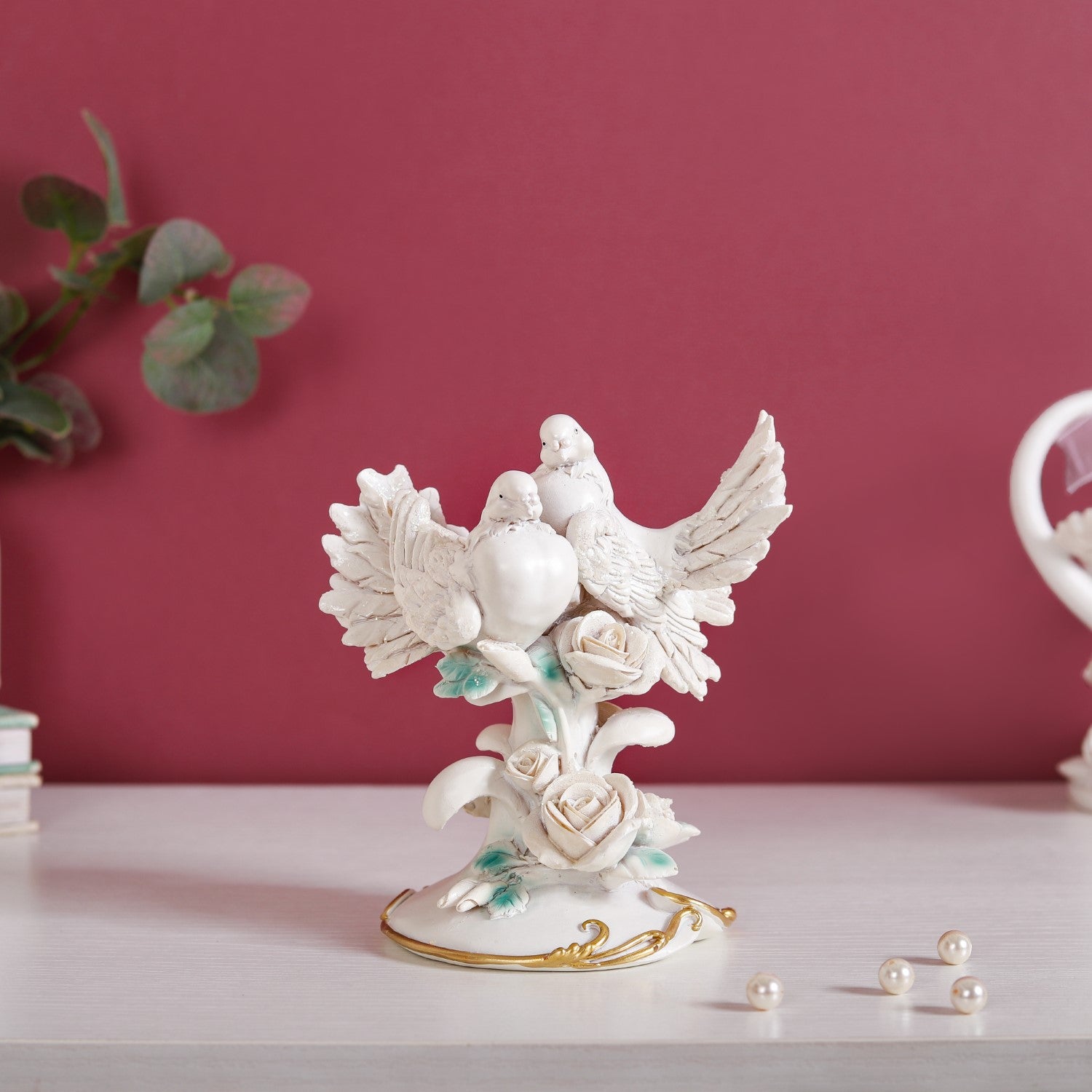 Experience the embodiment of timeless love and beauty through our exquisite white resin showpiece. Meticulously designed, this decorative showpiece showcases two serene doves perched gracefully atop a stem adorned with intricately carved roses and leaves. Set atop a pedestal base, elegantly encircled by a golden vine, this showpiece seamlessly merges the grace of nature with unparalleled artistic craftsmanship. Embrace the serenity and refinement that this resin showpiece brings to your home decor, a captivating addition that encapsulates the fusion of love and artistry.