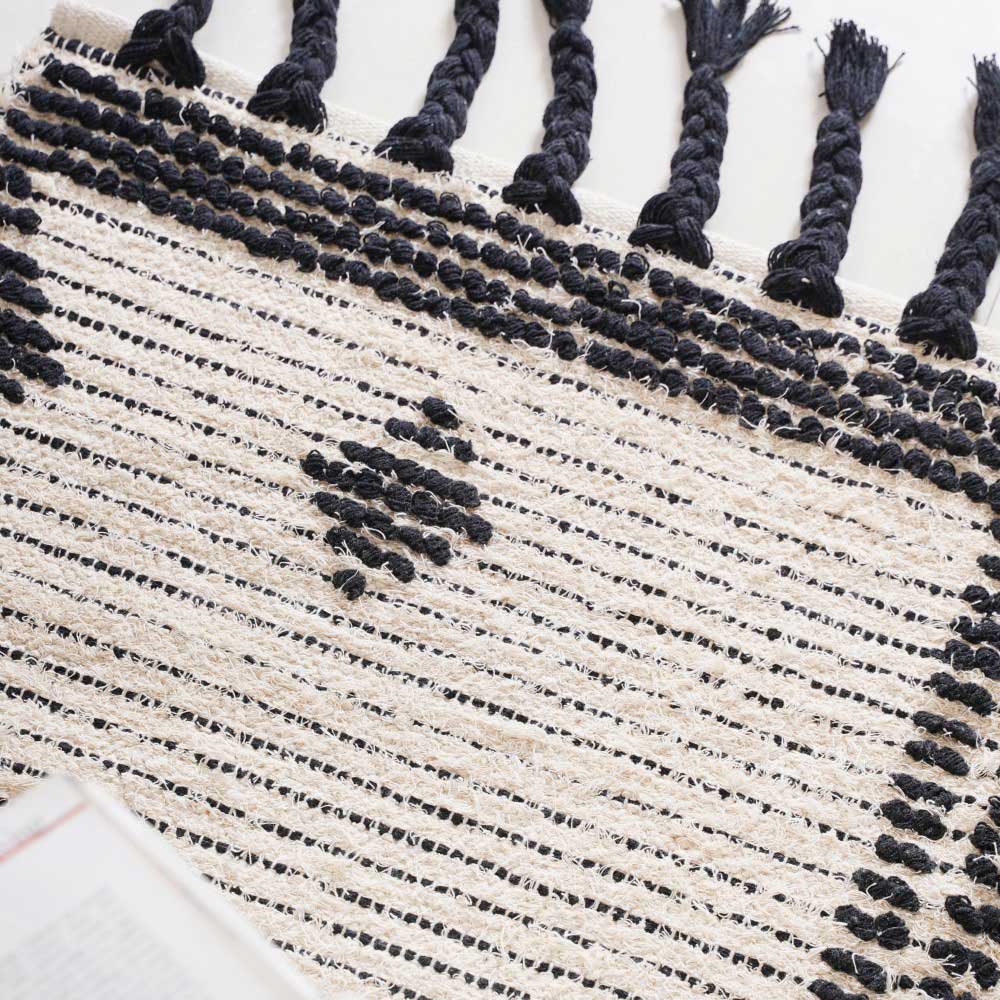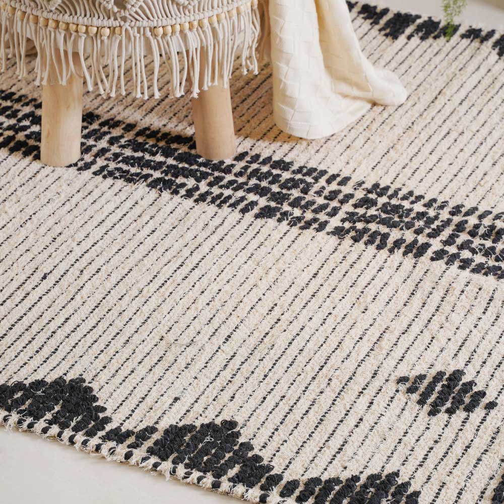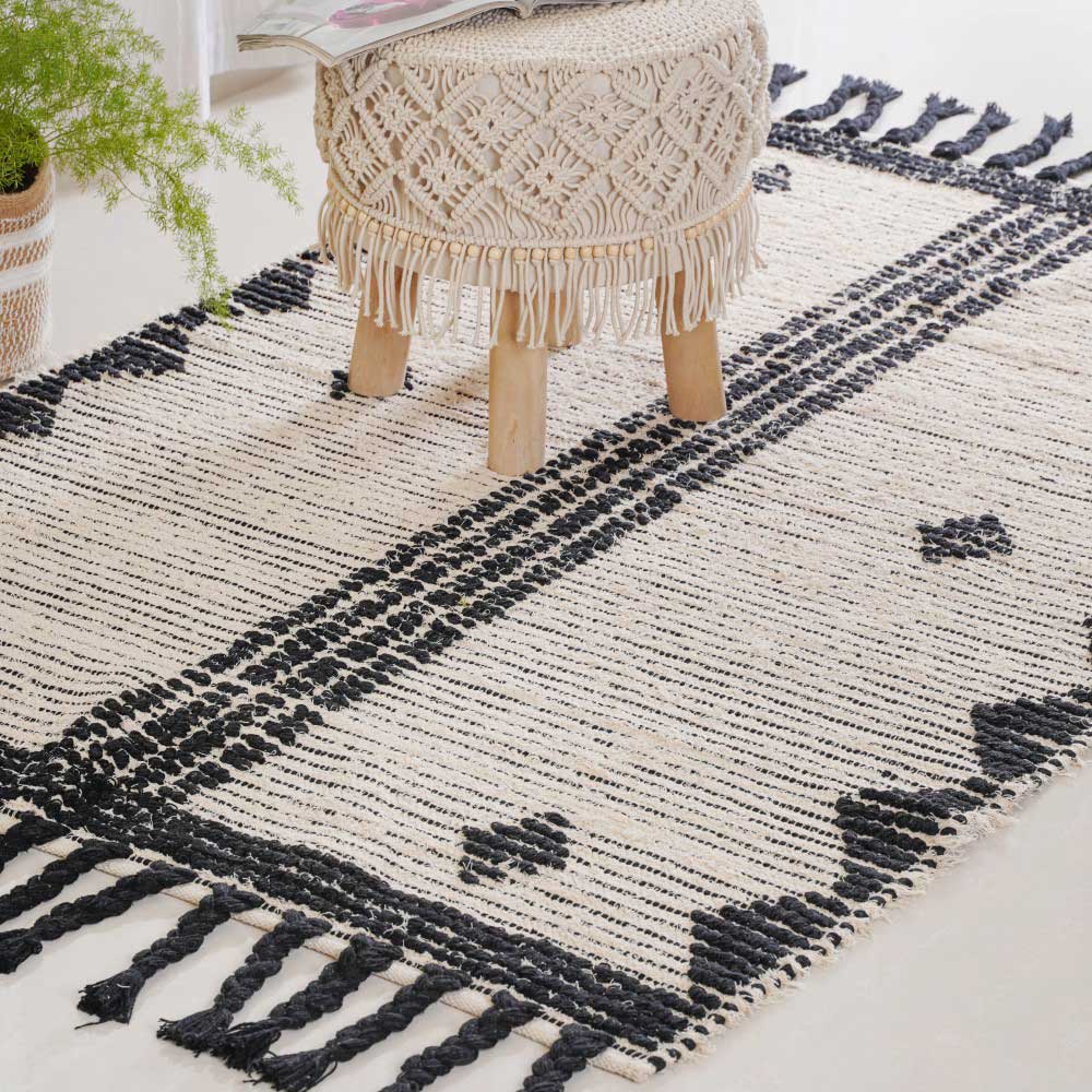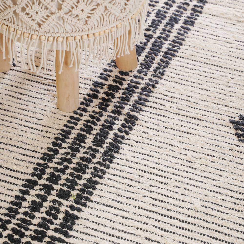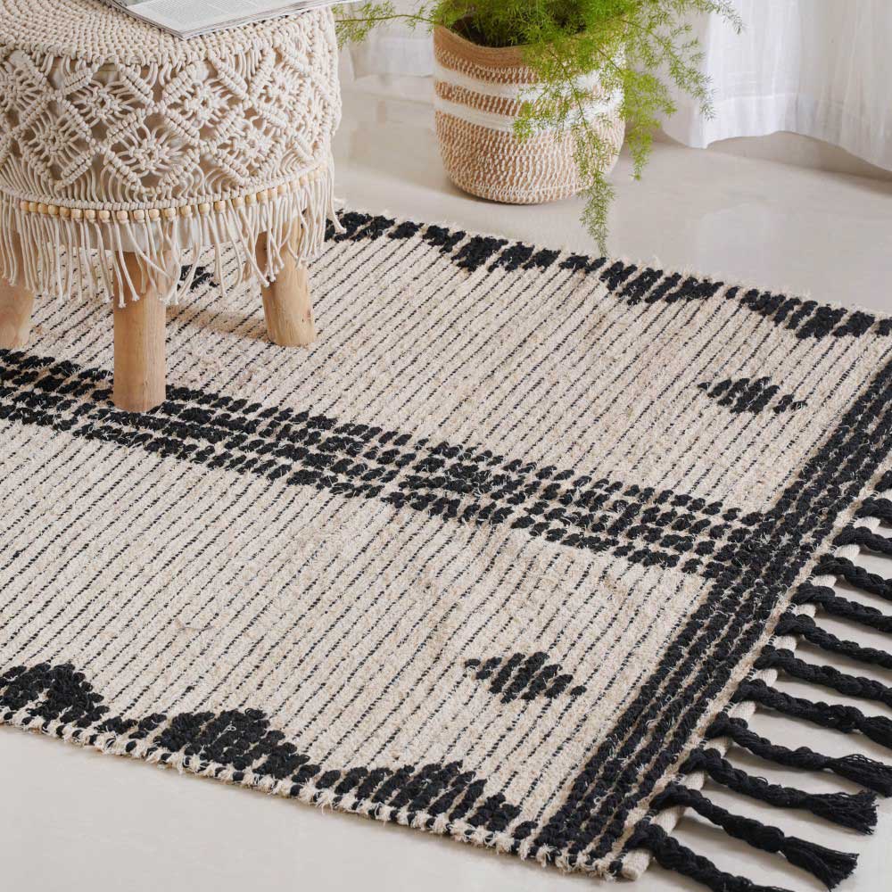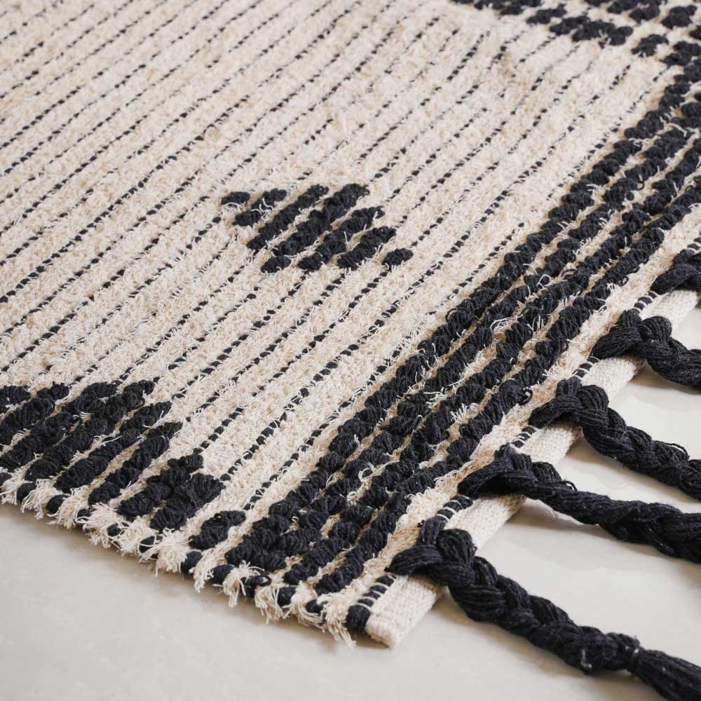 The black and beige cotton rug with abstract patterns is designed to elevate the look of one’s home decor by adding a bohemian touch to it. The modern carpet can be paired with black cushions to enhance the look of a bedroom or living room. One can also style up the balconies with the unique patterned rugs from our collection.