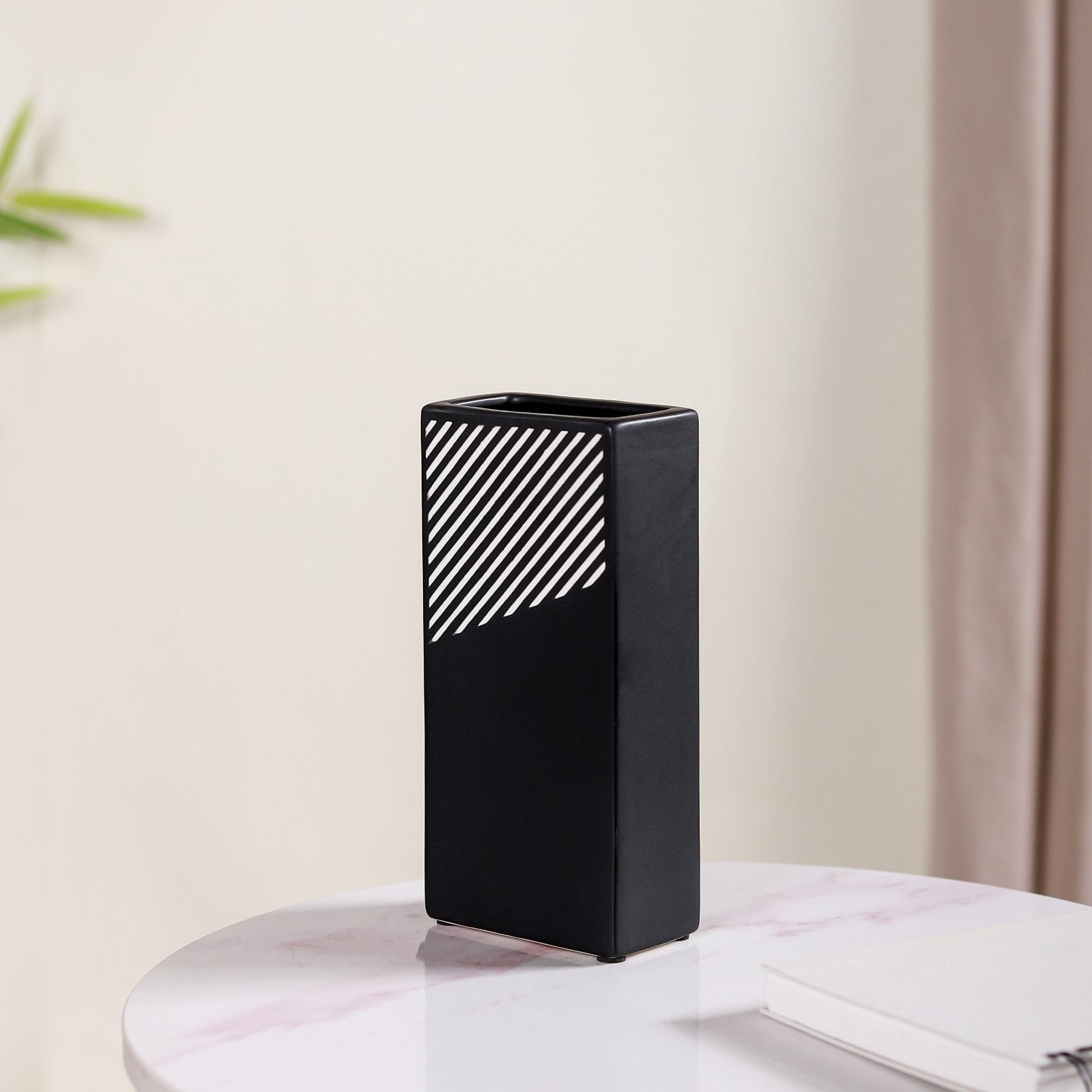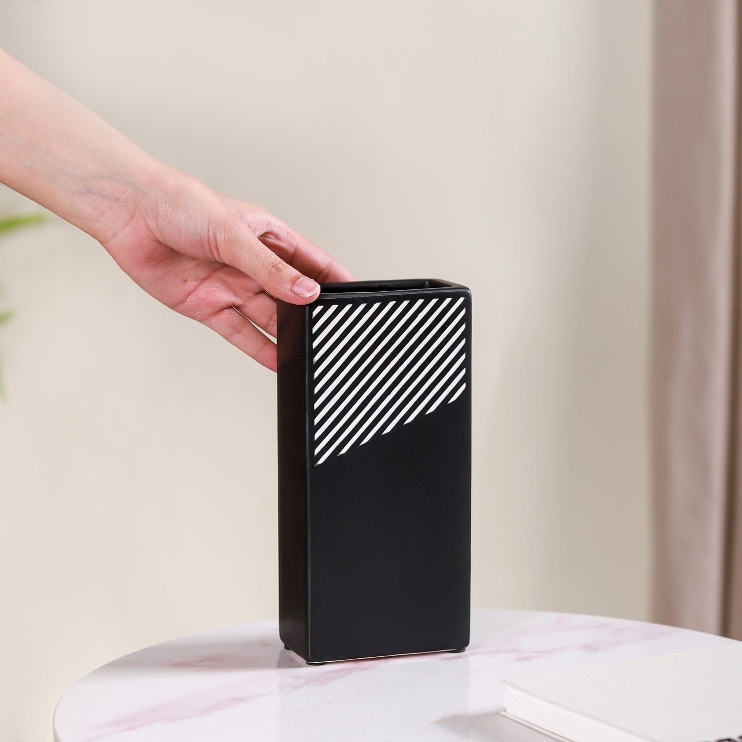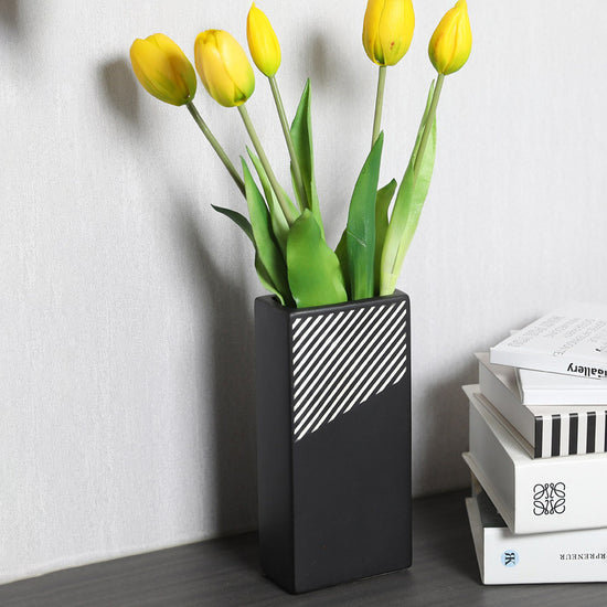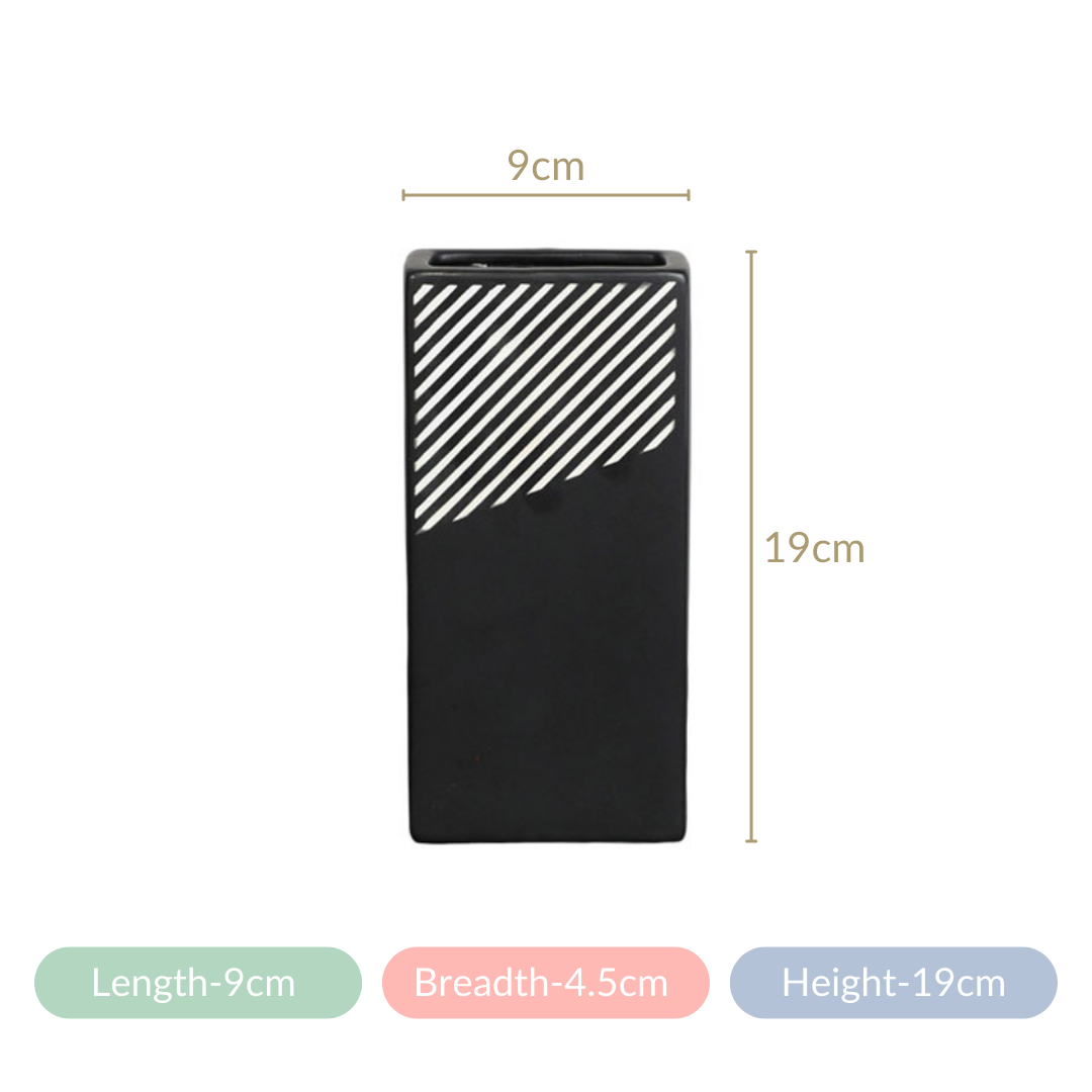 The vase features a sleek and modern rectangular shape that adds a contemporary touch to its design. This shape is well-suited for accommodating flower bouquets and makes it an excellent choice for enhancing your living room decor or as a stylish gift option. The ceramic vase features a distinctive rectangular shape, which, combined with its premium quality ceramic construction, durable and long-lasting nature, and smooth matte finish, creates a modern and minimalist design. Its black and white striped pattern adds an elegant touch to its aesthetic appeal.
