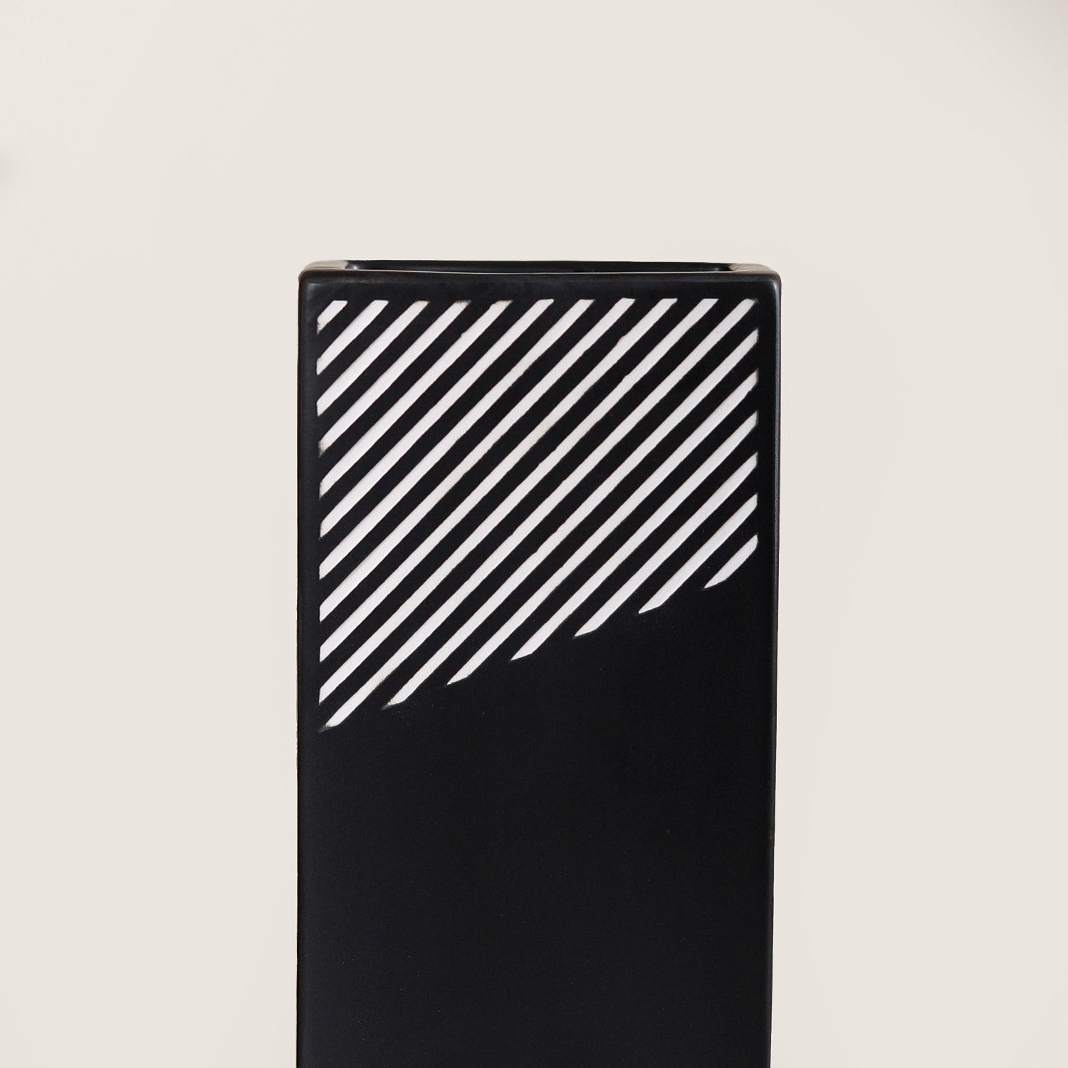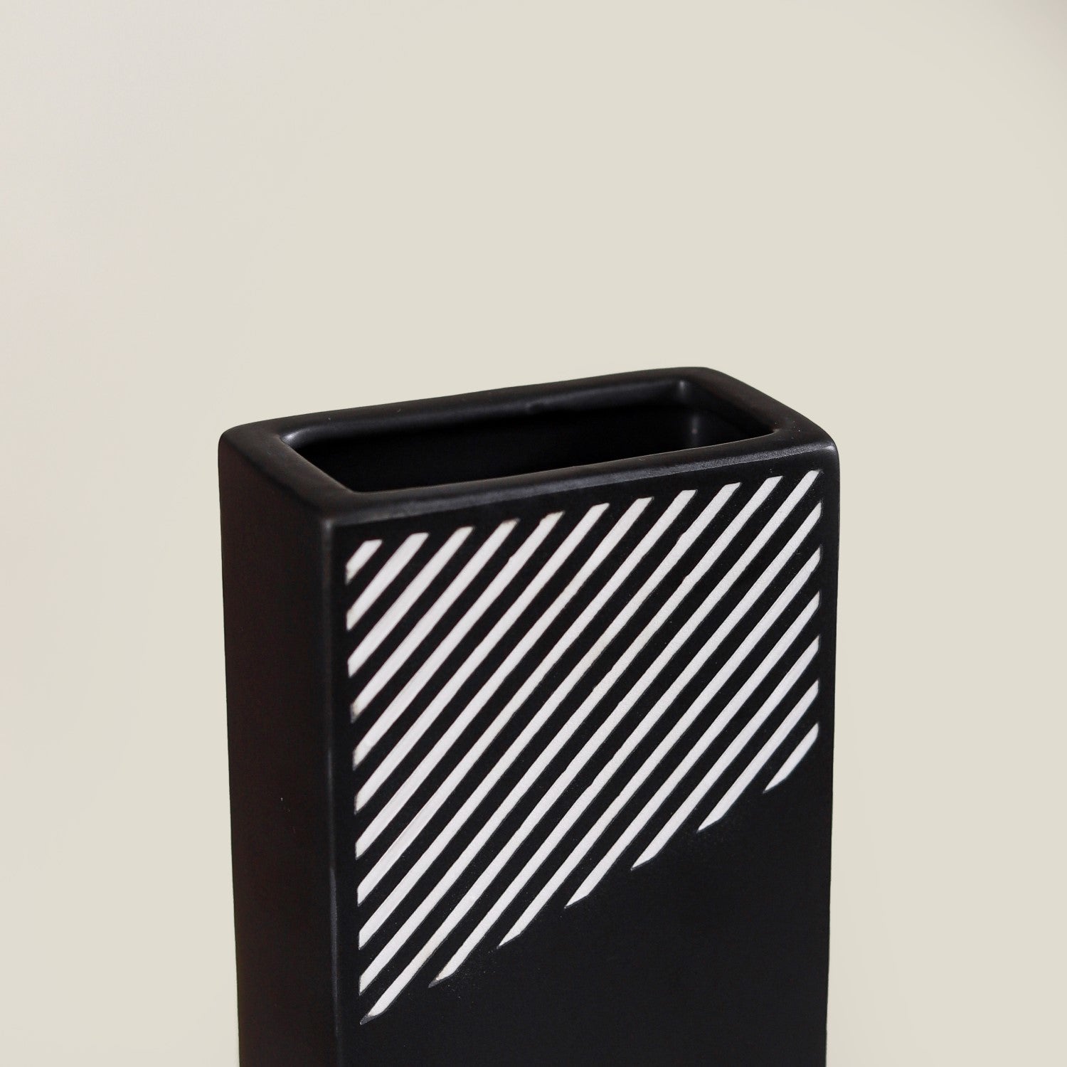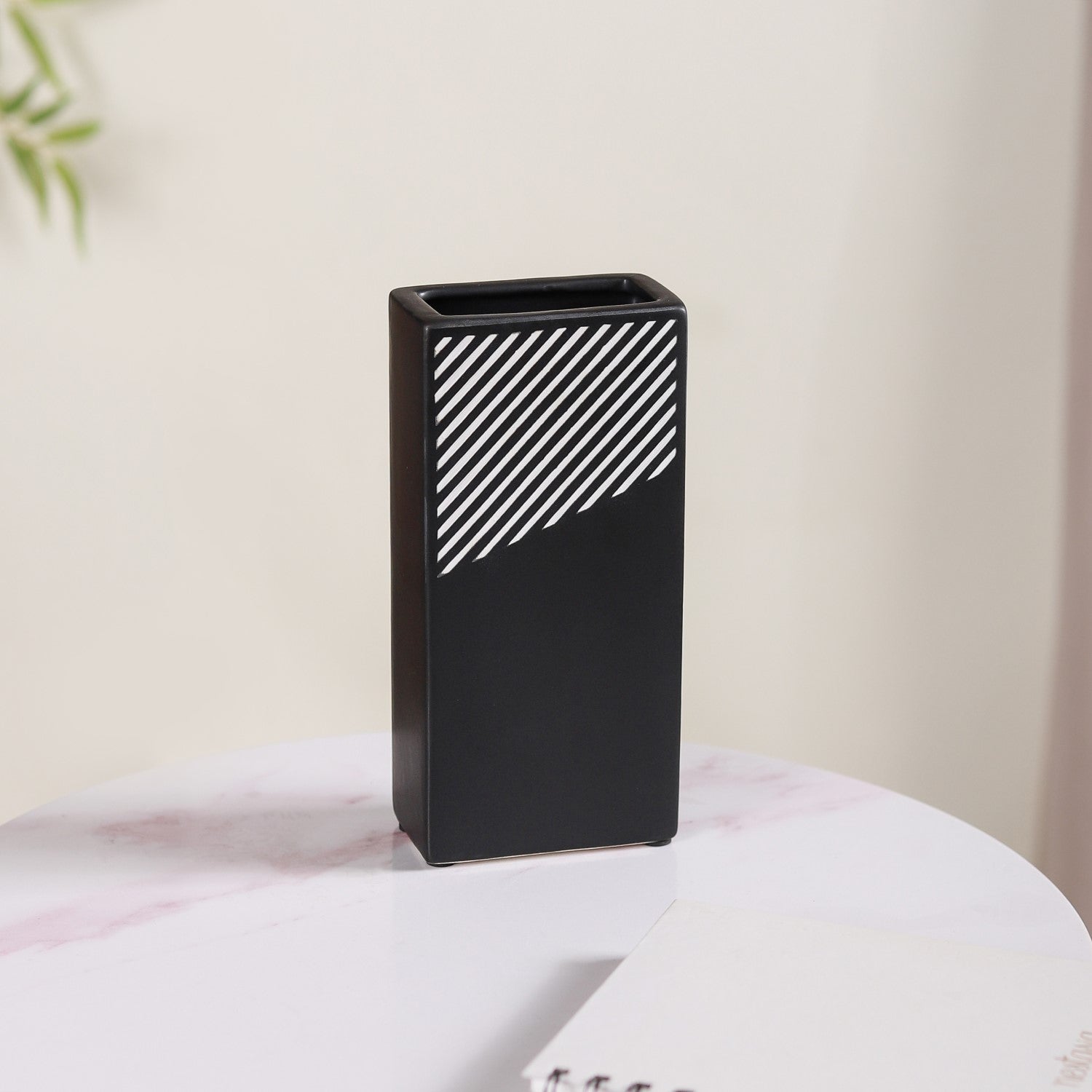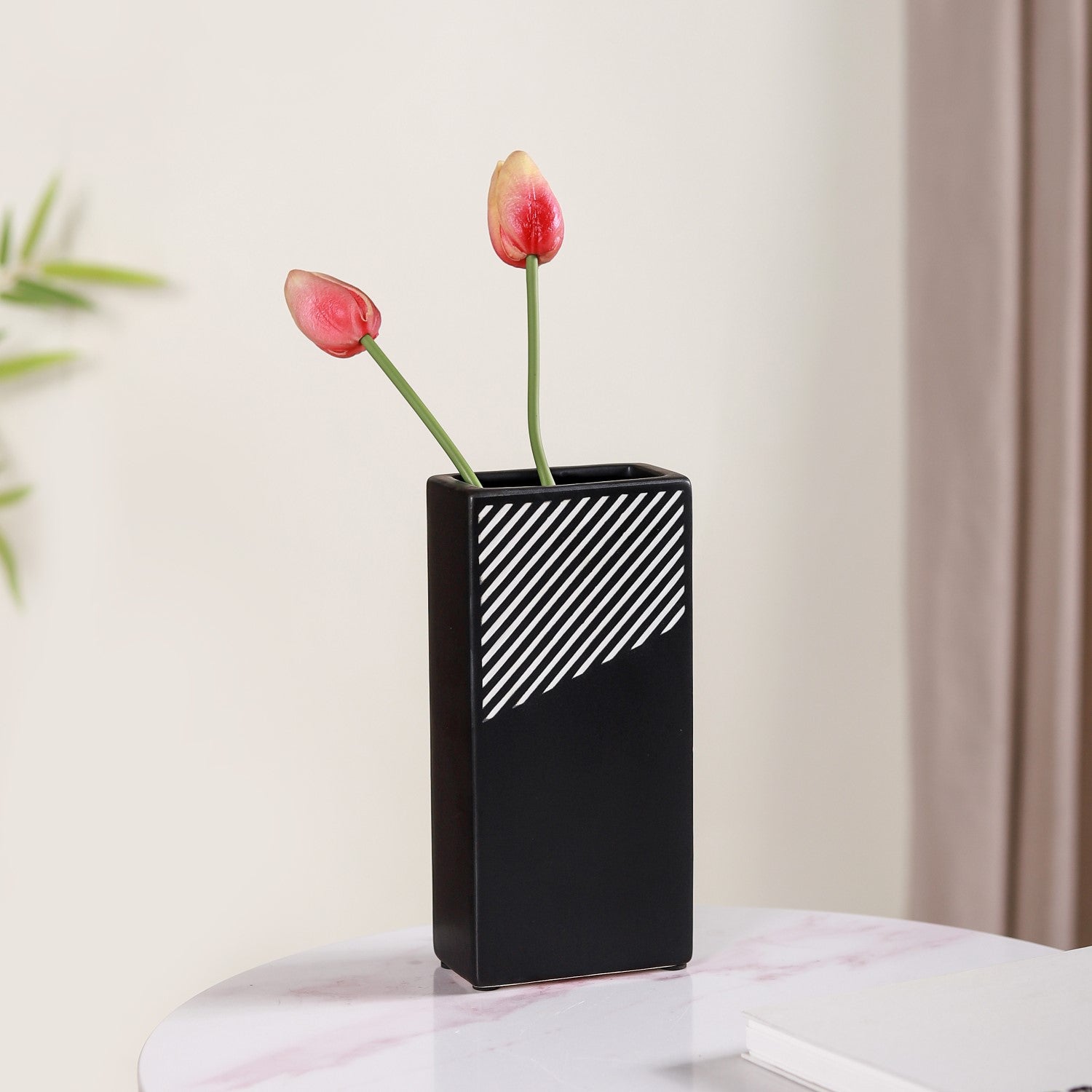 The vase features a sleek and modern rectangular shape that adds a contemporary touch to its design. This shape is well-suited for accommodating flower bouquets and makes it an excellent choice for enhancing your living room decor or as a stylish gift option. The ceramic vase features a distinctive rectangular shape, which, combined with its premium quality ceramic construction, durable and long-lasting nature, and smooth matte finish, creates a modern and minimalist design. Its black and white striped pattern adds an elegant touch to its aesthetic appeal.