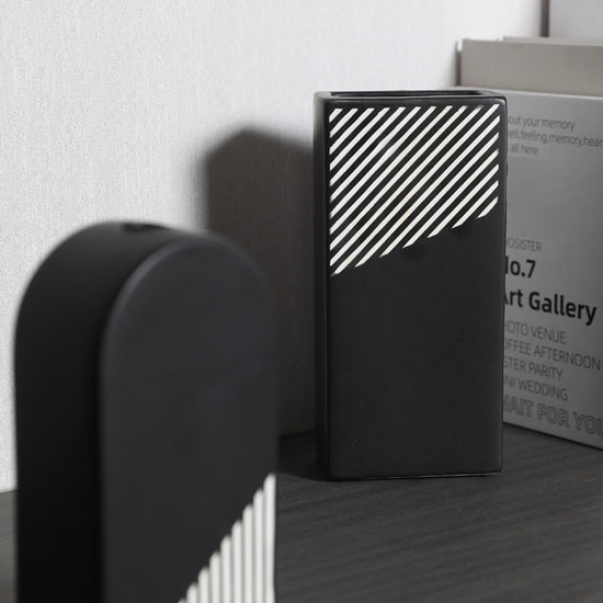 The vase has a modern minimalistic design which is complemented by a black and white striped pattern. This design combines clean lines, simplicity, and the striking contrast of black and white to create an elegant and contemporary aesthetic. It is a versatile design that can enhance various decor styles, making it an excellent choice for living room decor and gifting.