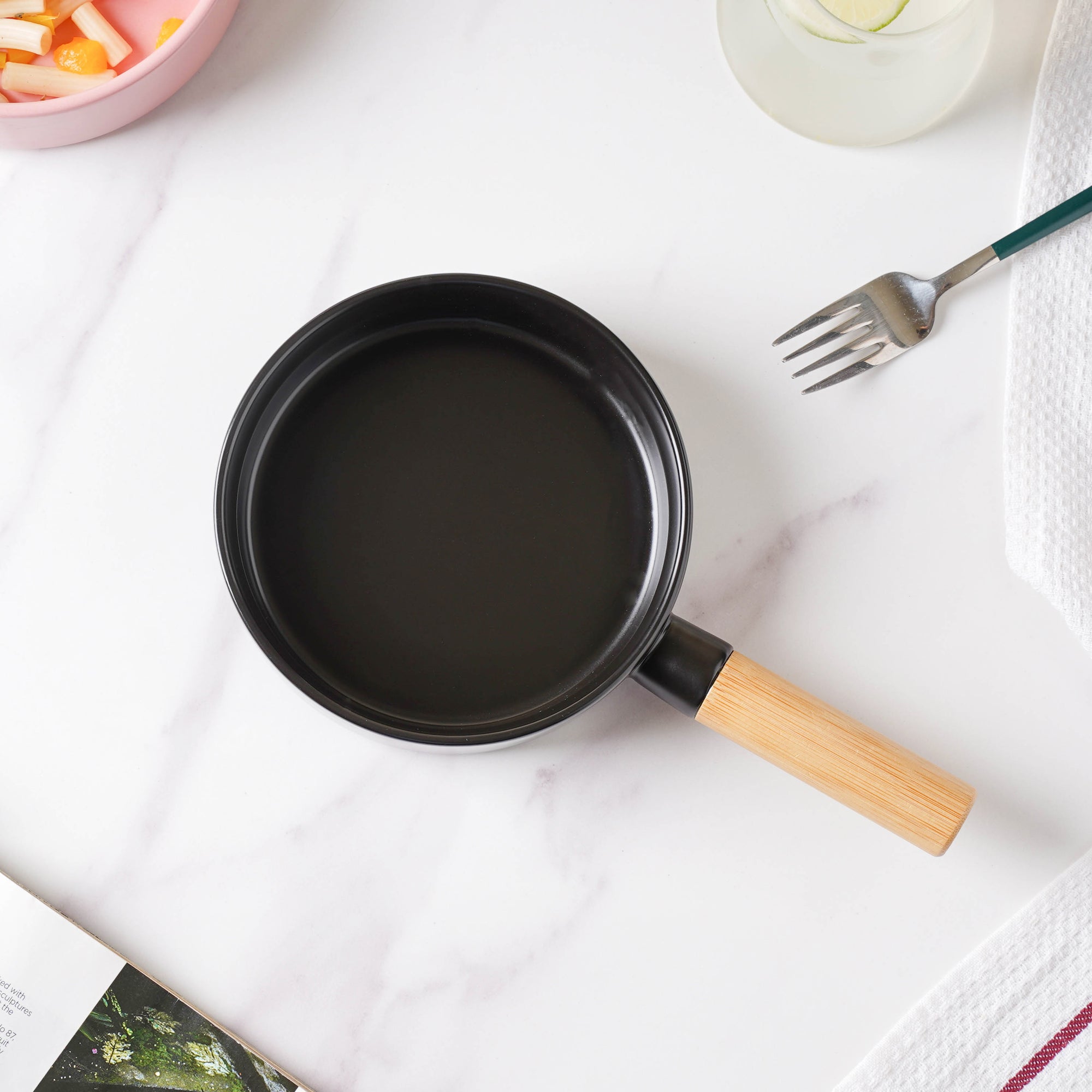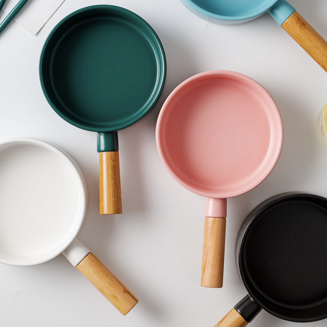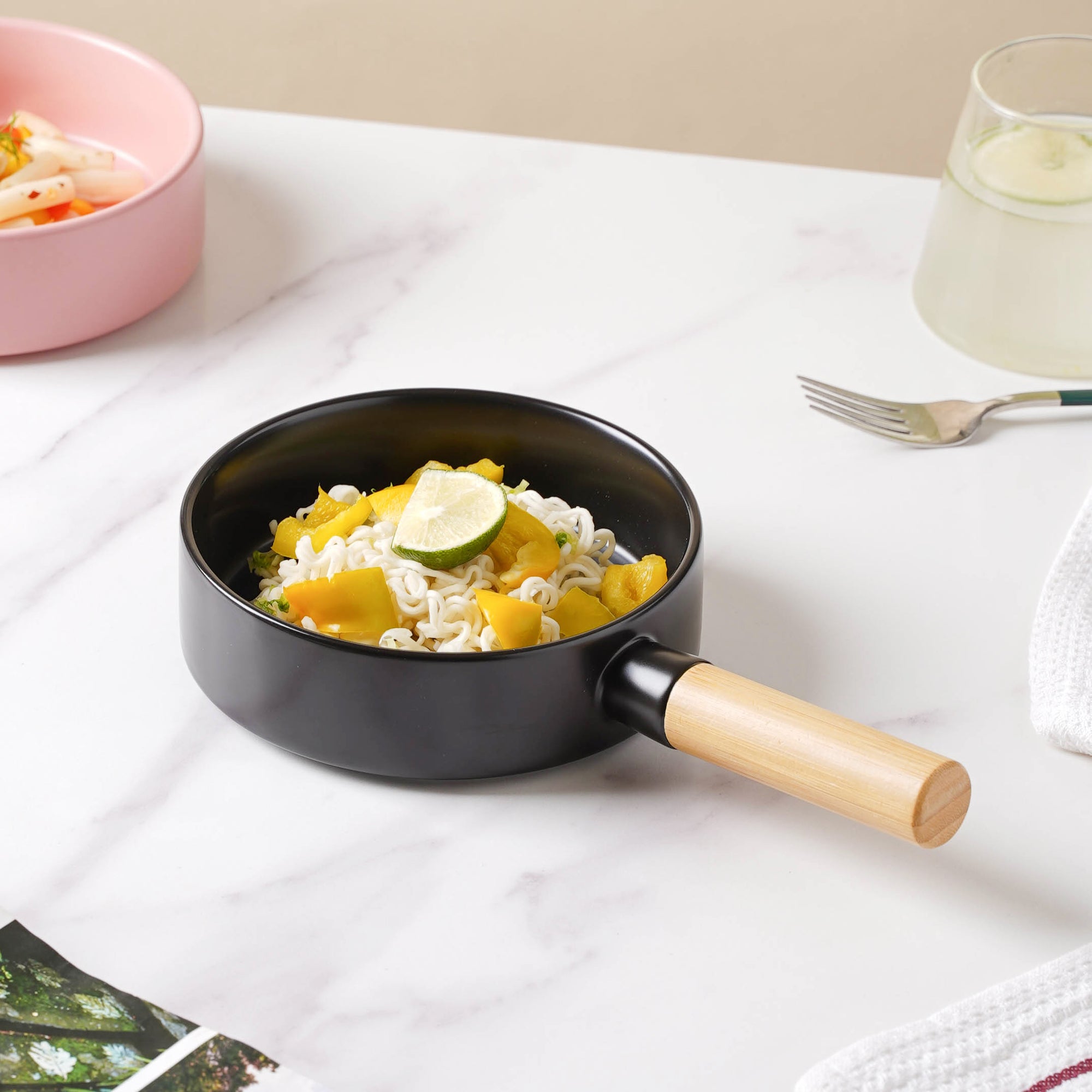The ceramic deep snack plate features a wooden handle that provides ease in carrying the dish, especially when the food is warm. The plate's design makes it a contemporary addition to the table while the utilitarian wooden handle gives the plate a boost of modern aesthetic. The classic black base of the plate will make any dish served in it look truly exotic.