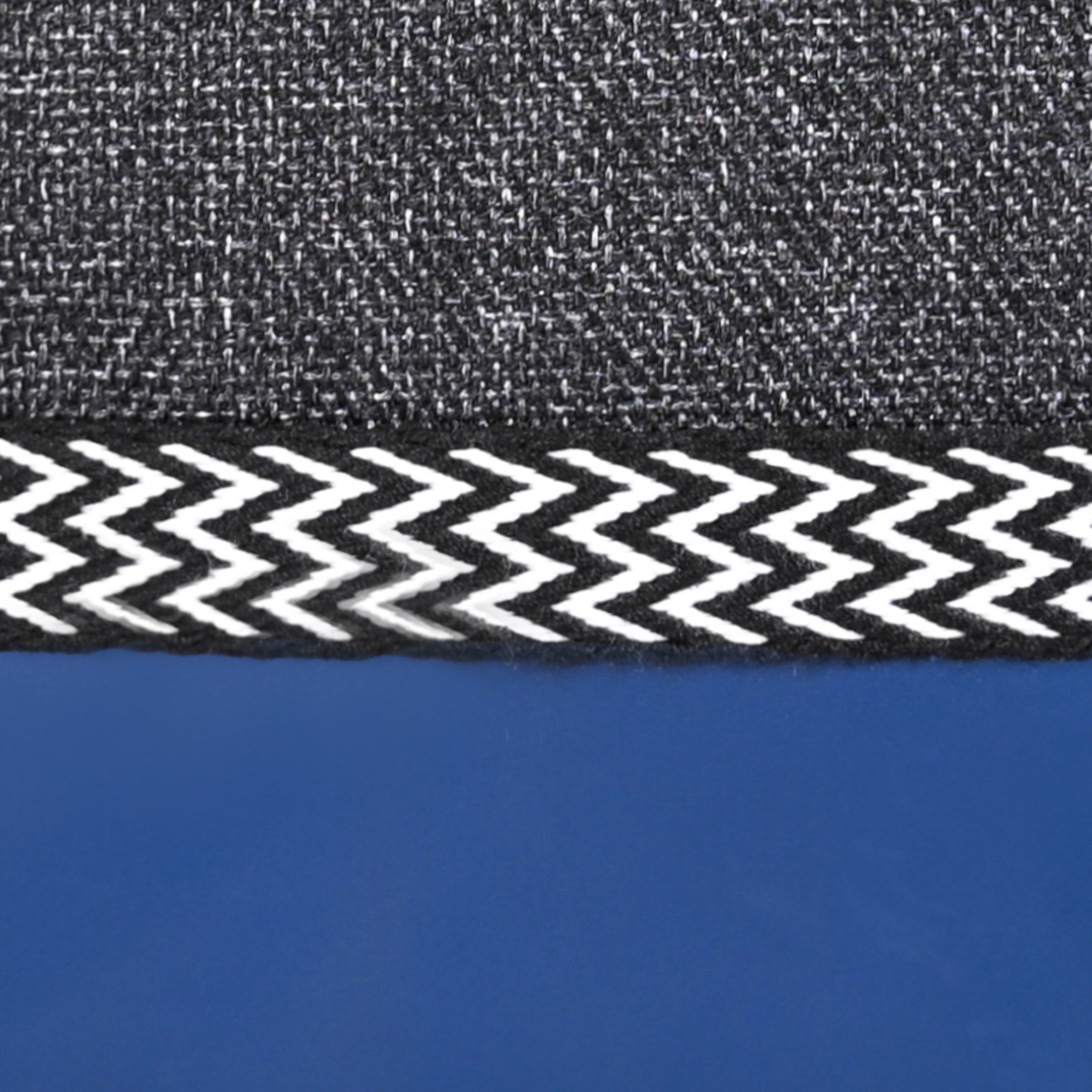 Design: This modern lunch bag features a structured rectangular shape with an eye-catching three-panel design. The upper section is made from a rich black jute material, providing a tactile texture, while the bottom section is a smooth, deep navy PU leather. A striking black and white chevron pattern separates the two fabrics, adding a contemporary detail. The design is completed with practical black niwar handles, creating a stylish and lightweight portable design.