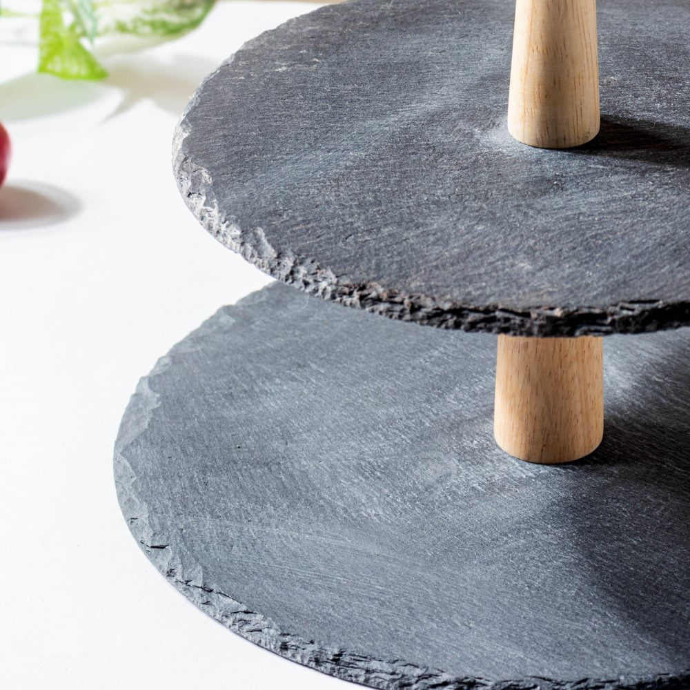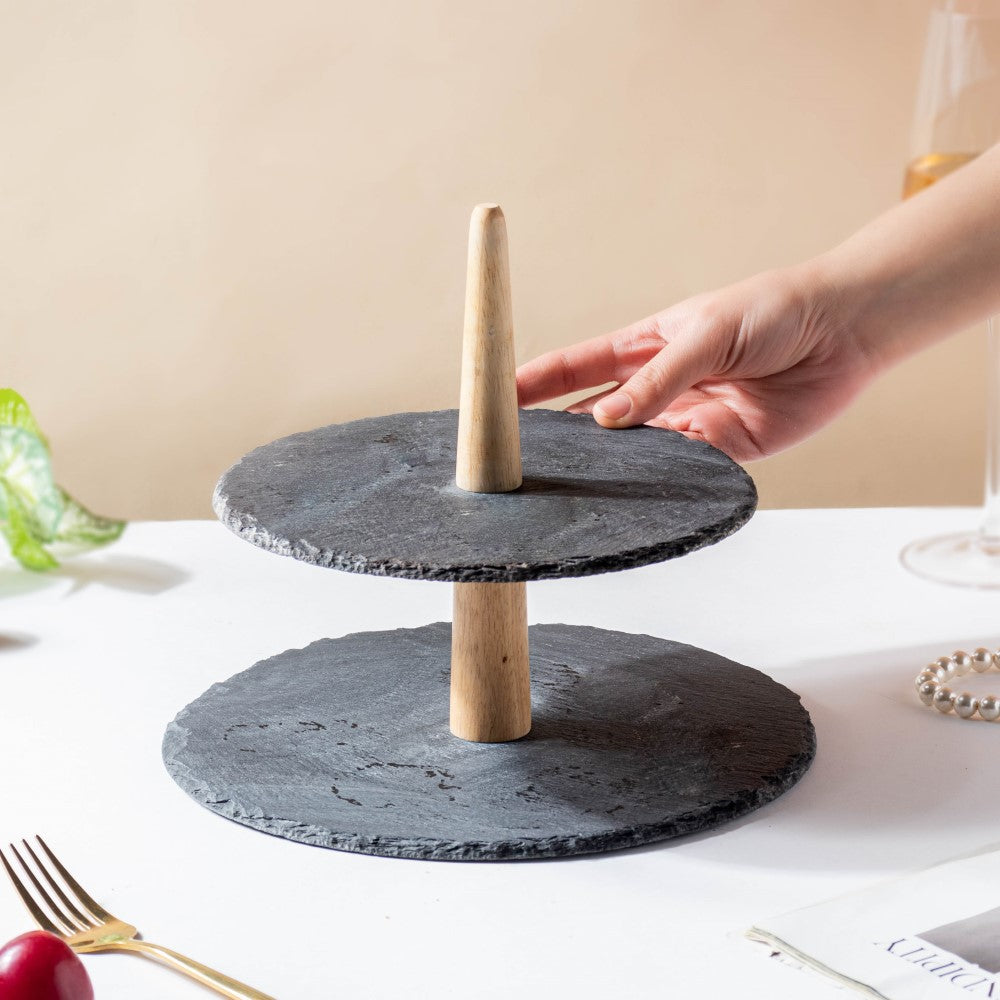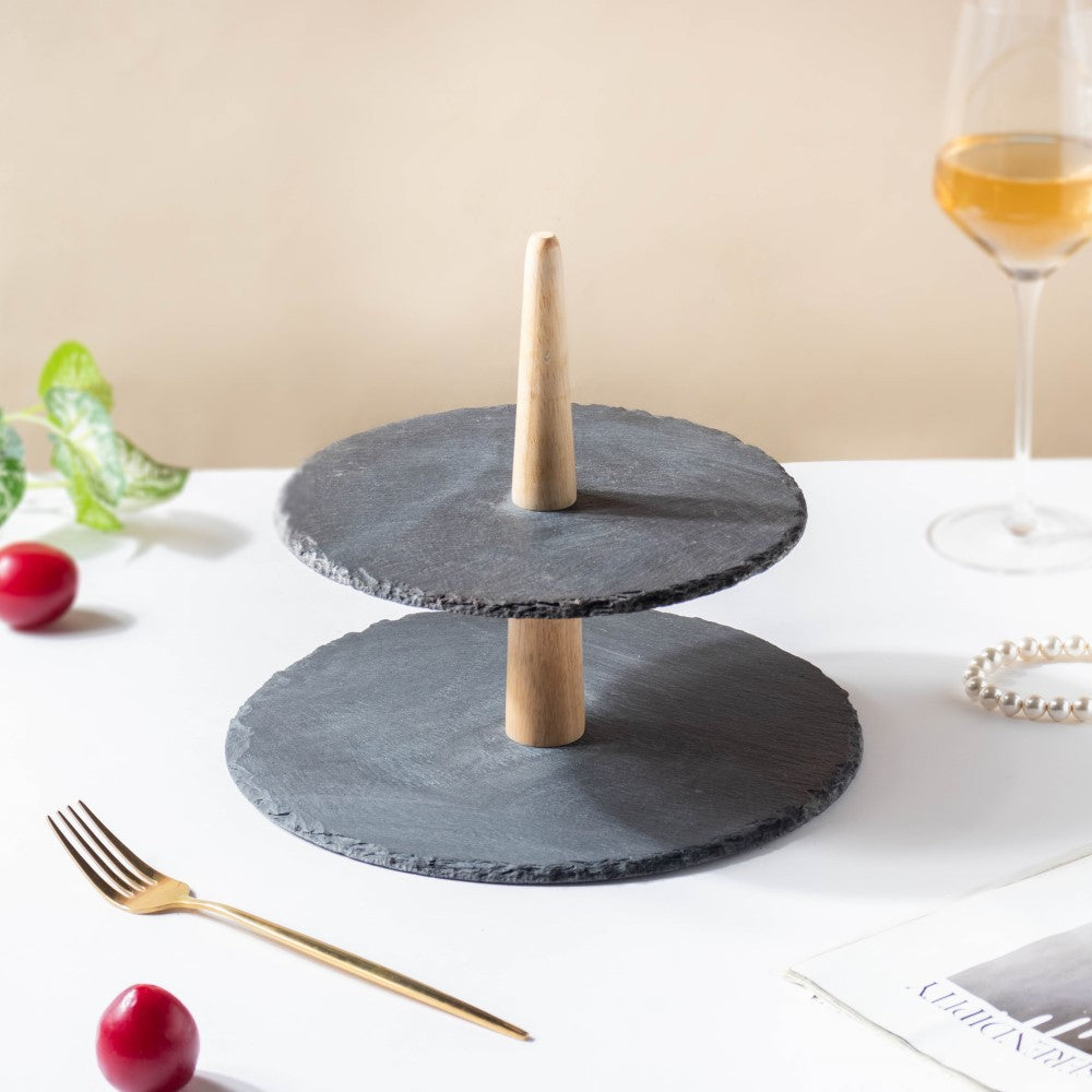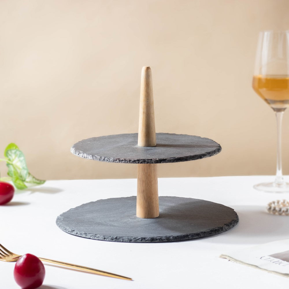 Black cupcake stand that comes with two slate dishes is a two tier cake and cupcake stand. The cake stand has a wooden holder which makes it easy to pick, place, and pass around a dining table. The cupcake stand is apt for adding height extension and a rustic stoneware aesthetic to any a dining table. The dessert stand can also be used as a jewellery stand when placed on a dresser.
