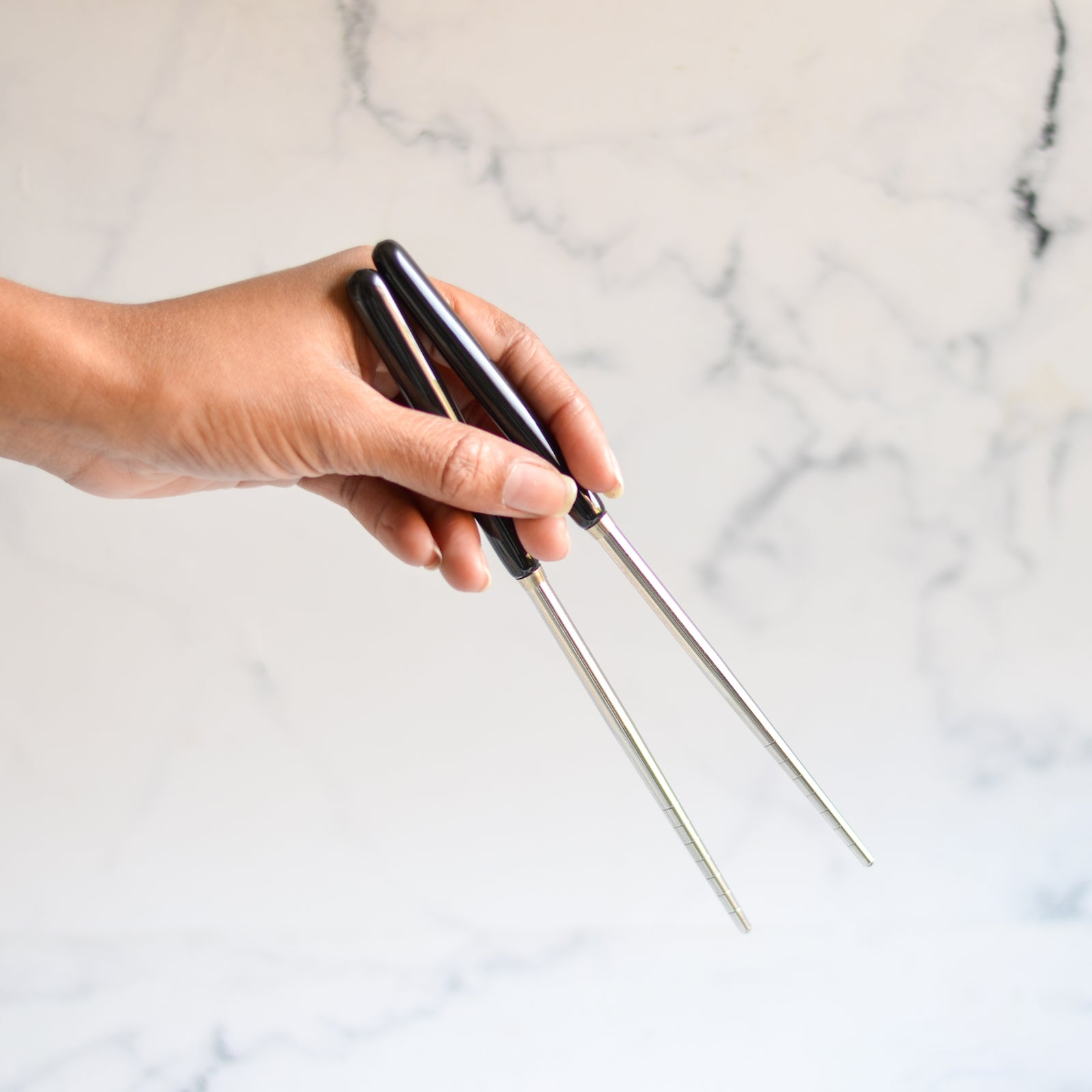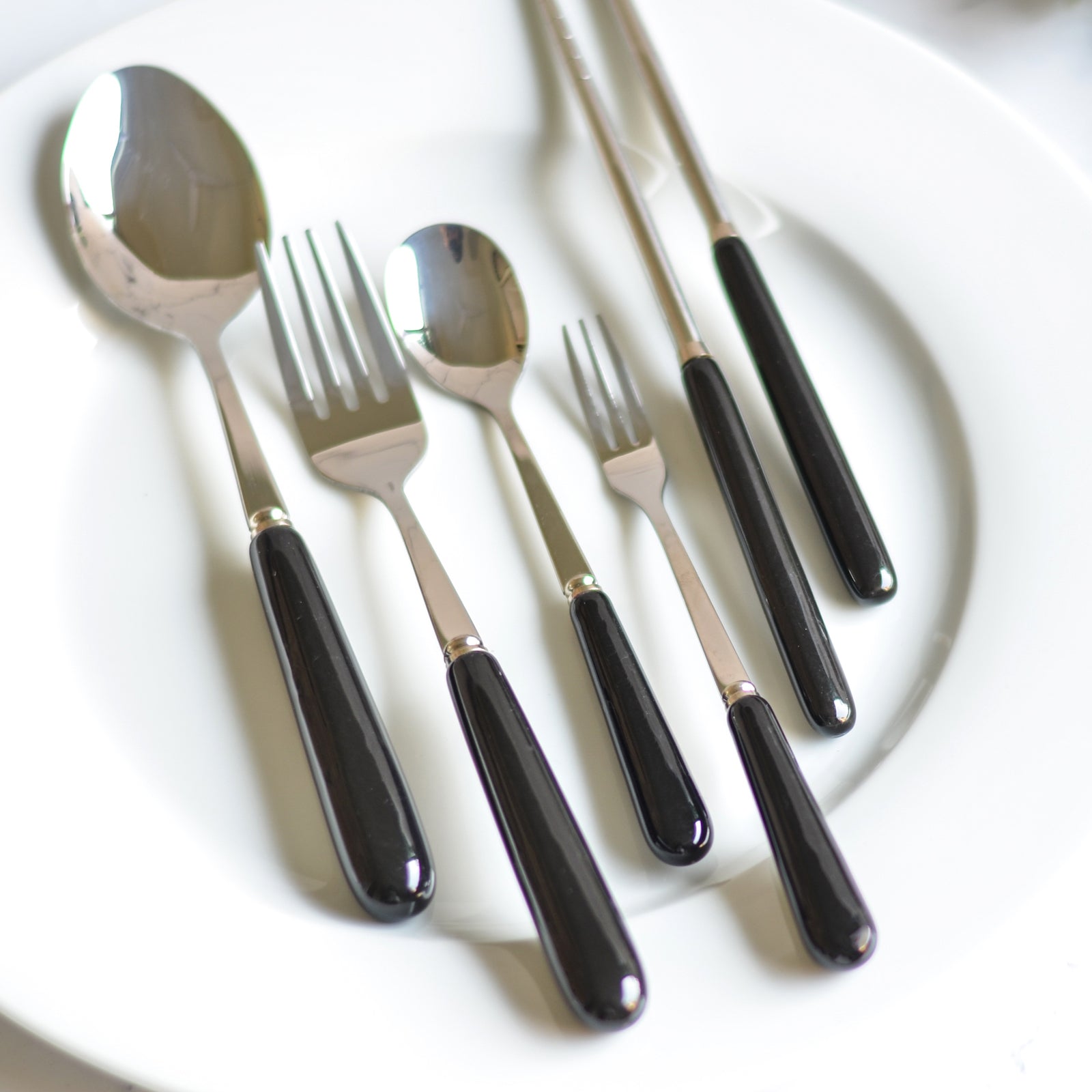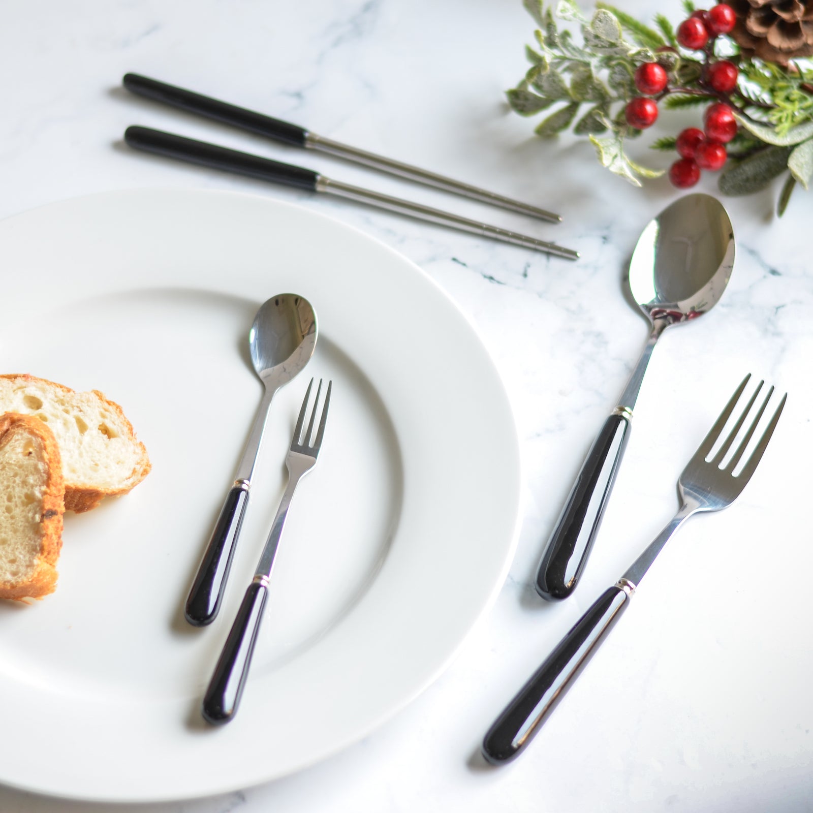 Black cutlery of 5 pieces that comes in classic silver base and black handle. The cutlery set has 2 forks, 2 spoons and a set of chopsticks that can help in a serving of a complete meal with salads, starters like dumplings, main course like noodles, rice and stew and desserts like pastries and ice cream. The neutral colour of the set allows it to be paired with all types of crockery.