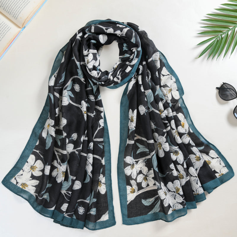 Elevate your ensemble every day with our black summer scarf featuring floral patterns. Crafted with premium quality fabric which feels incredibly soft and comfortable against the skin, one of the standout features of this summer scarf is the printed floral patterns over the black background. This design looks exquisite with the delicate white flowers having yellow accents and slate grey leaves alongside the dark green border of the scarf. The best part about this ladies' scarf is its versatility, not only because of the colour combination but also because of the numerous ways that this scarf can be styled. Experience the softness of this all-season scarf while being protected against the sun's rays or the cold of the winter throughout the year. Ideal for gifting, this scarf can be the perfect gift option for your loved ones for several occasions or just because.