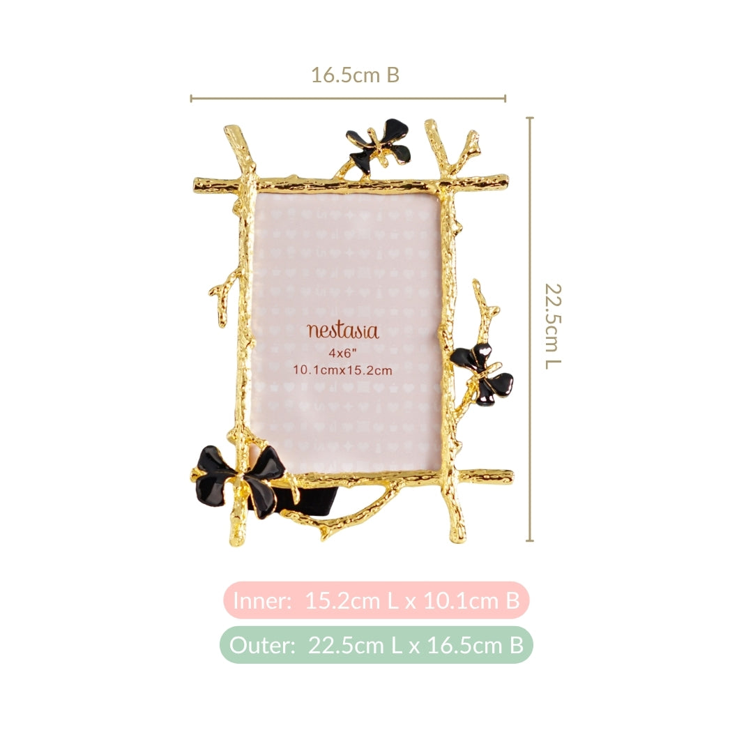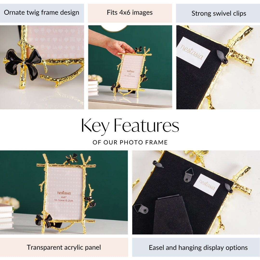 Design: This ornate photo frame has a gilded, textured, branch-like gold finish. Black enamel bow accents decorate the surface, lending an intricate, rustic look. It holds standard 4×6-inch photographs perfectly. The frame features a protective covering for photo clarity and a solid, stable easel stand for vertical display. It boasts durable construction and is designed for long-term use.