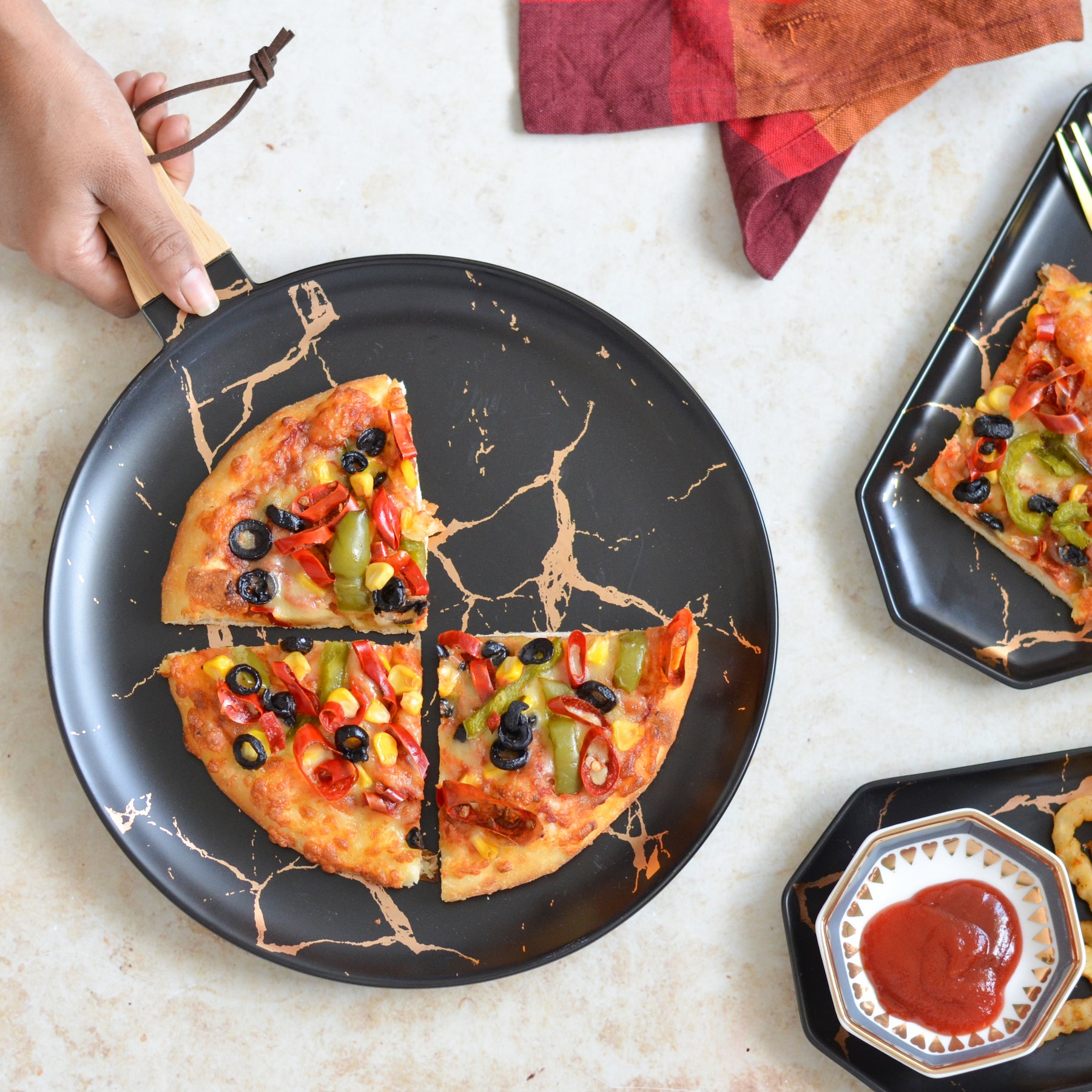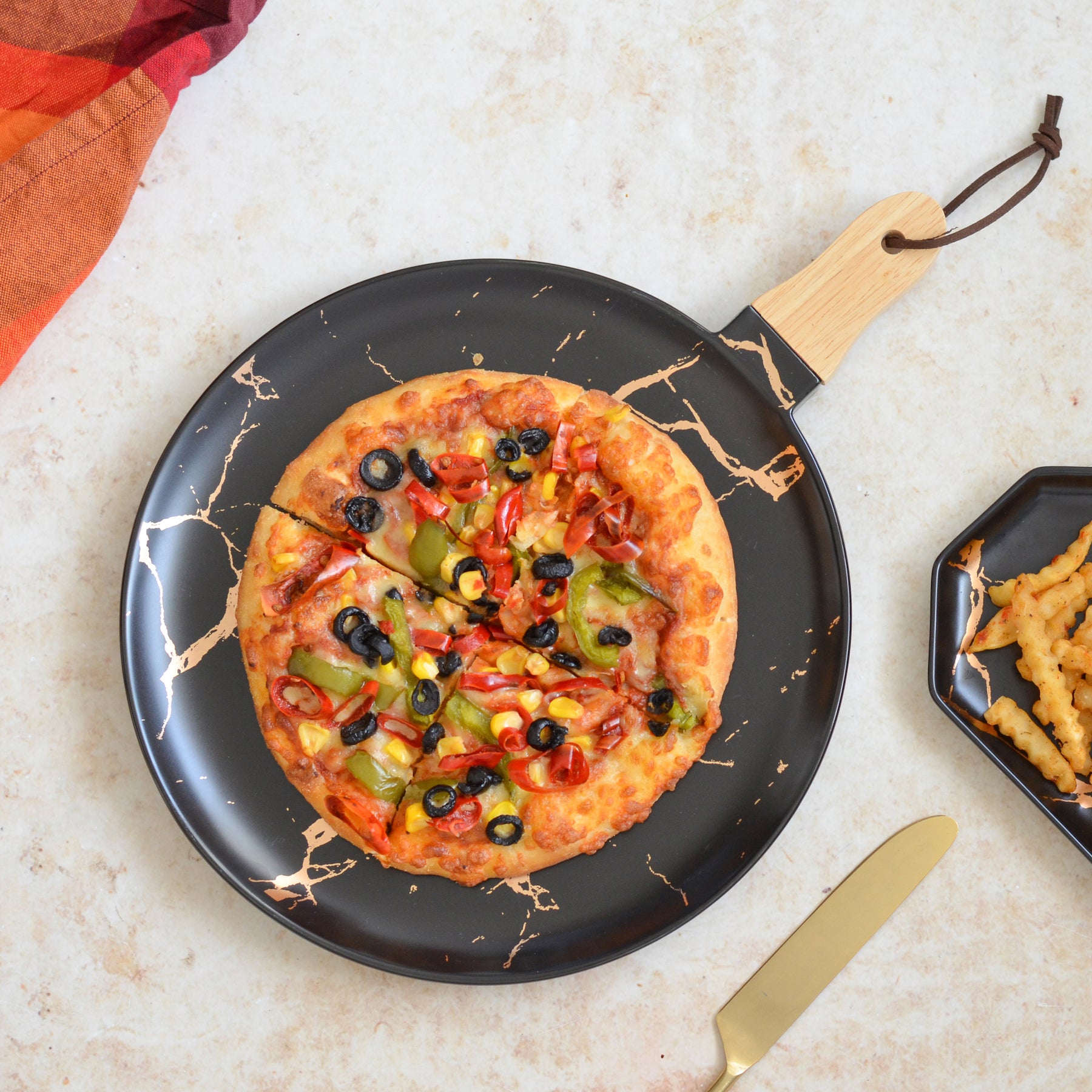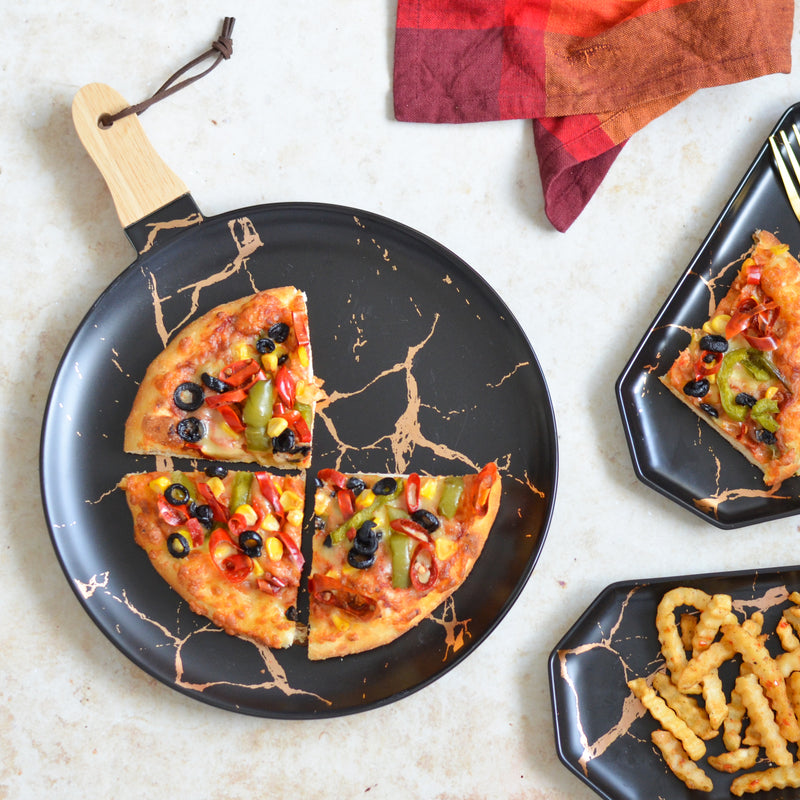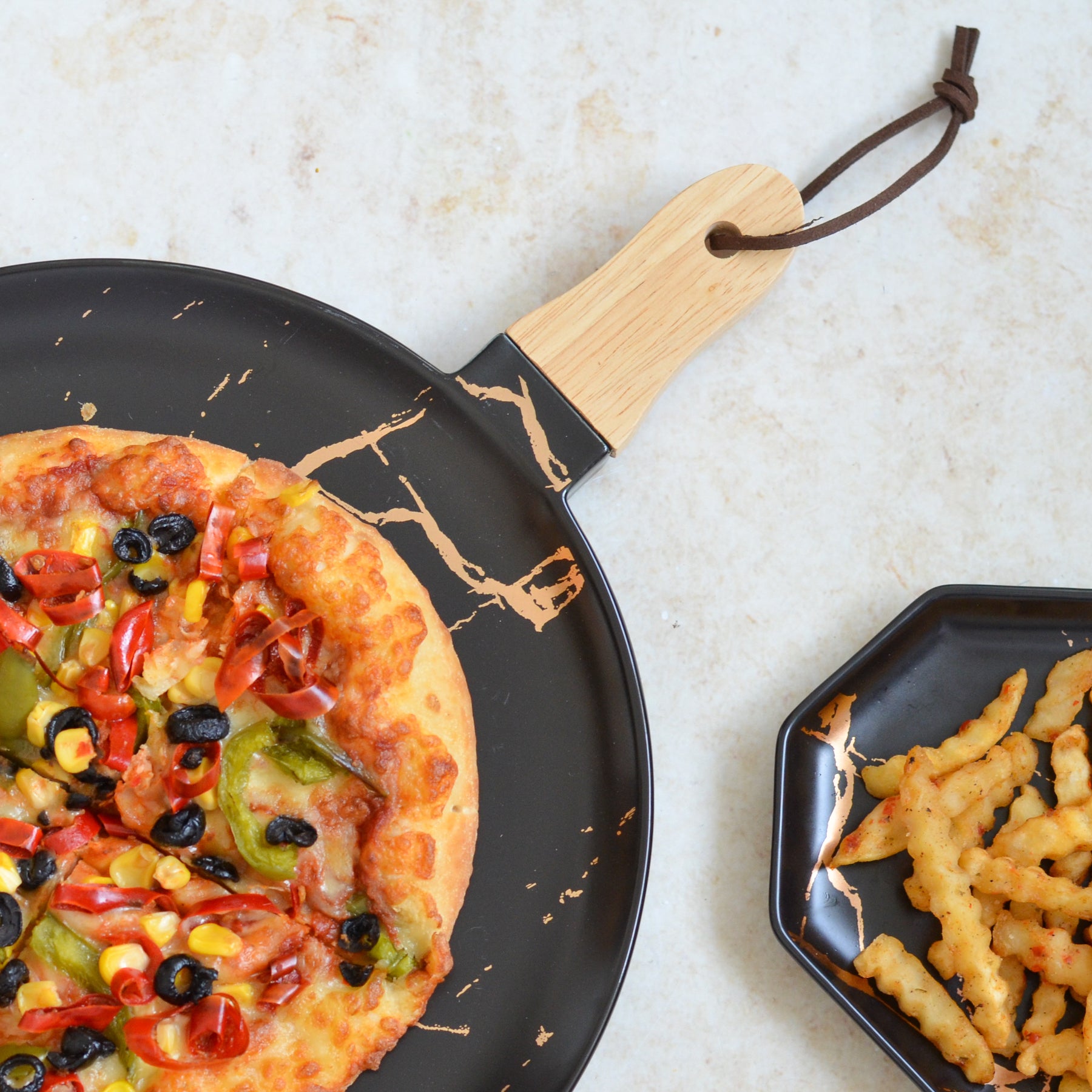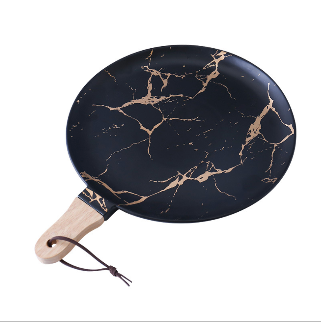 A matte finish black round dinner platter with wooden handle and gold marble pattern, apt as a dinner plate for serving up roasts, noodles, pasta and more. It can be pairs with the matching side plates for a dining table setting.