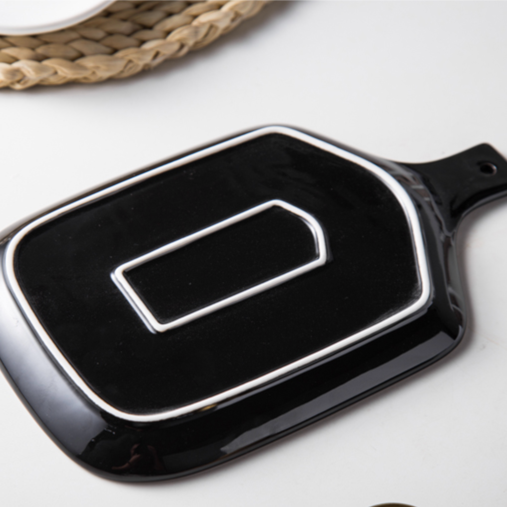 A black platter made in ceramic has a marble pattern and can be used as a dinner plate or a serving platter. The plate with a handle can be used as a snack plate, starter plate, or even a fruit plate for serving appetizers or fruit salad. The ceramic plate can be used as a baking plating or for heating food as it is a microwave safe plate.Nestip: The marble plate can be paired with the black marble bowl for a serving Material: Ceramic (microwave safe)Colour: BlackSize: 32cm x 20cm x 2.2 cm HStyle: 20NJ14