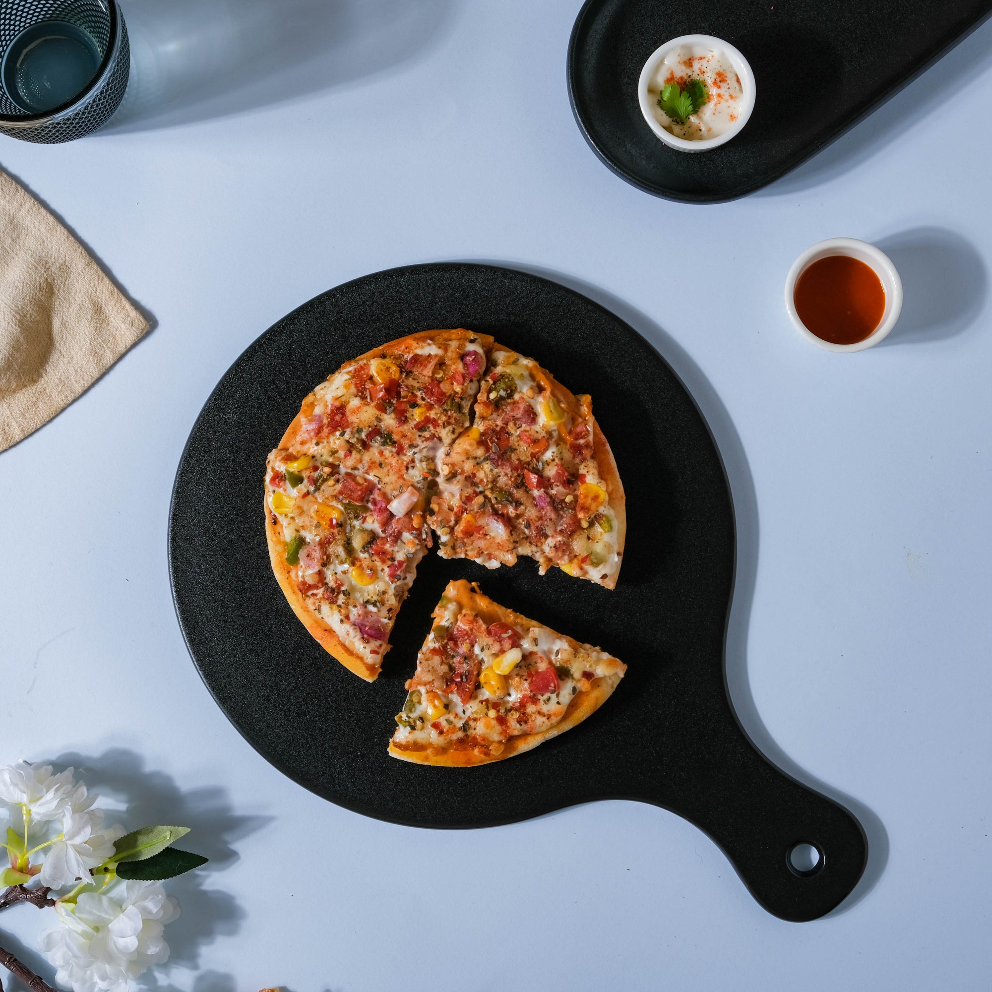 A pizza or delectable pieces of cheesecake can be served on the round, matte black platter with a handle. In case the pizza goes cold, one can just pop it right back into the oven to reheat while it's still on the platter since it is microwave safe. The black platter can also be used to serve desserts, and the platter is dishwasher safe, so there's no need to worry about clean-up. The black platter can be used as a cheeseboard as well. The platter's handle makes it easier to pass around the table and makes dining a better experience altogether.