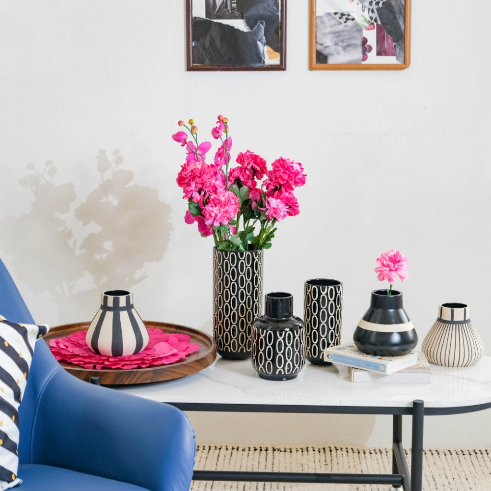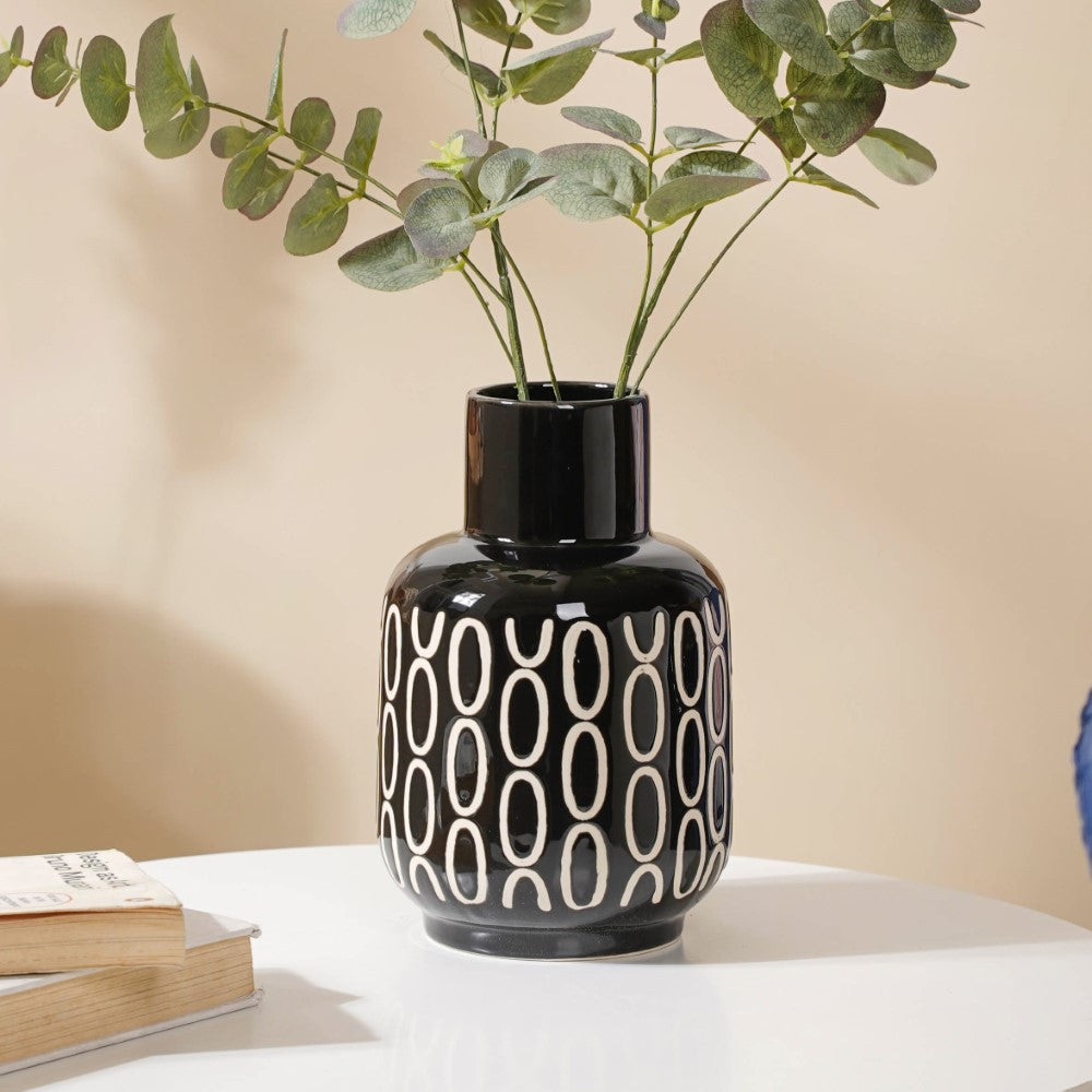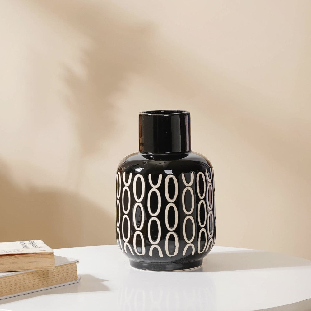 In any modern setting, the grand, elegant ceramic vase is sure to add opulence. The most in-demand trend has always been a magnificent blend of black and white, and that's what exactly is brought by the flower vase. Its artistry consists of a chic black mosaic body with white circular motifs. Nestip: Use it as a drawing room or living room decor. Size: 3.5" B x 2.5" D (top) x 8.2" H Color: Black and white Material: Ceramic Products included: 1 black room decor vase Style: XNYC69V17