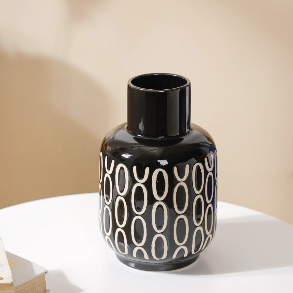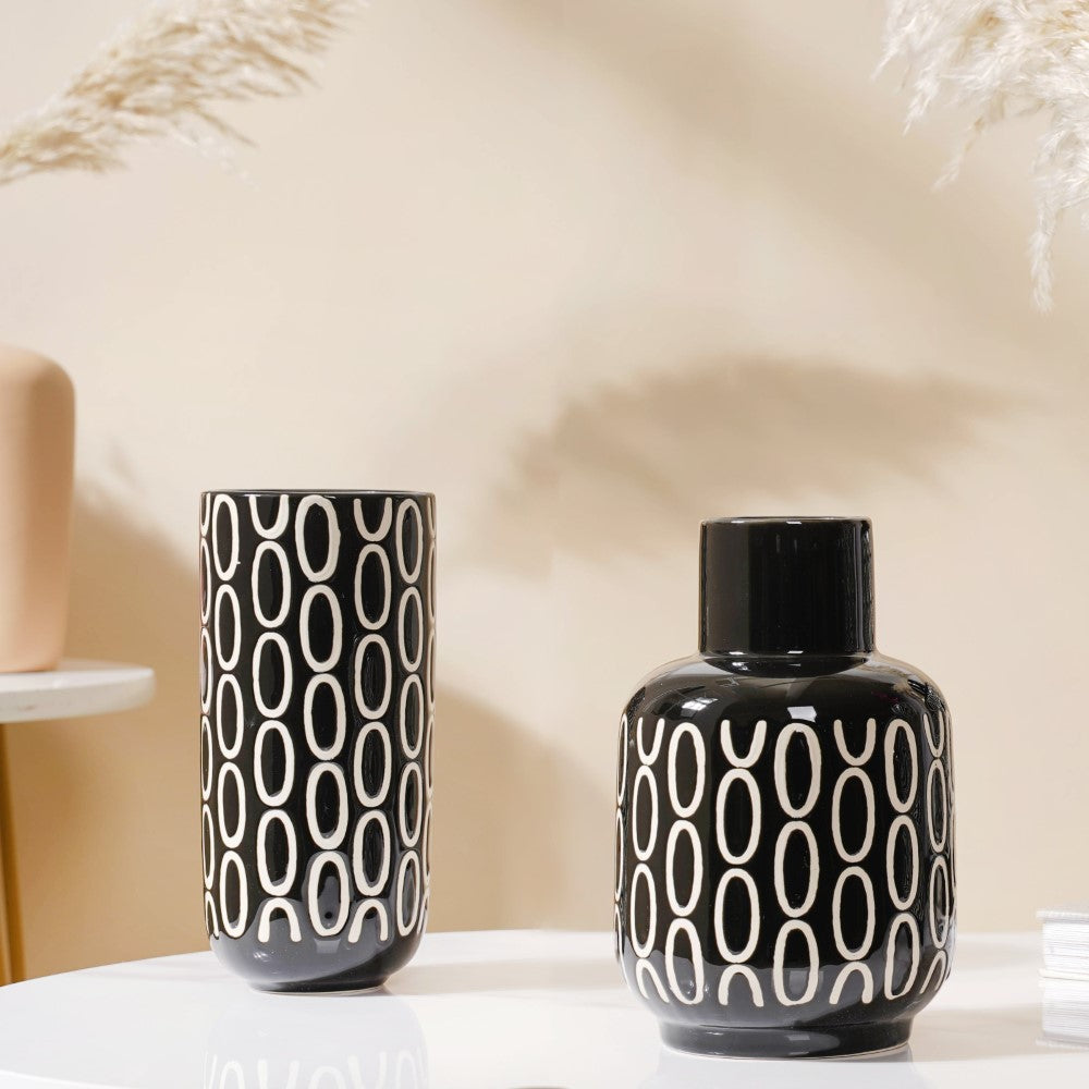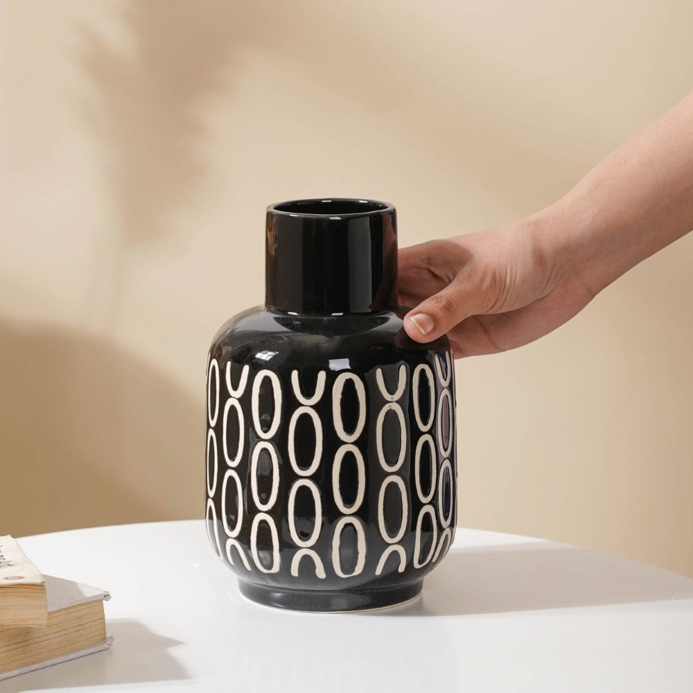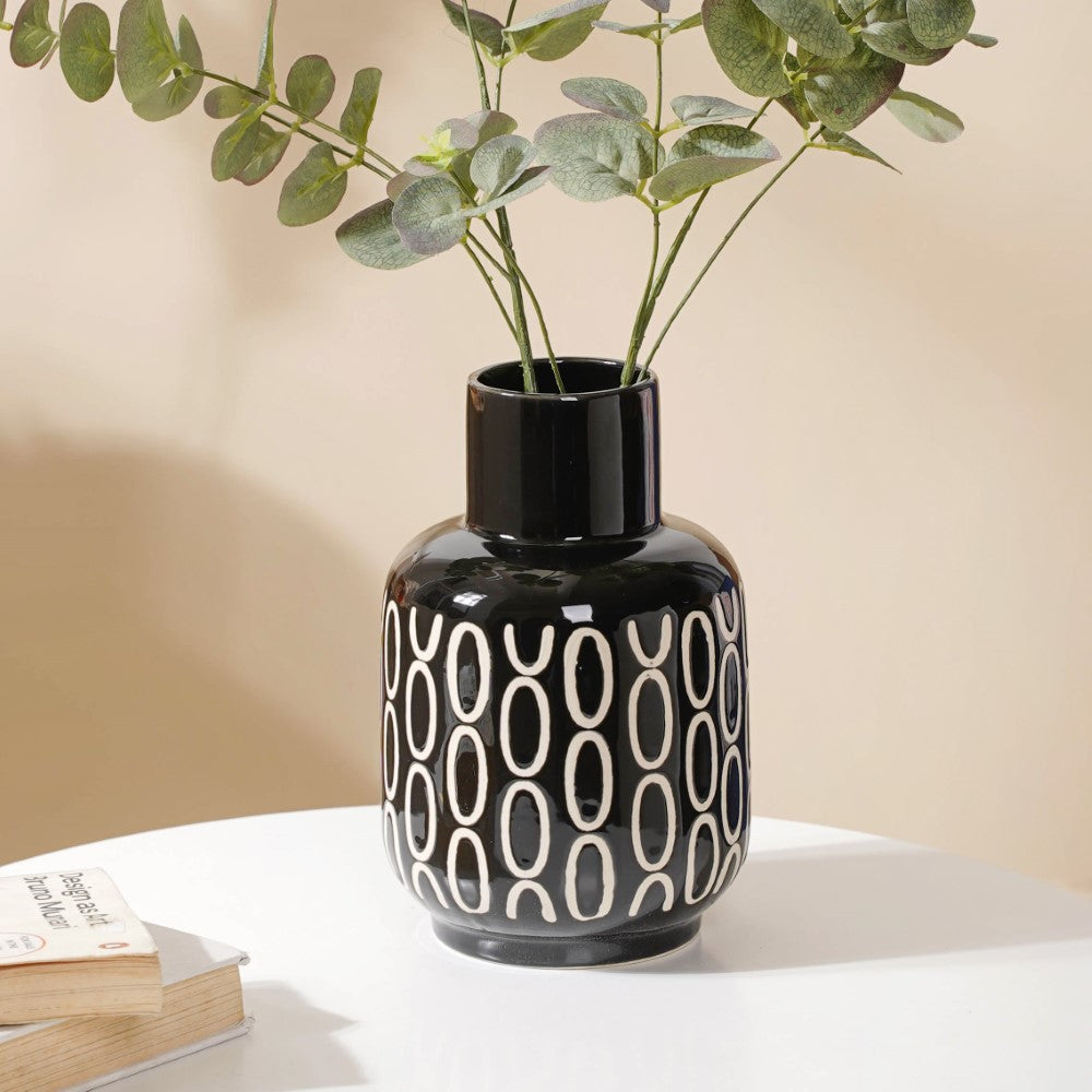 In any modern setting, the grand, elegant ceramic vase is sure to add opulence. The most in-demand trend has always been a magnificent blend of black and white, and that's what exactly is brought by the flower vase. Its artistry consists of a chic black mosaic body with white circular motifs. Nestip: Use it as a drawing room or living room decor. Size: 3.5" B x 2.5" D (top) x 8.2" H Color: Black and white Material: Ceramic Products included: 1 black room decor vase Style: XNYC69V17