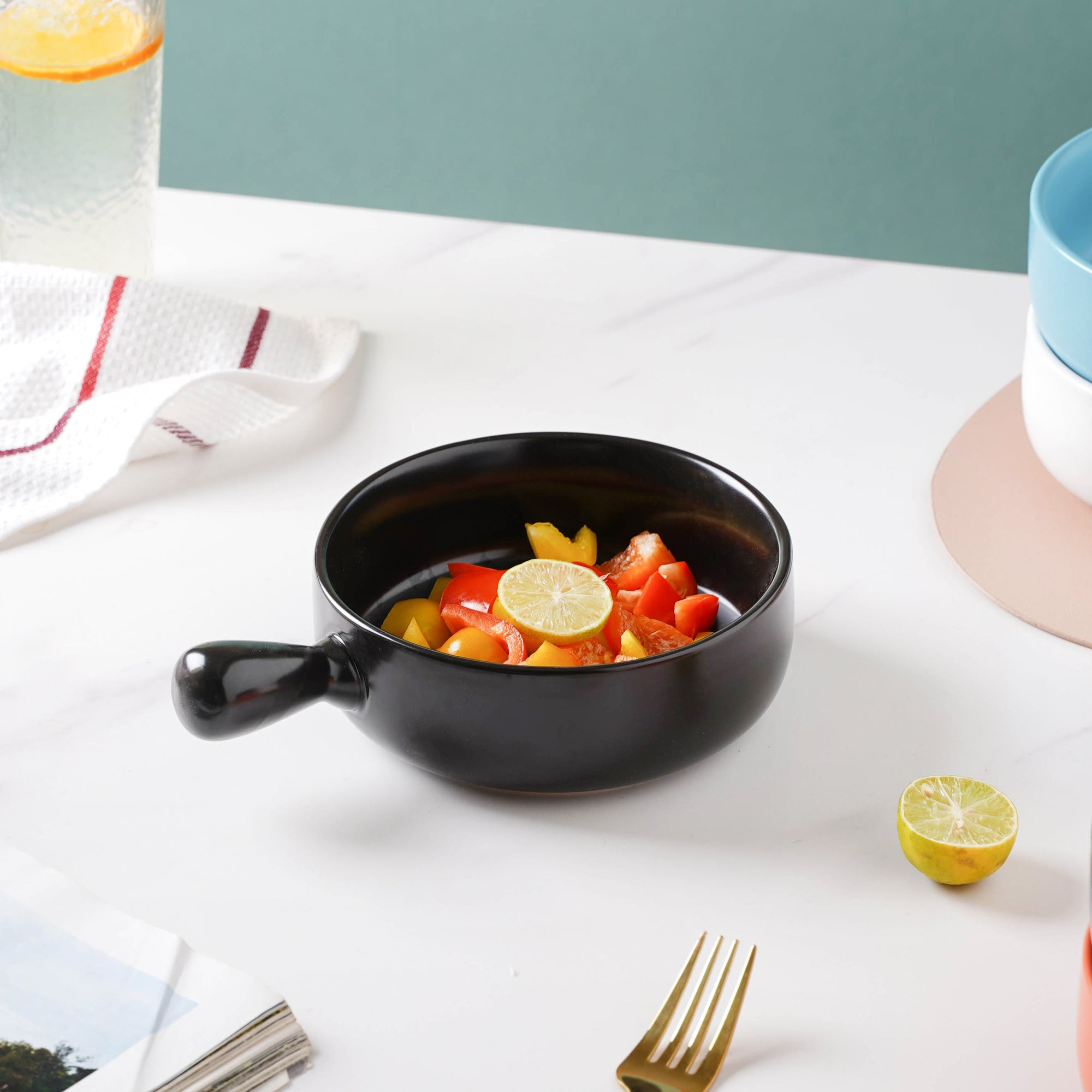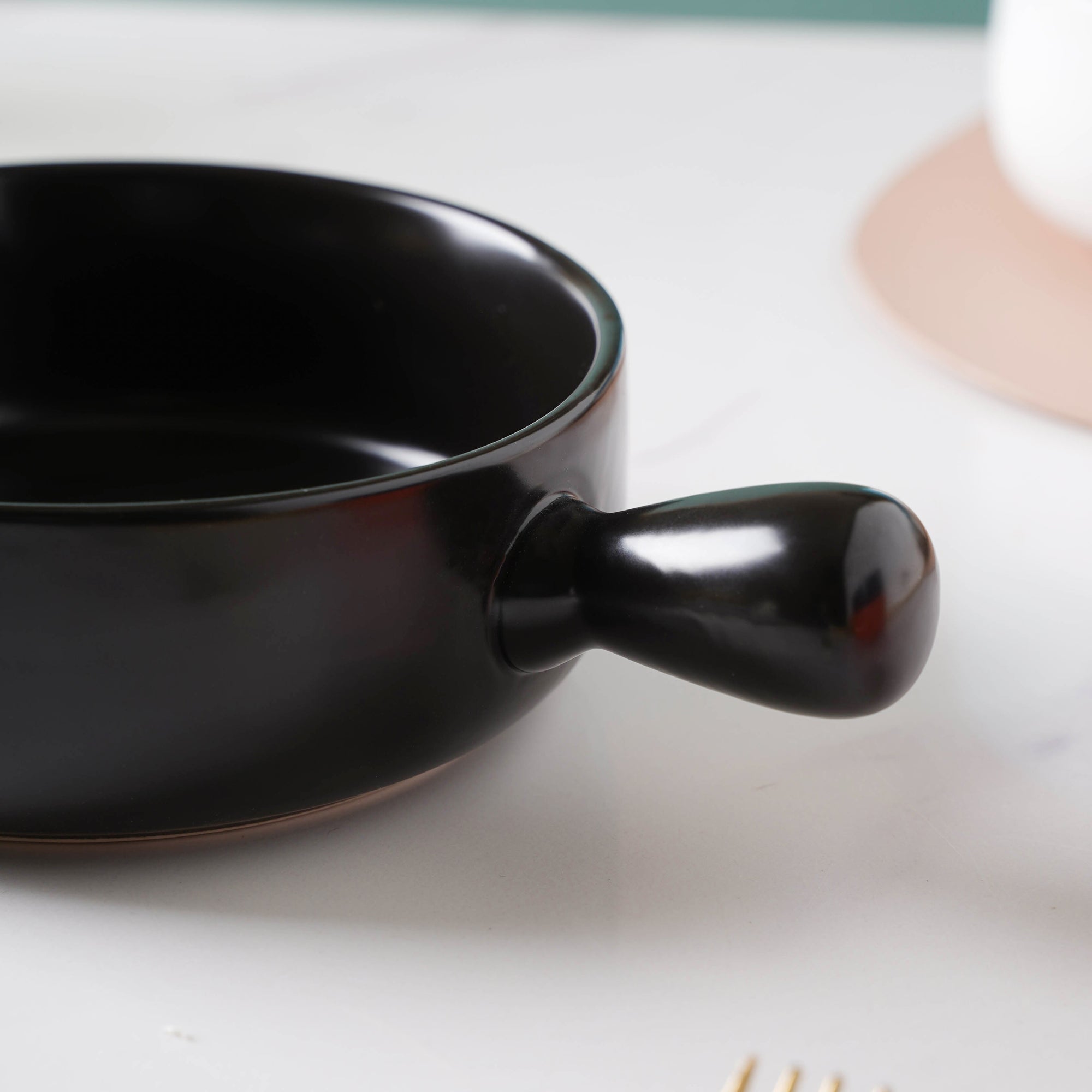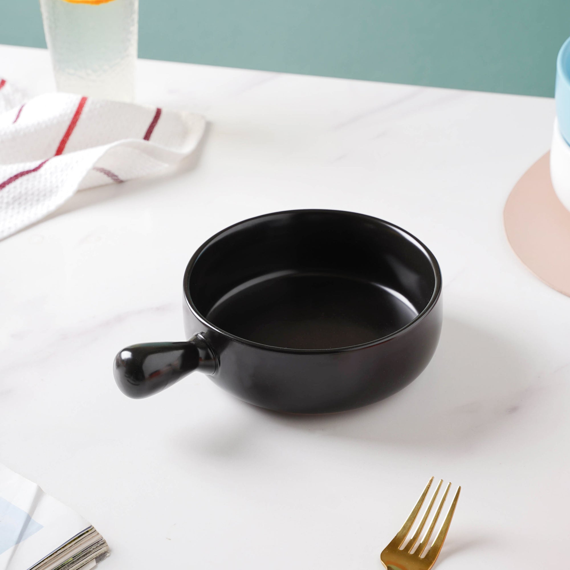 Add a bit of classy touch to the dining decor with the ceramic black pan with handle. The glazed ceramic bakeware is ideal for cooking porridge, noodles, or soup. The round pan with handle is ideal for serving rice for two people.