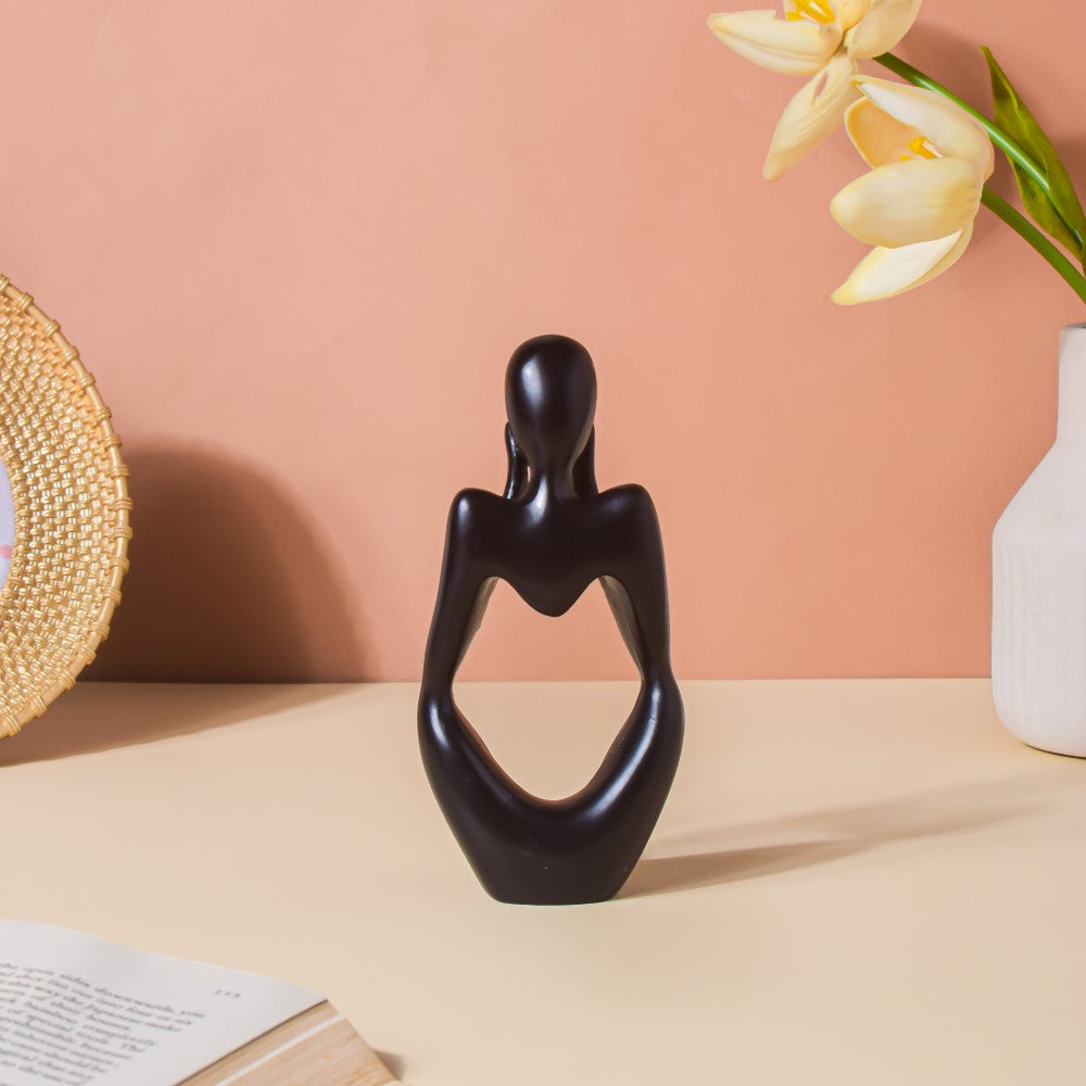 The black resin thoughtful showpiece can be a captivating centerpiece for a coffee table, shelf, or mantel. It can also be strategically placed on a bookshelf, side table, or desk, adding an artistic touch to any space. Consider pairing it with other decorative elements like books, candles, or plants to create a visually pleasing and harmonious arrangement.