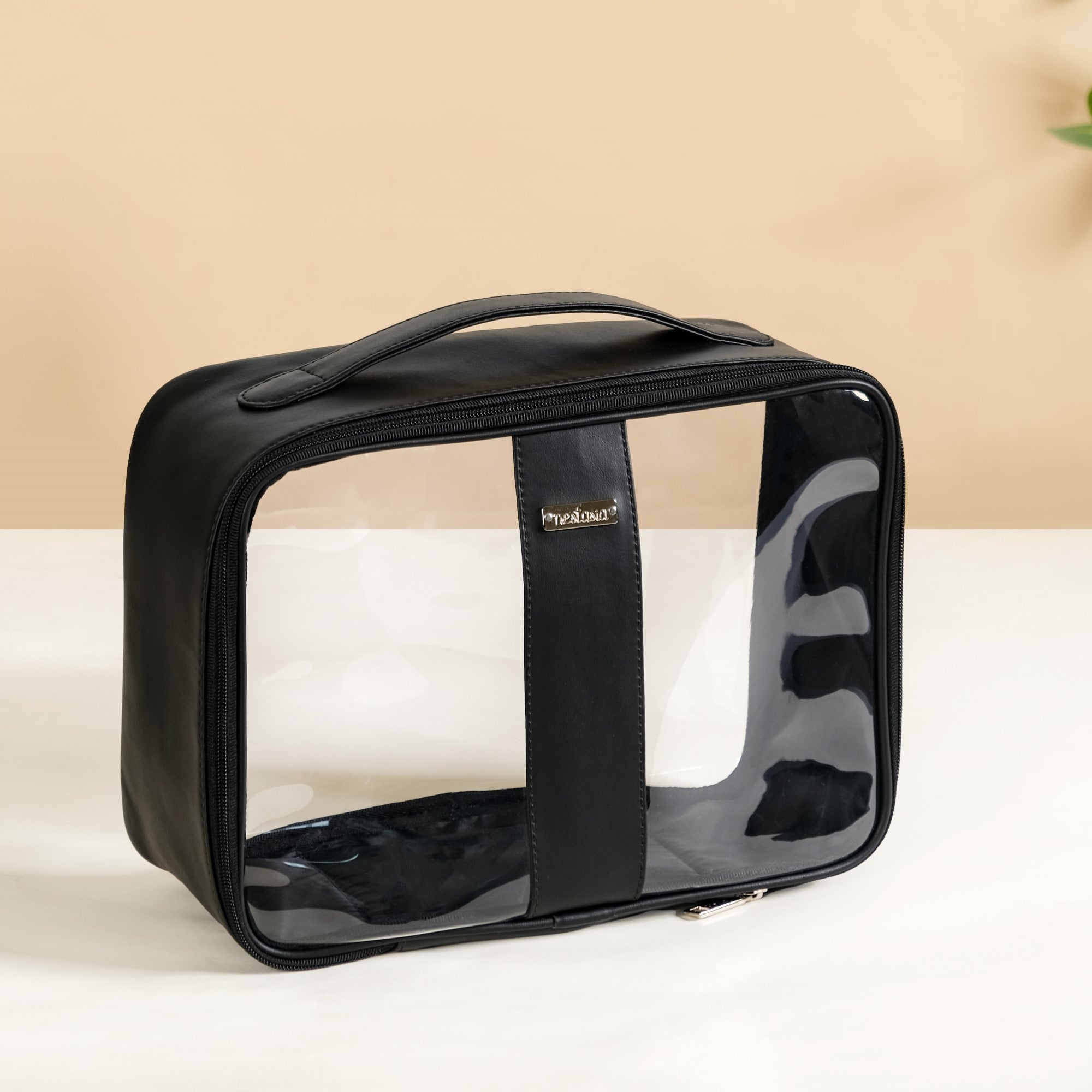 Black Vegan Leather Transparent Travel Kit Set Of 3