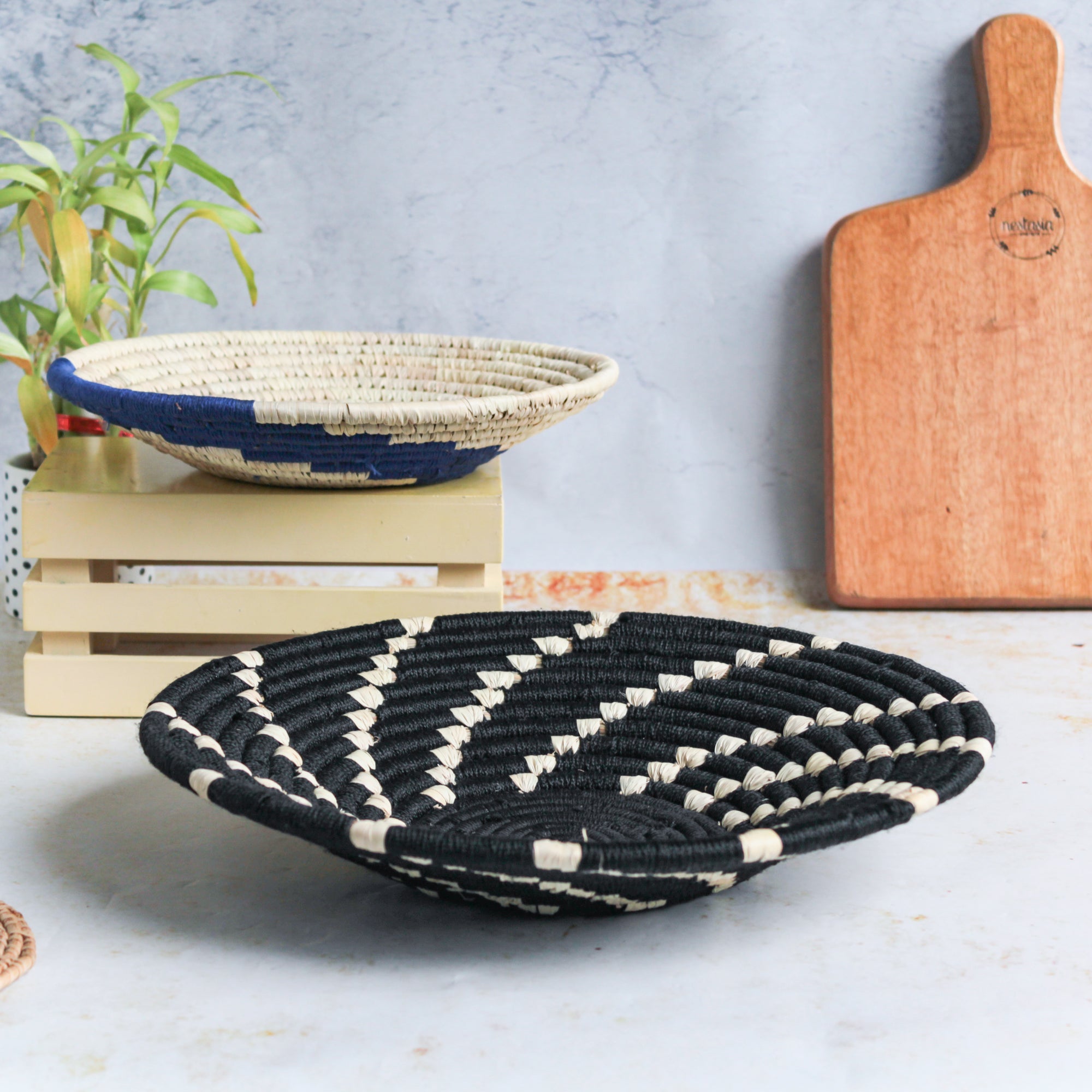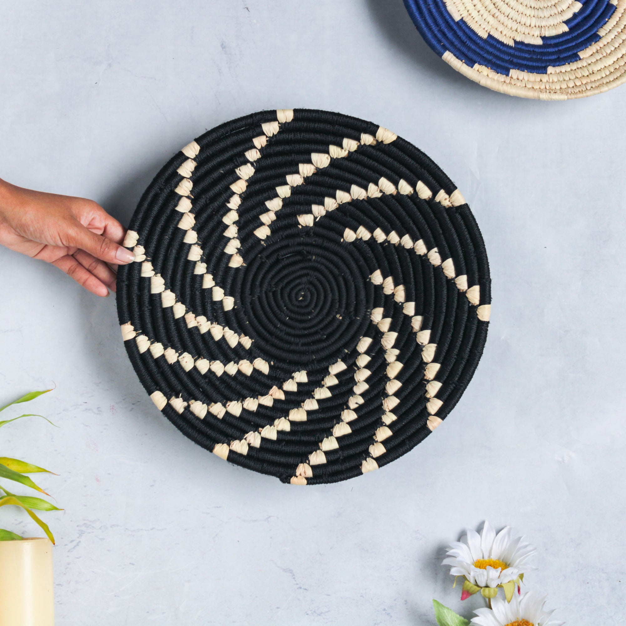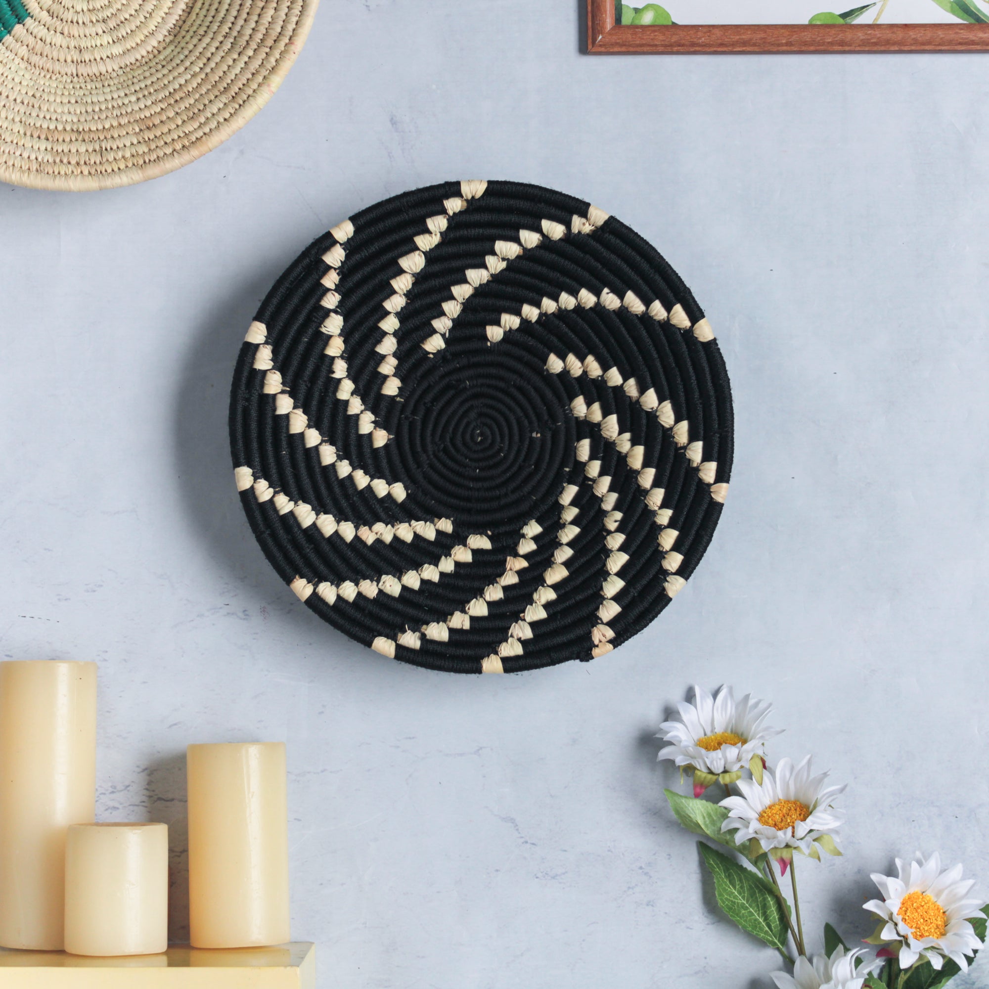 Exquisite sabai grass basket specially handwoven by local artisans with a blend of dried sabai grass, date palm leaves and silky black nylon thread. The unique item made of plant fibre is eco friendly and sustainable, not to mention extremely durable and long lasting. The unique radial swirl pattern woven out of the black nylon thread makes it stand out in any decor setting. The black thread and the natural dried grass color works beautifully together to create an exquisite and unique wall art.