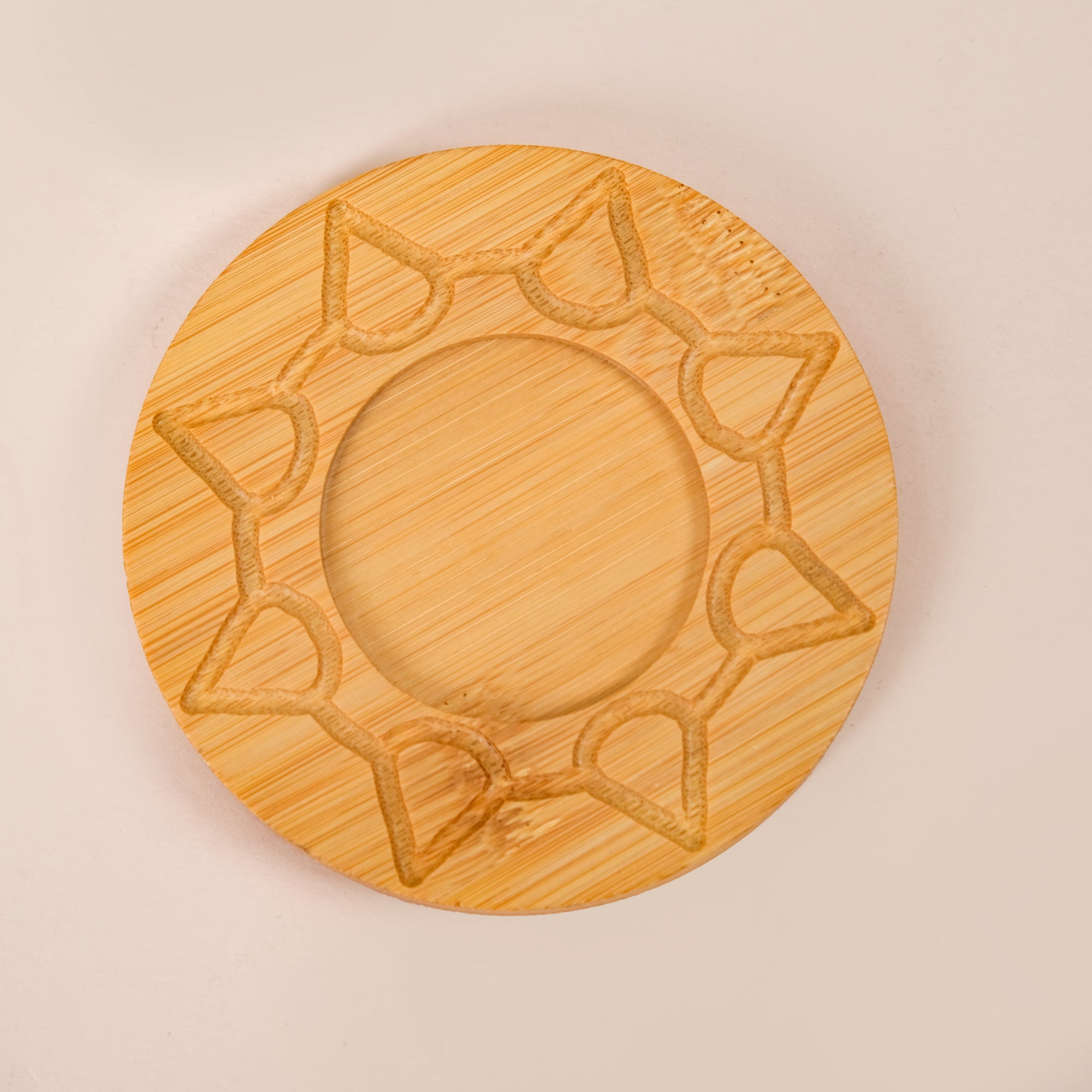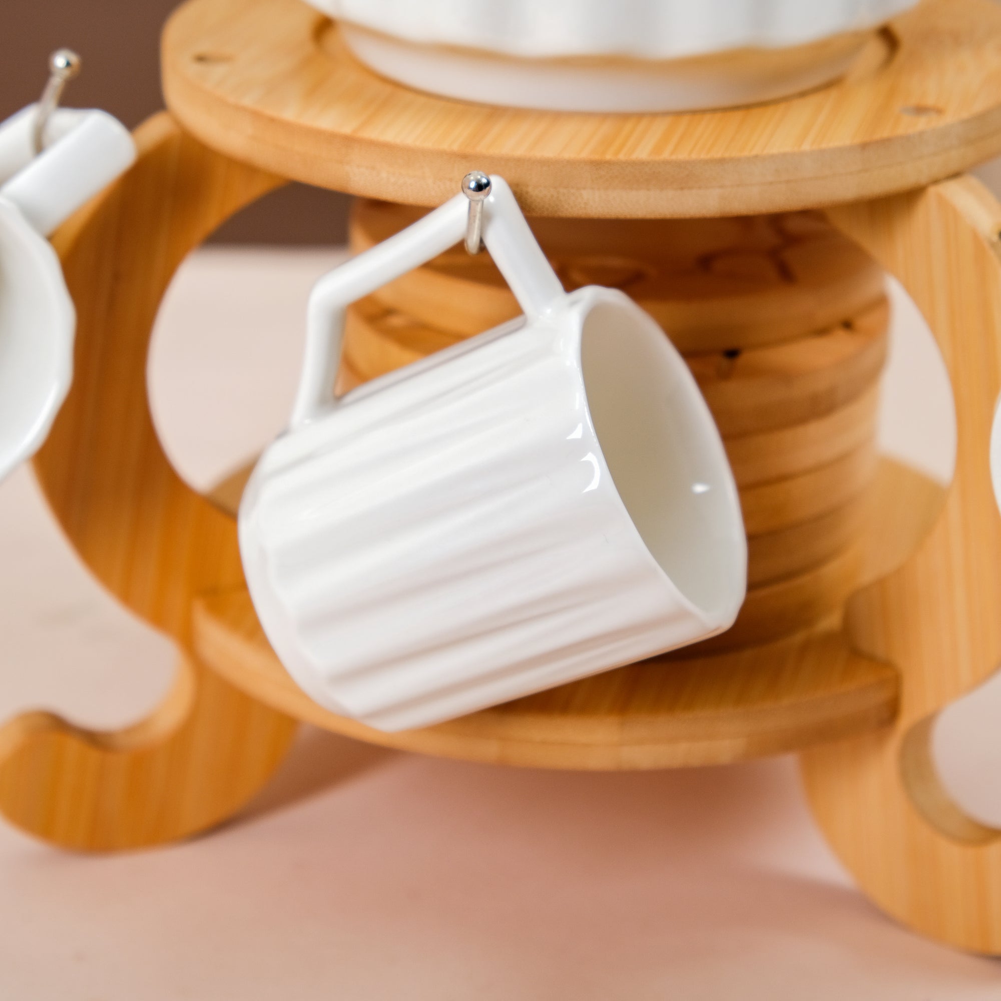 Design: The tea set showcases a refined fluted texture, adding sophistication to each piece. Ergonomically designed handles on both the ceramic cups and kettle ensure a comfortable grip, while the kettle features a top lid and easy-pour nozzle for effortless serving. The wooden coasters are adorned with an engraved design that enhances the overall aesthetic, making this set a striking centrepiece for any table. The two-tier wooden stand provides practical storage, with metal hooks to neatly hang the cups; the top tier is designed for the kettle, while the bottom tier is perfect for the coasters.