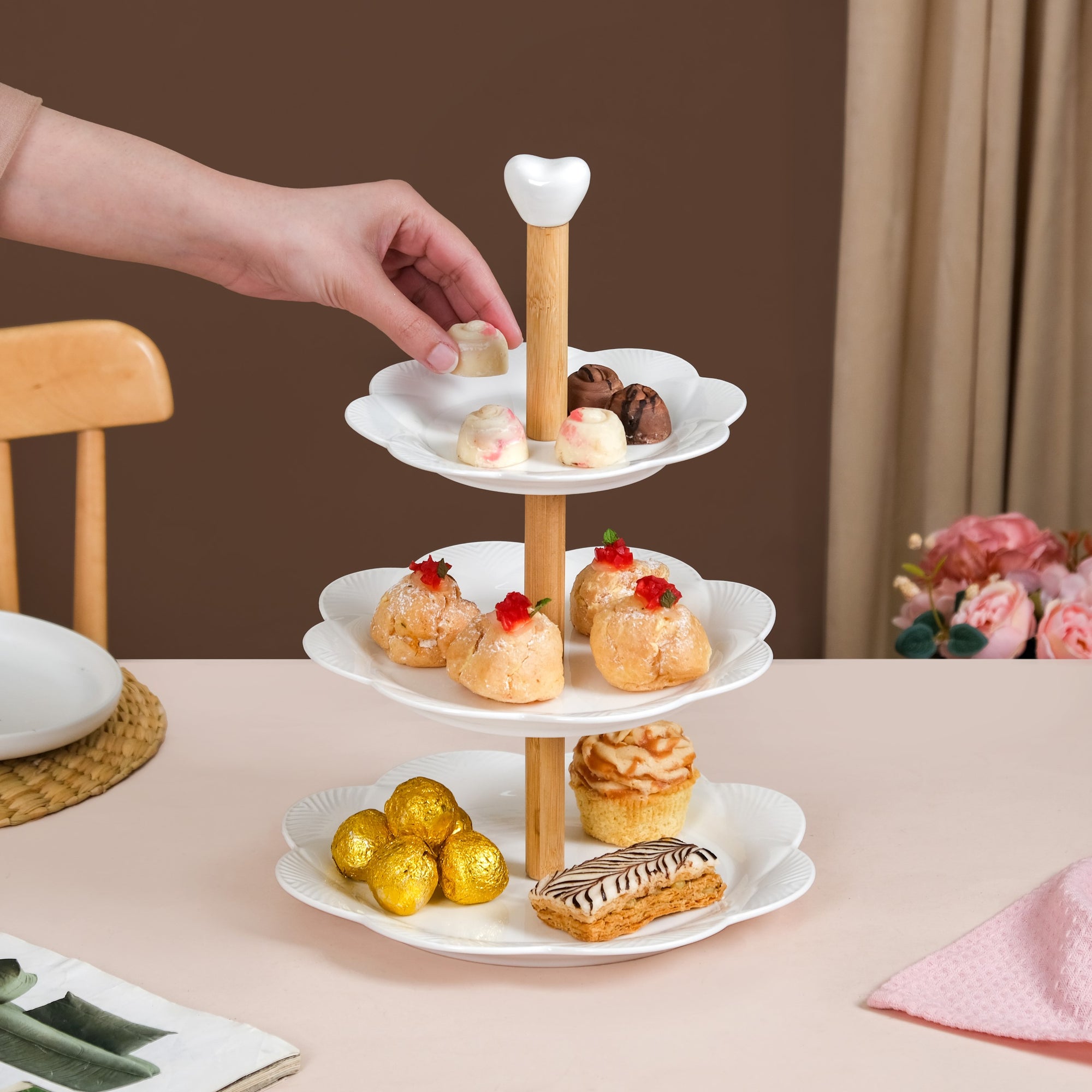 Design: This cake stand features three beautifully crafted ceramic plates in varying sizes, each adorned with a charming flower shape and a textured petal design. The wooden centre stand provides sturdy support, while the easy-grip ceramic top handle makes it effortless to transport your delicious creations.