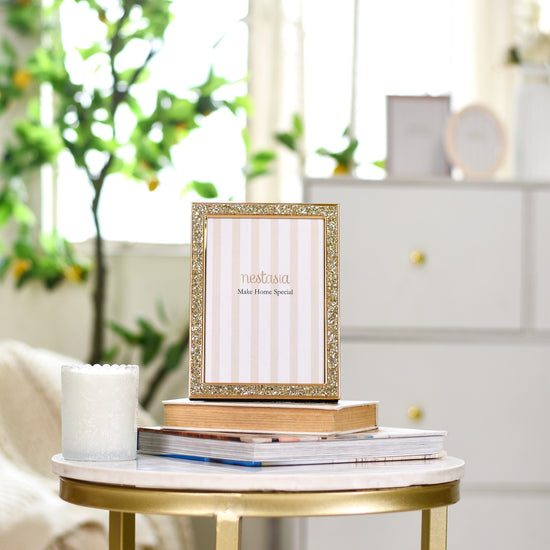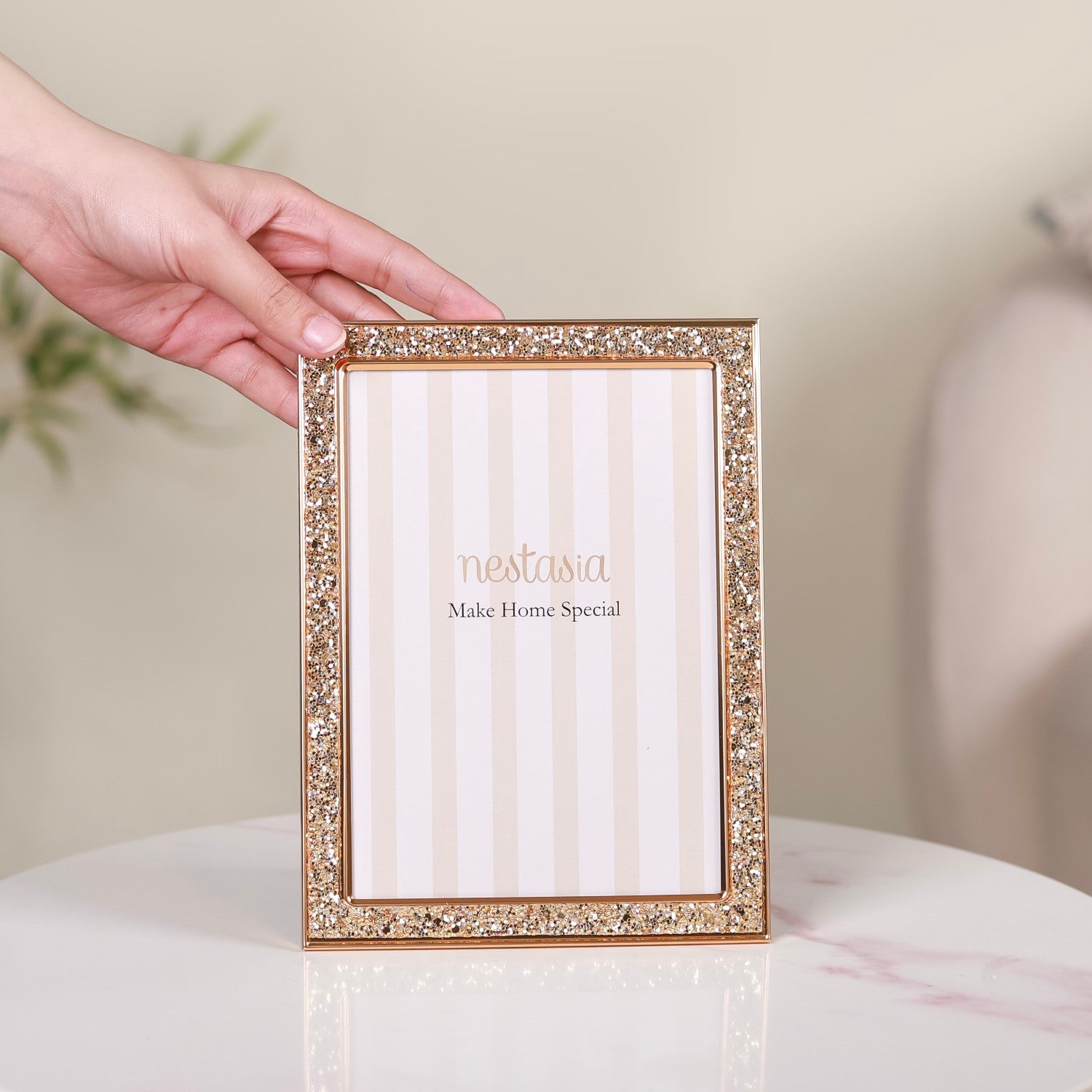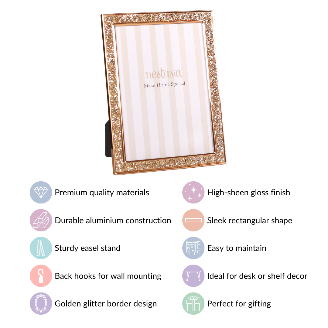 The stunning photo frame blends elegance and utility seamlessly. Elevate your cherished memories with this frame, meticulously crafted from the finest quality acrylic and durable aluminium. Its sturdy back stand provides a secure base for tabletop display, while the golden glitter design adds a touch of glamour to your photos. The high-sheen gloss finish enhances its overall radiance, making your memories truly shine. With its sleek rectangular shape, this frame seamlessly integrates into various interior styles. Easy to maintain, it's not only a stunning addition to your own space but also an impeccable gifting choice.