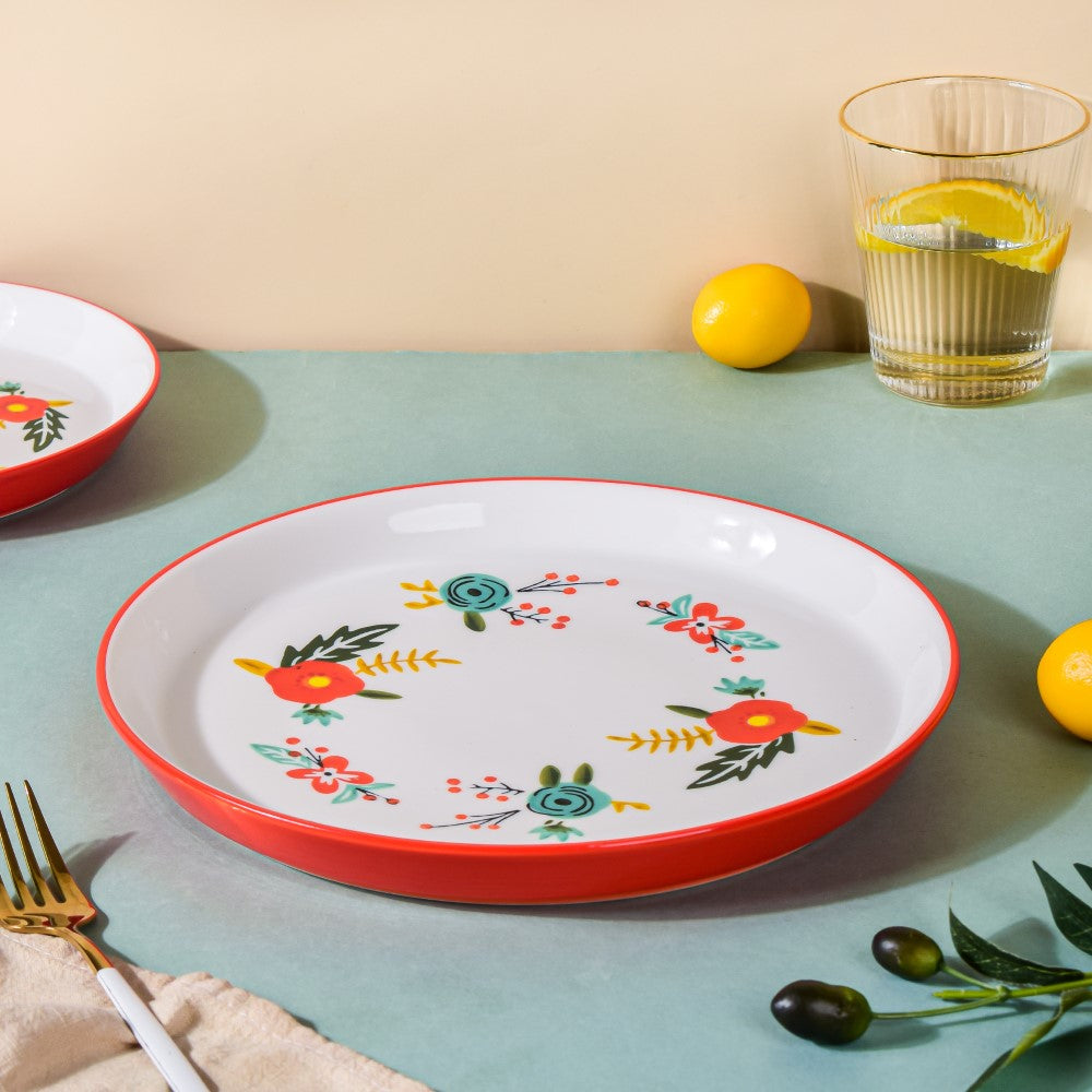 The stunning dinner plate is crafted from high-quality ceramic, with a vibrant red exterior that adds a touch of boldness and elegance to any dining occasion. The interior of the plate features a beautiful flower pattern, which is delicately painted onto a clean, white surface. The combination of the bold red exterior and the intricate floral design of the interior makes this plate both eye-catching and timeless.