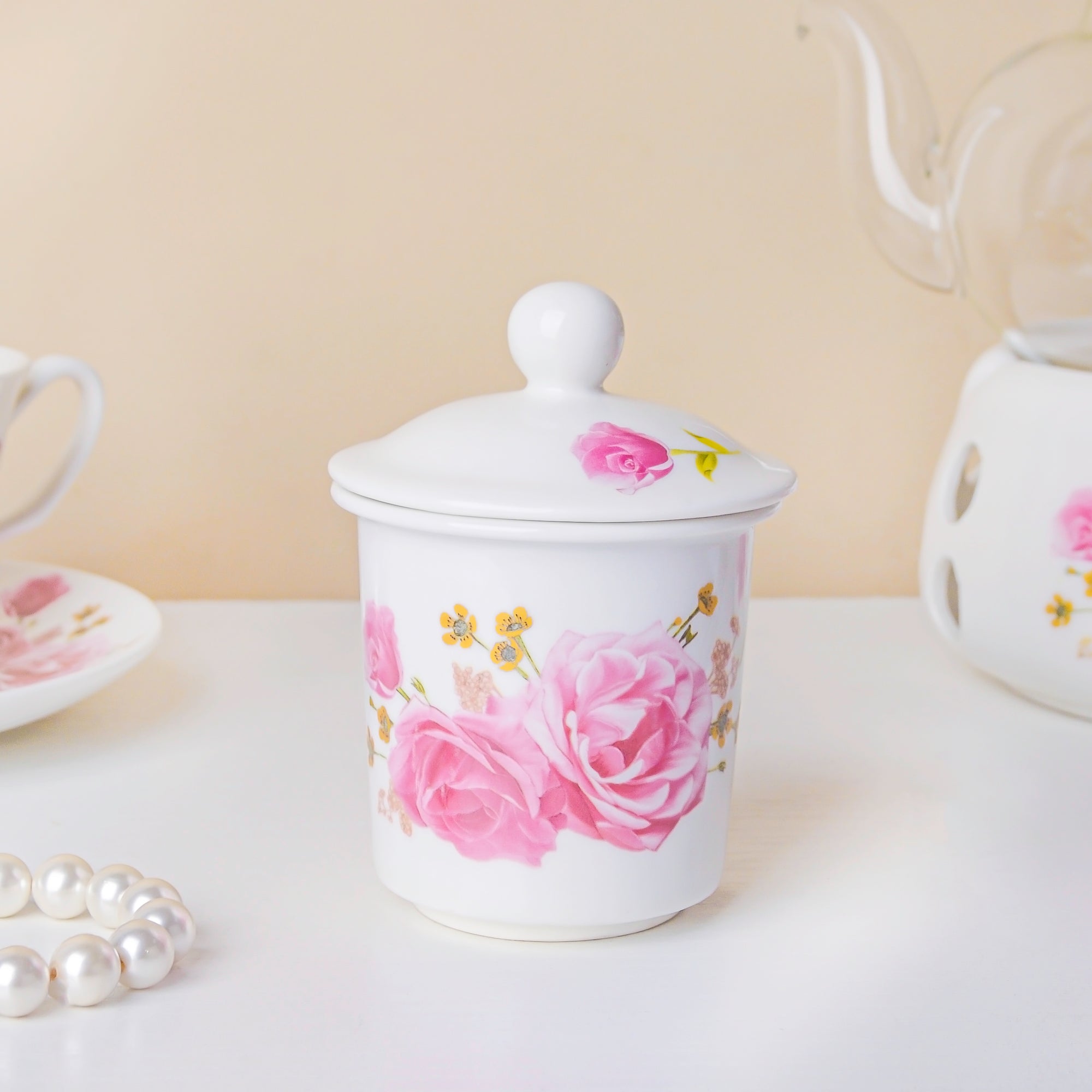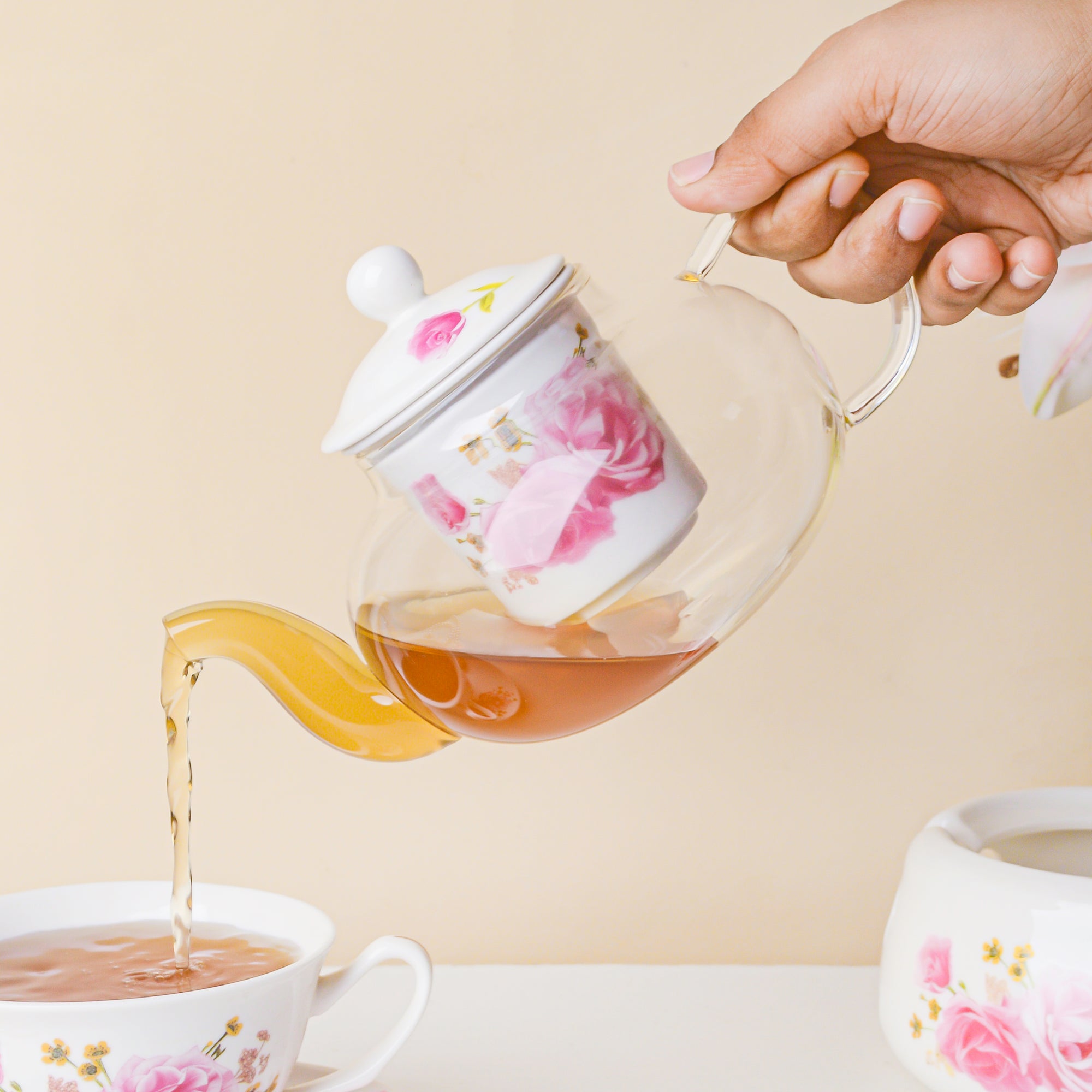 The decorous glass teapot comes with a ceramic tea warmer and an infuser with a lid. The glass kettle's c-shaped handle aids in the easy pouring of beverages while serving. The surface of the ceramic infuser and the tea warmer, which lies at the base of the transparent teapot, are decorated with vibrant pink flower designs. The ceramic warmer where a tea light can be added helps to keep the tea warm for a longer period of time. In the glass teapot, brew tea leaves or coffee and offer it hot to visitors at family gatherings and social events.