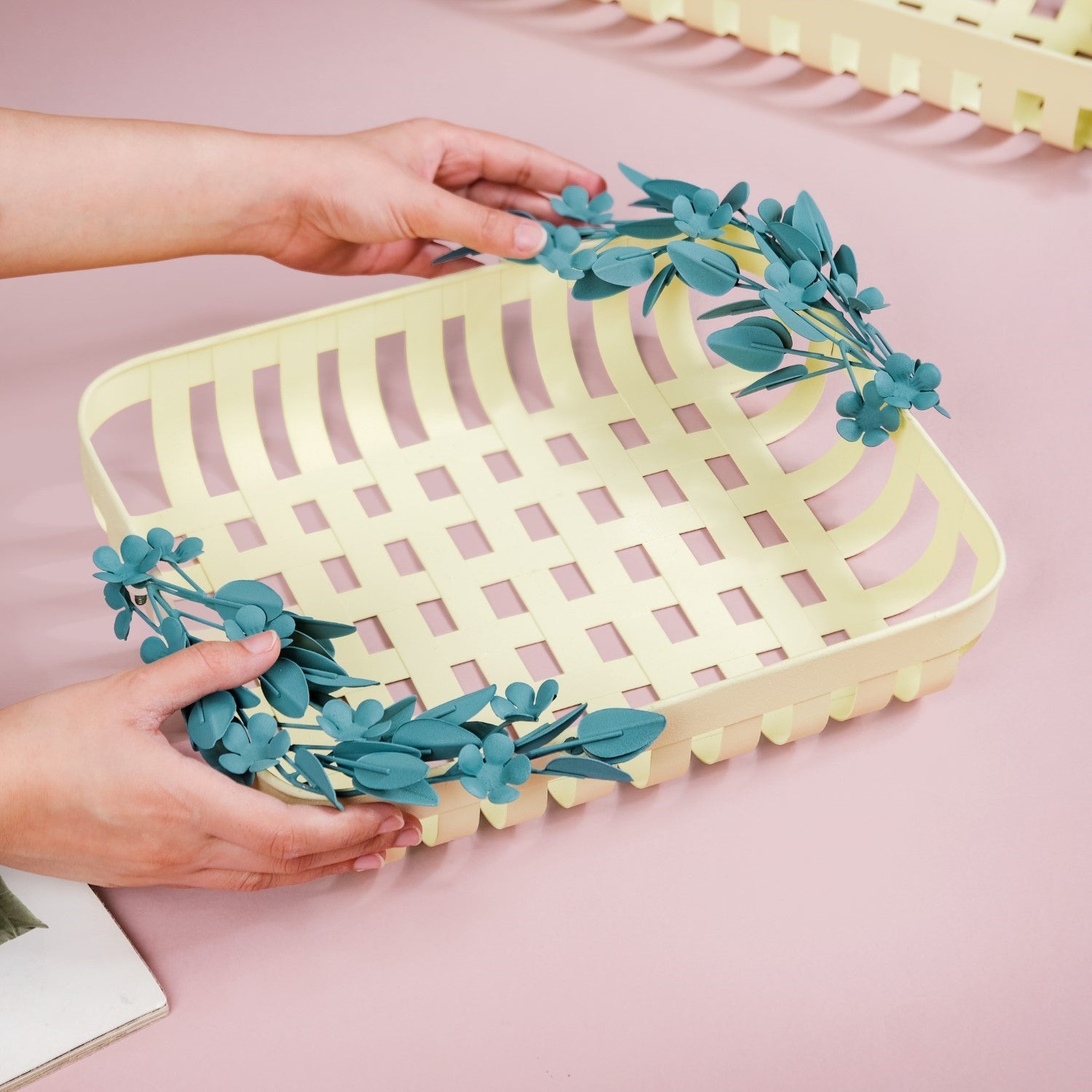 Yes, the metal decorative basket can be paired with other decorative accents such as candles, vases, or trays to create visually appealing vignettes. Experiment with different combinations to enhance the overall aesthetic of your space.